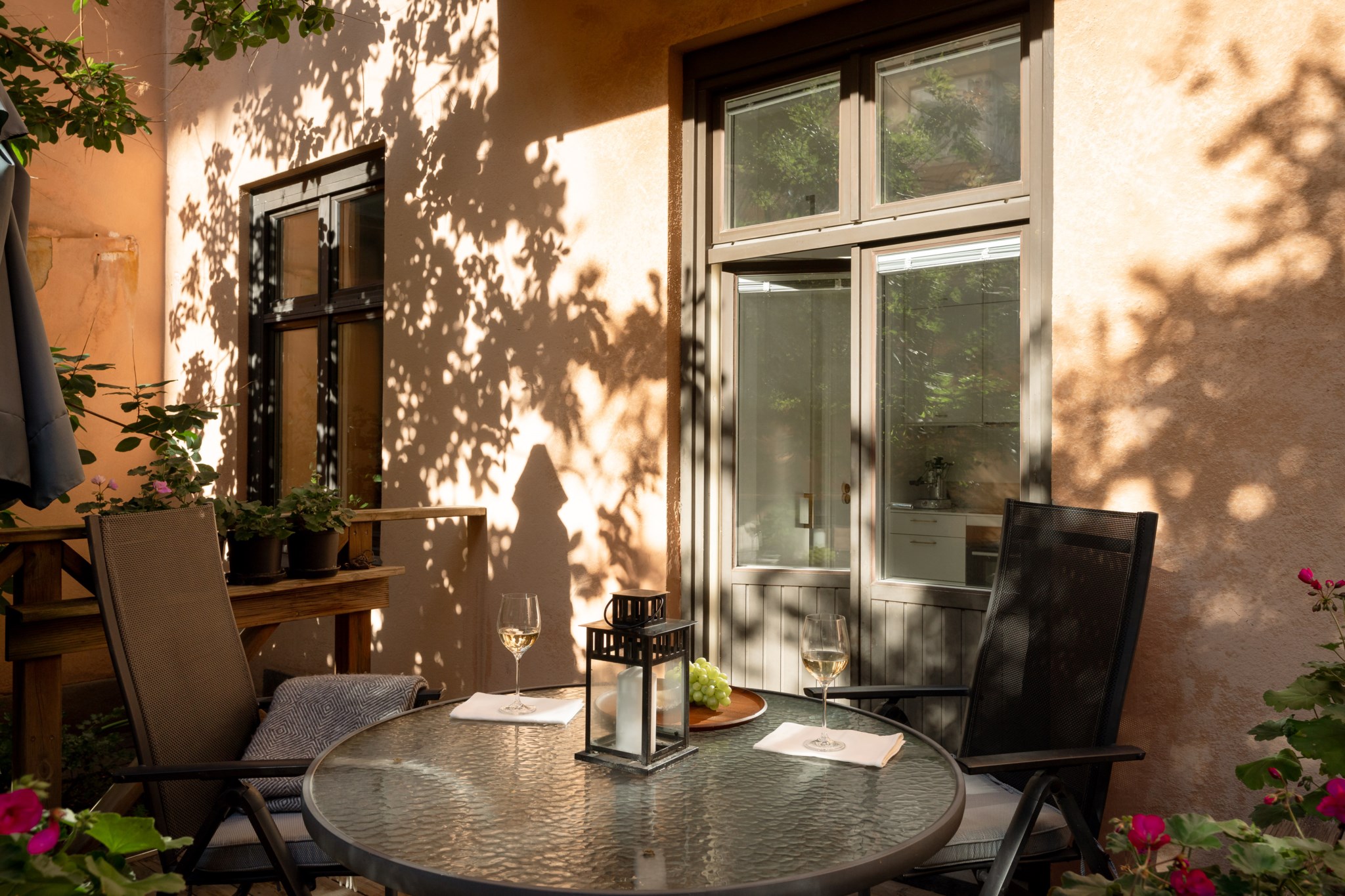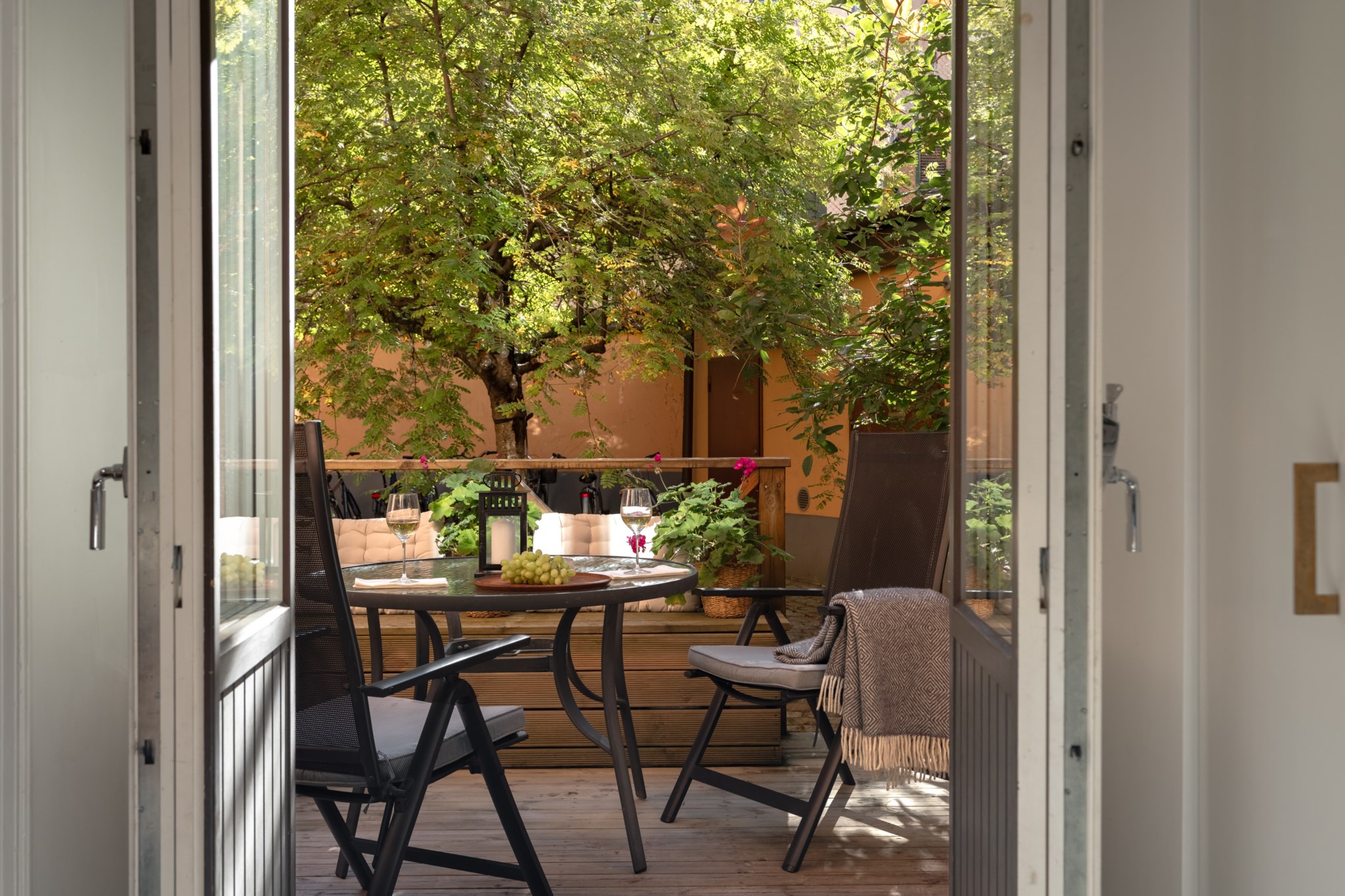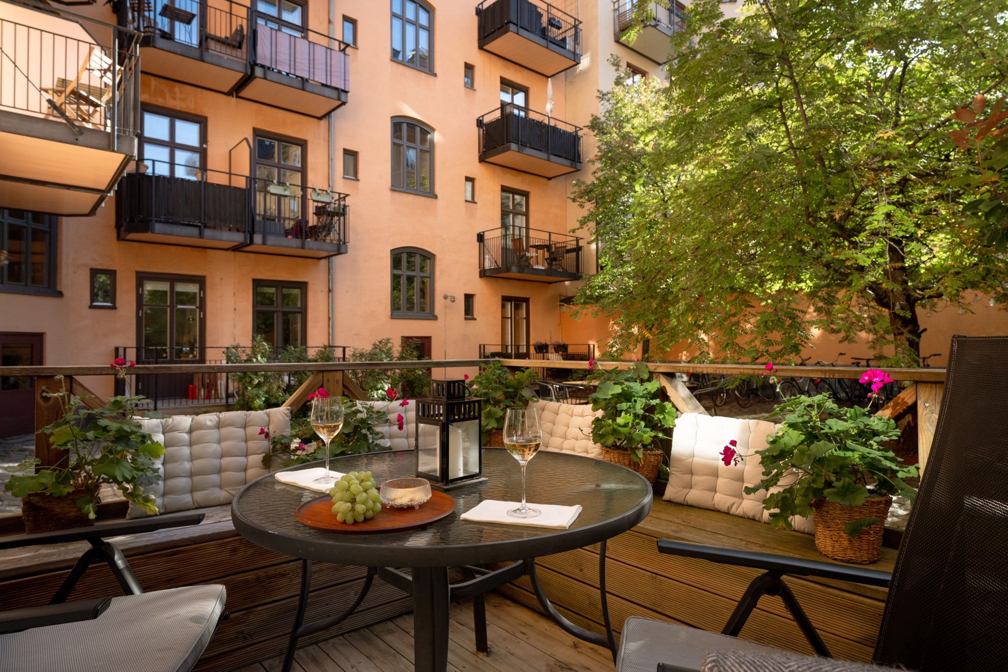 Fantastisk altan om ca 9 kvm, lugnt belägen på bolagets vackra kullerstensgård. Altanen har platsbyggda bänkar med förvaring och sittplats för 6-8 personer. Söderläge med sol från morgon till sen eftermiddag.