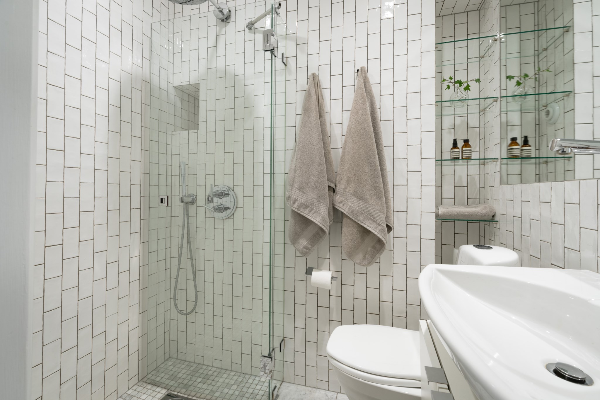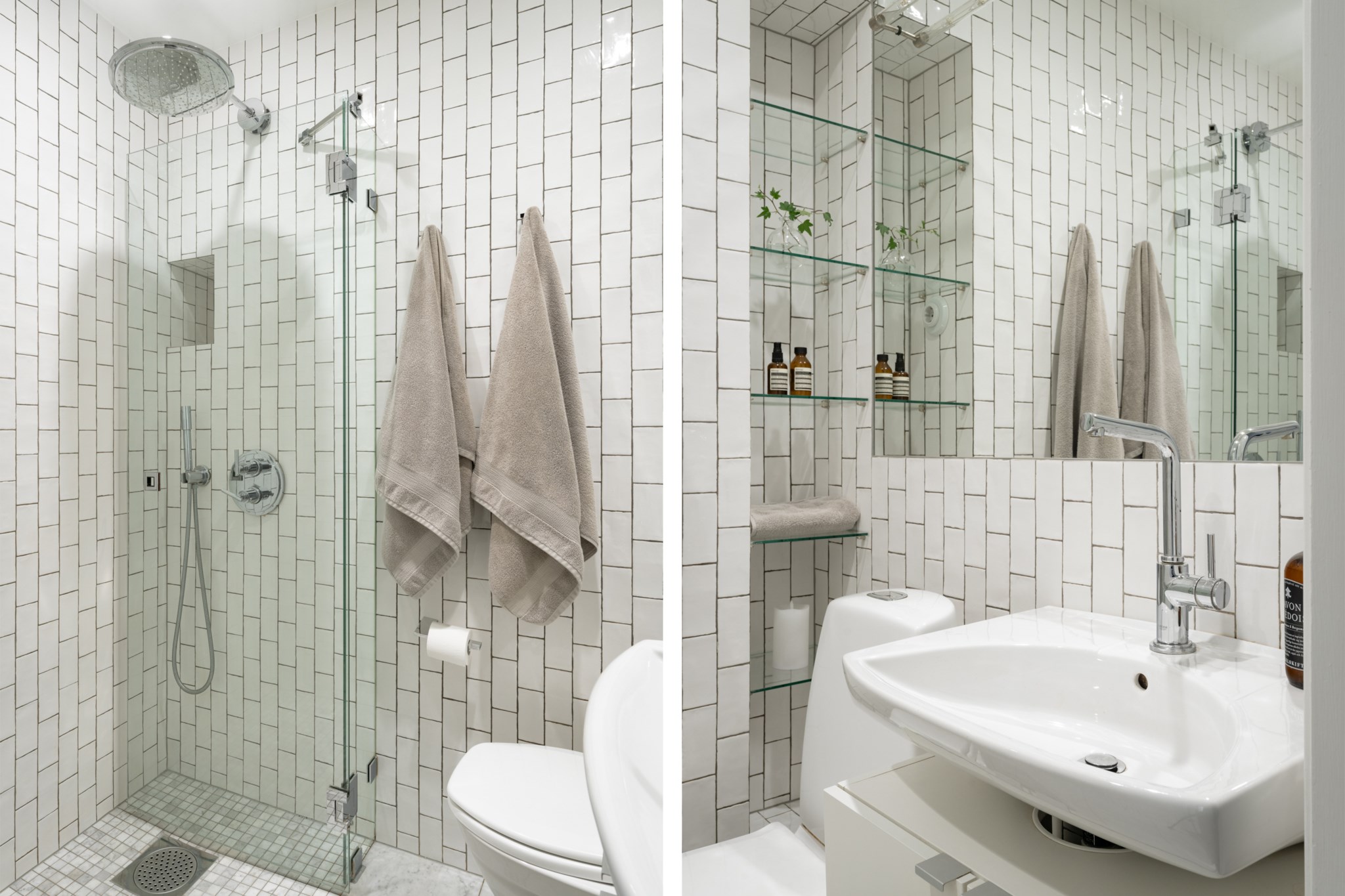 Stilrent badrum med marmorgolv (Carrara) och helkaklade väggar i handgjord karaktär. Päkostat med infällda rör i väg, takdusch samt separat handdusch, vikbar duschvägg i glas, infälld spegel i väg med belysningsarmatur samt strömbrytare och elluttag i porslin. Väggnisch med glashyllor som ger bra förvaring. Infällda spotlights med dimmer.