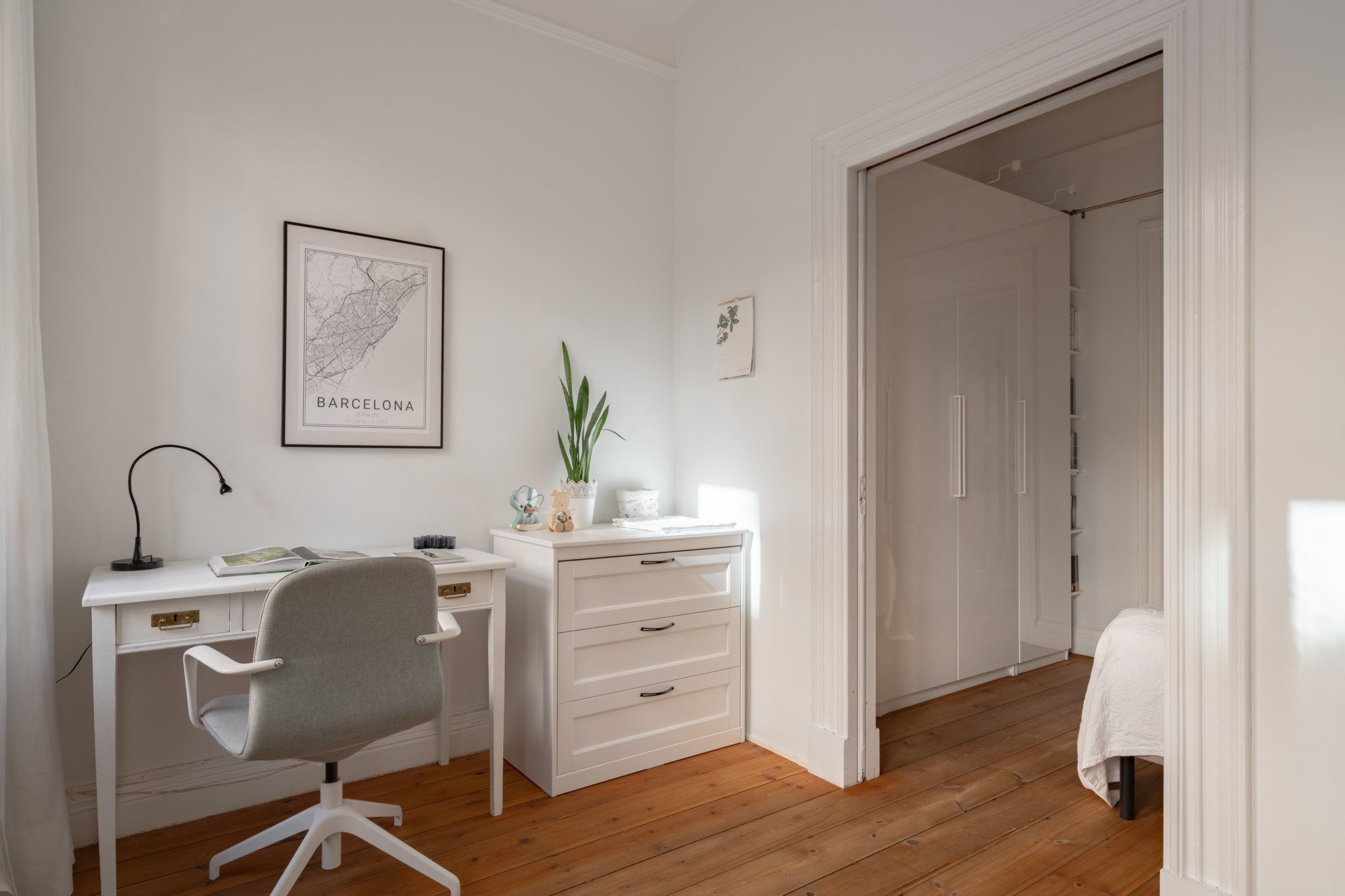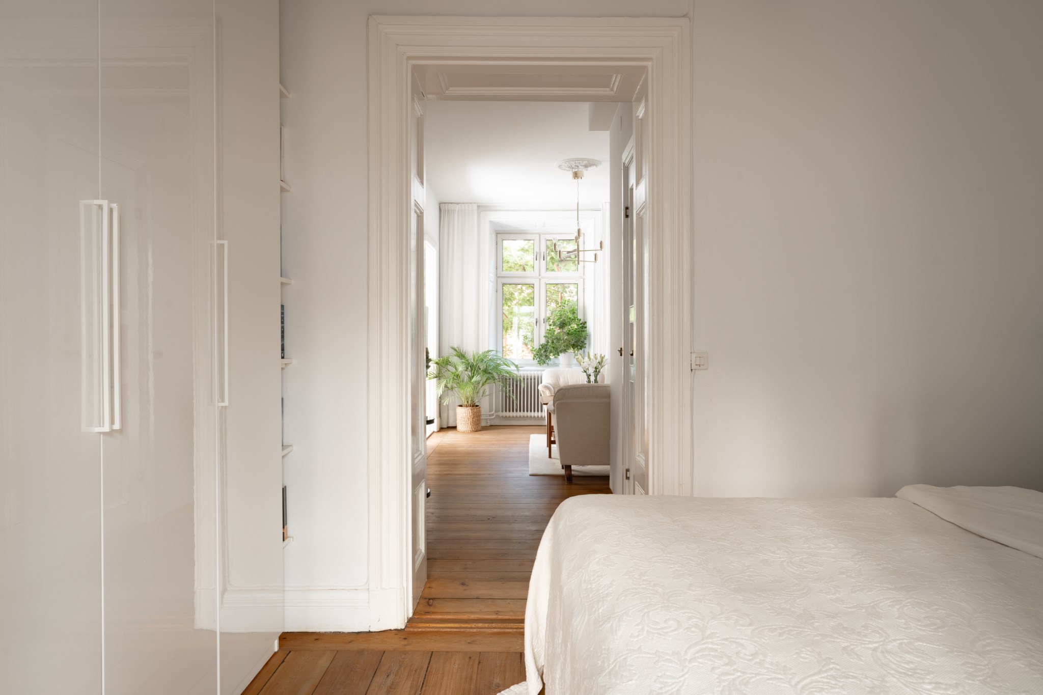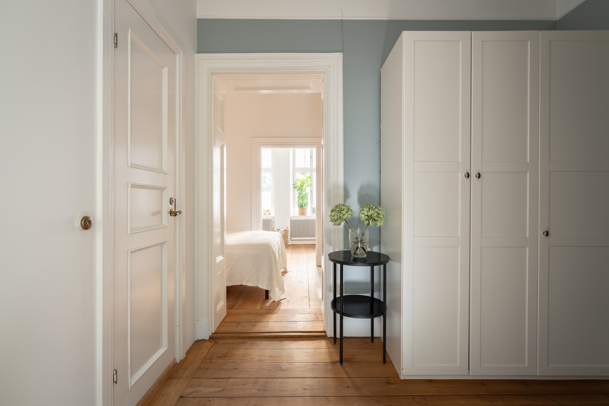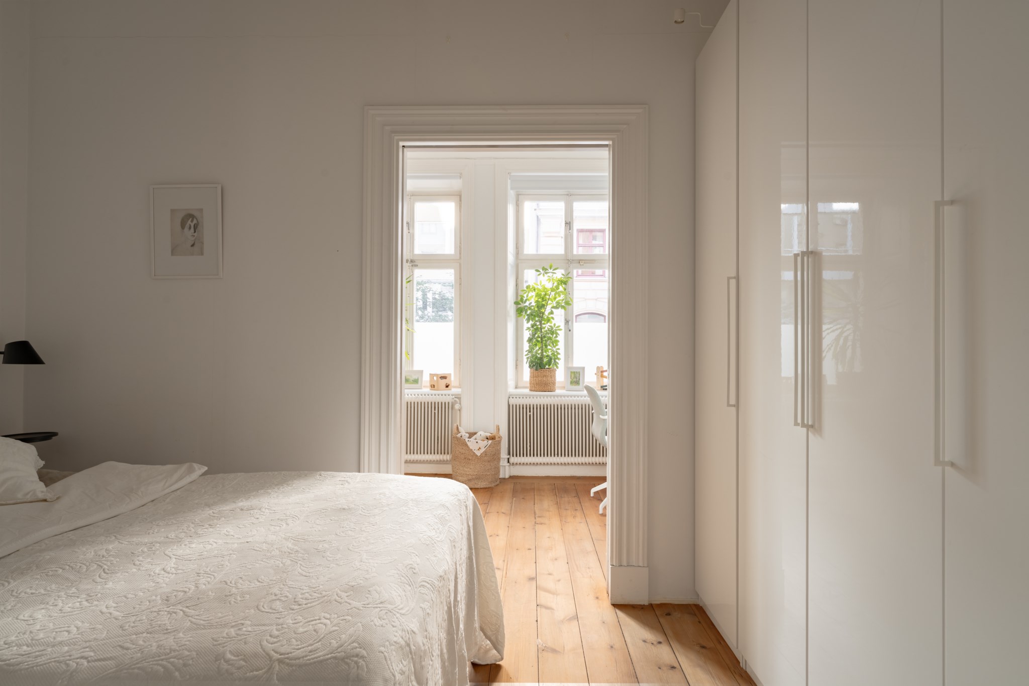 Sovrum med breda plank och målade väggar. Idag disponeras rummet som två rum med en skiljevägg och skjutdörrar. Utmärkt för den som vil ha två sovrum alternativt ett arbetsrum. Got om förvaringsutrymmen i en garderobsväg med vita luckor och belysning samt et fint ljusinsläpp från två fönster med djupa, speglade fönsternischer. Fin detalj med flertalet rosetter i tak.