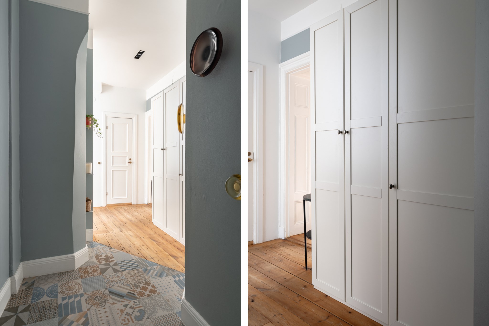 Välkomnande hall med klinkergolv av designer Patricia Urquiola samt målade väggar i smakfull kulör. Belysning infälld i taket med justerbara spotlights. Gott om plats för avhängning och mindre möblemang efter önskemål. Hallen övergår till en mindre inre hall med vackert trägolv och målade väggar där det även finns garderober.
