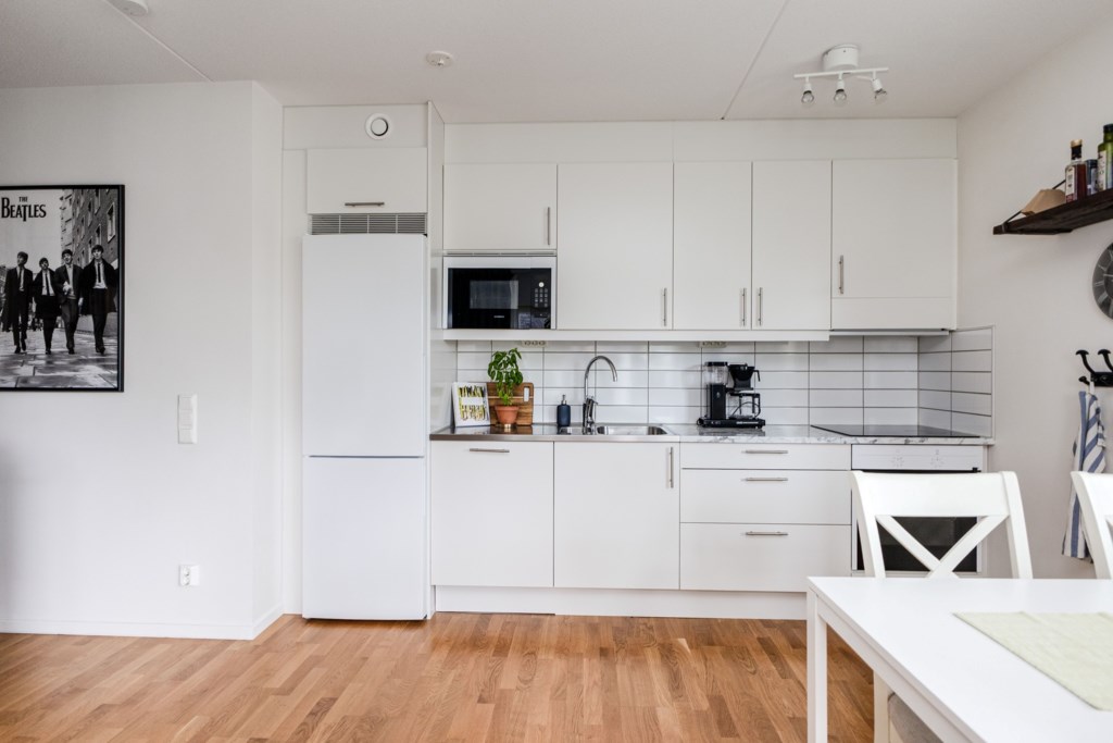 Modernt och lättarbetat kök. Köksskåpen har ljusa stilrena köksluckor som kombineras med ett vitt kakel ovan arbetsyta. Den maskinella utrustningen består av kyl/frys, ugn, spishäll, micro, Siemens, fläkt och diskmaskin. Väggarna är målade i ljus kulör och golvet belagt med parkettgolv.