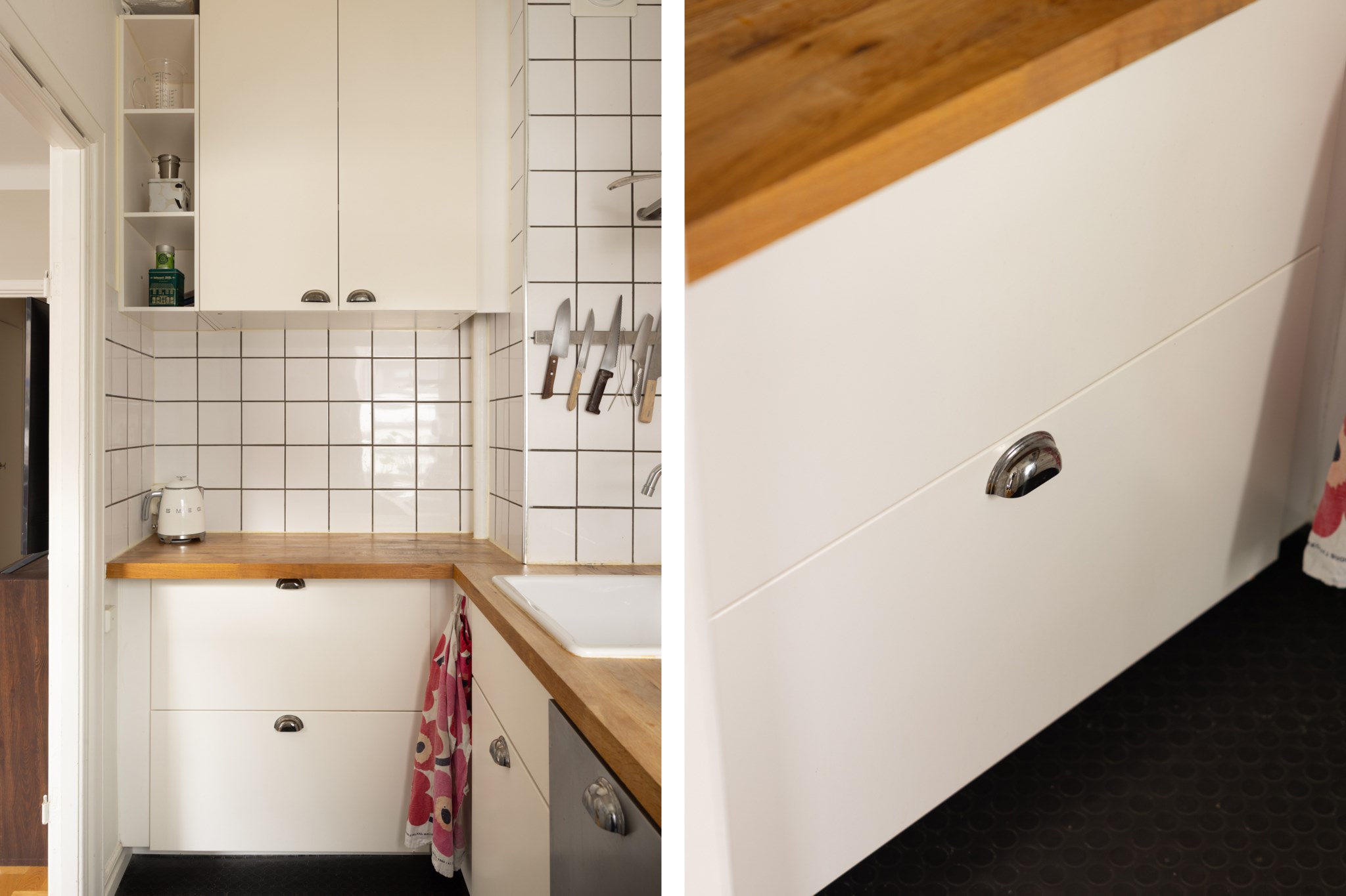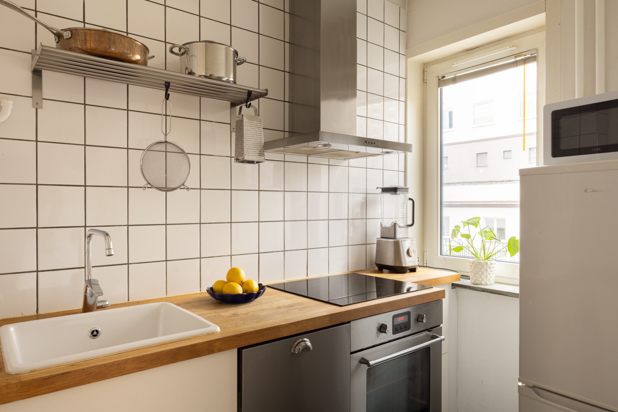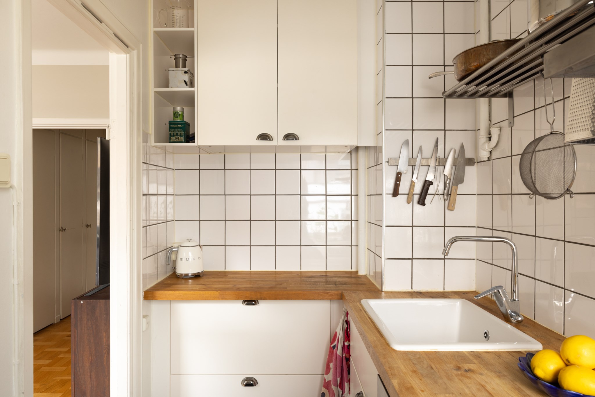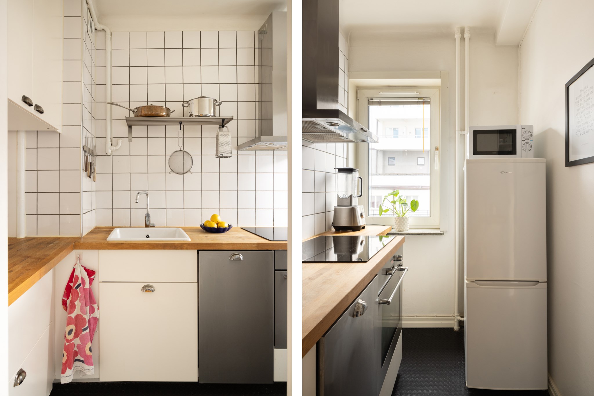 Praktiskt och yteffektivt kök med vitt kakel och en bänkskiva i trä. Här finns kyl/frys, ugn, spishäll och diskmaskin. Förvaring i skåp bakom vita fronter och bra arbetsytor finns.