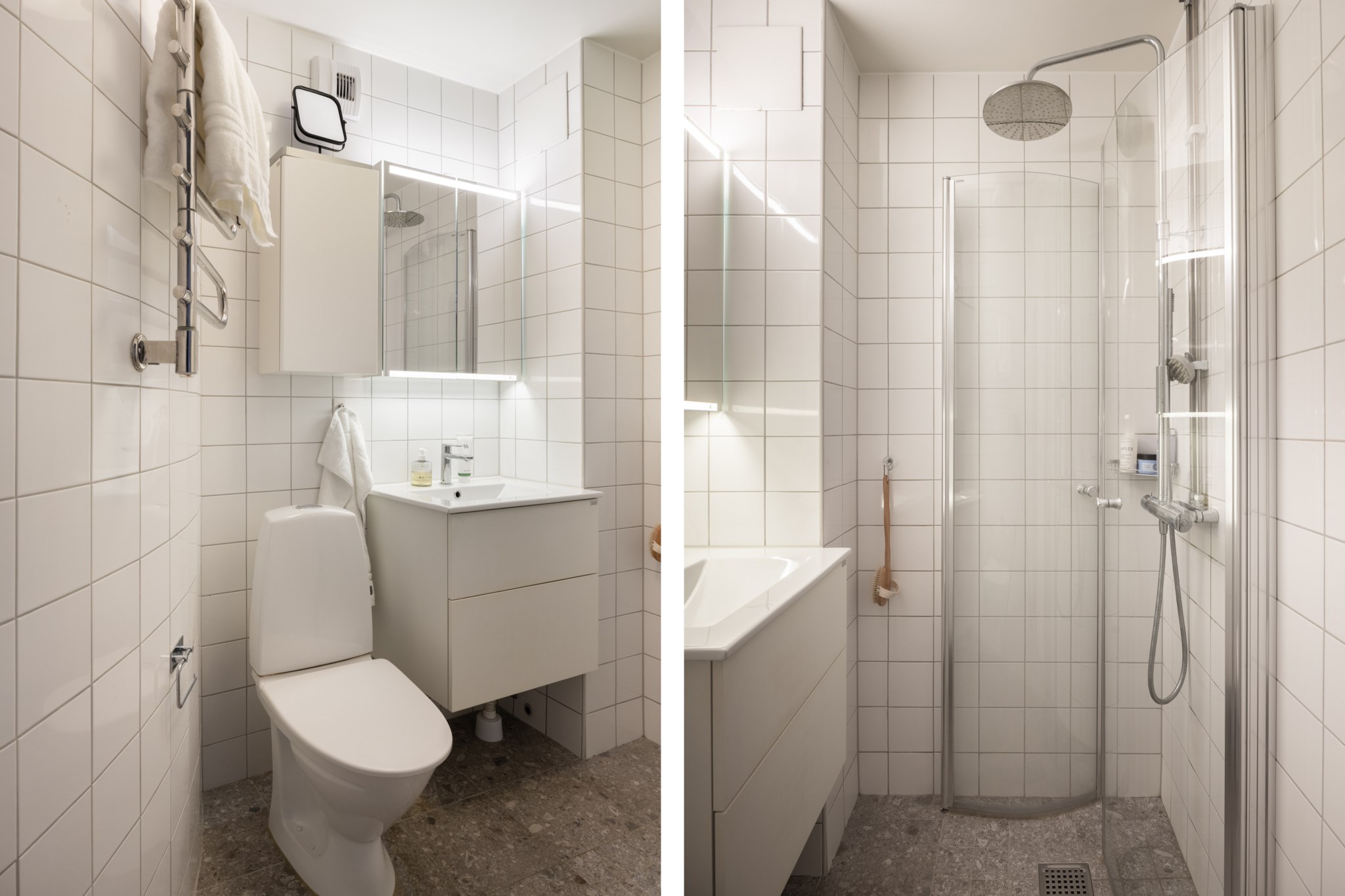Det helkaklade badrummet är modernt och utrustat med wc och dusch. Badrummet renoverades i samband med stambyte år 2020.
