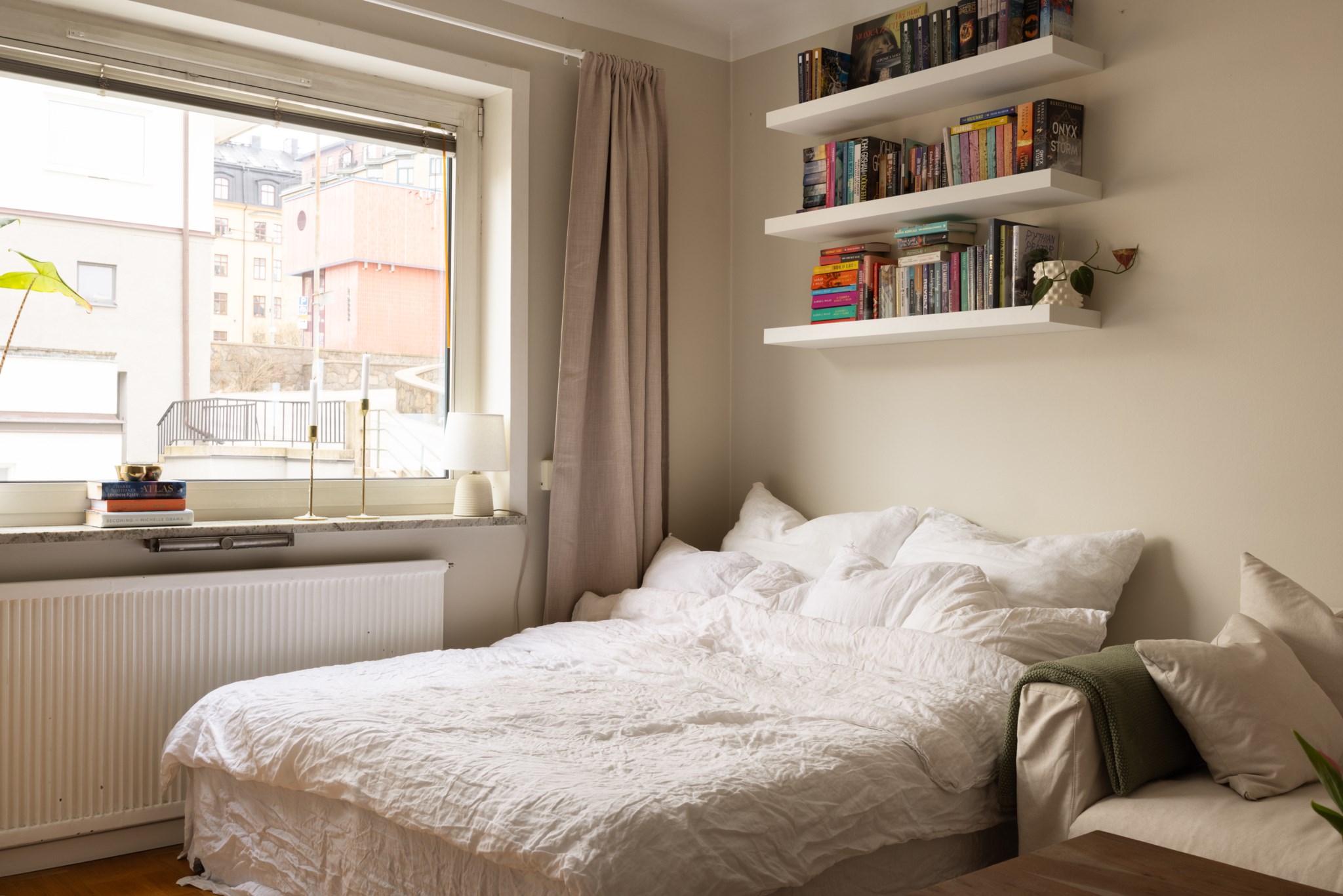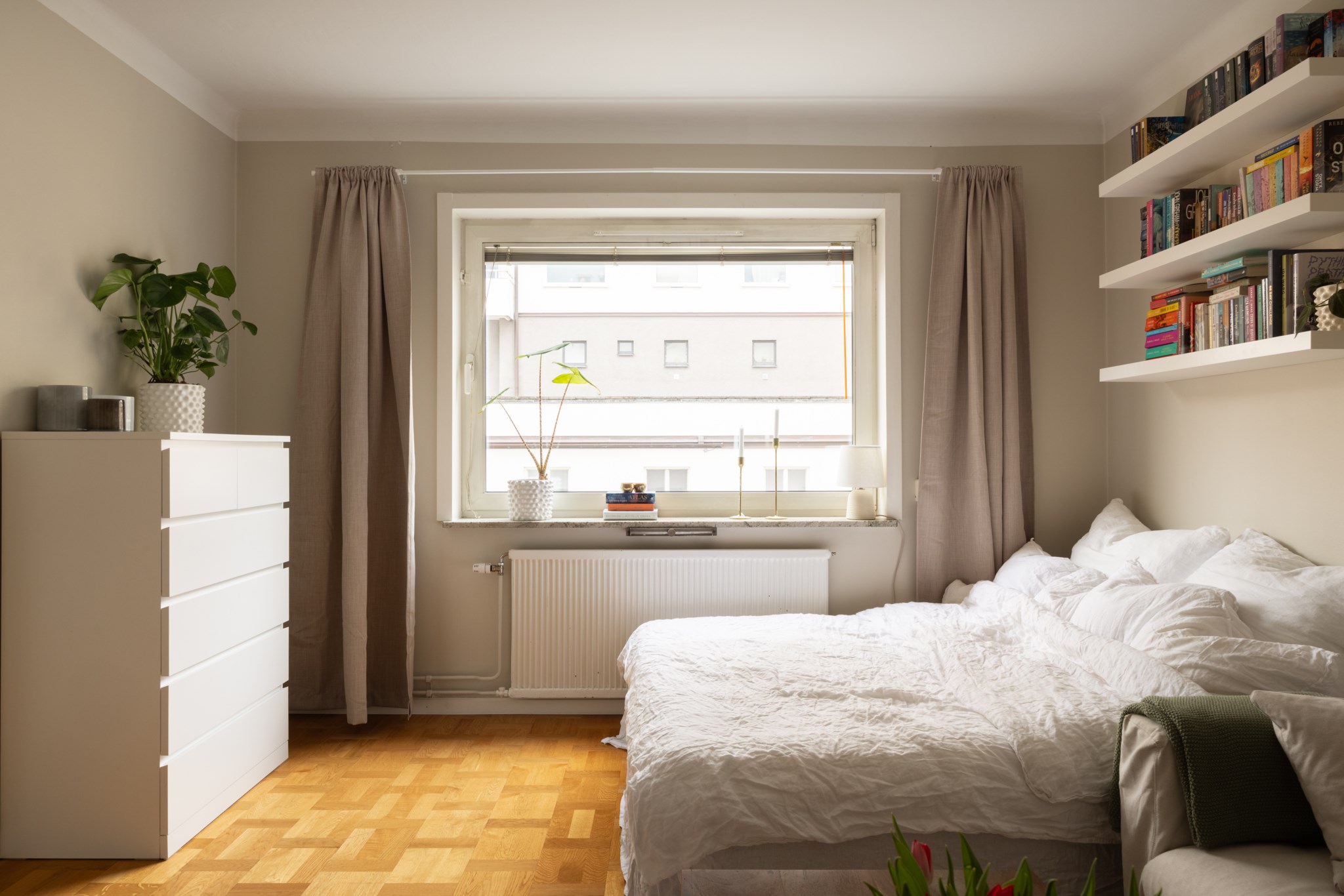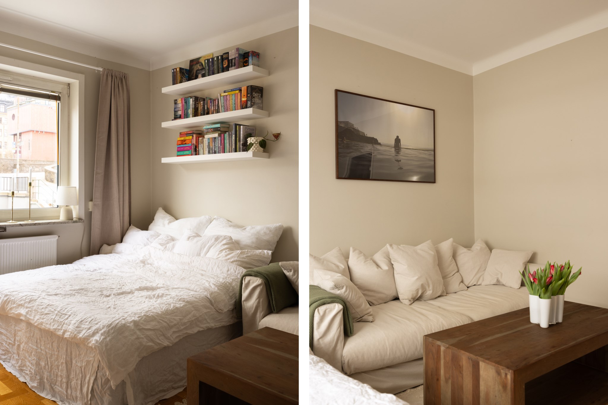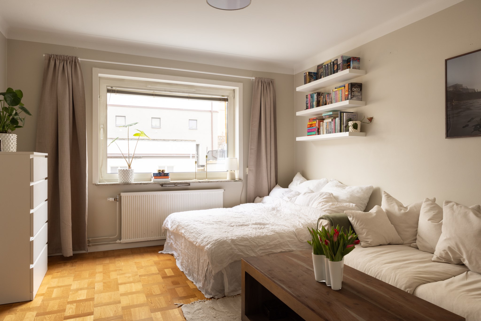 Ljust och trevligt allrum med stort fönsterparti, väggar i en gråbeige kulör och fint genomgående golv. Rummet rymmer både soffa, tv-bänk, matbord och säng med nattduksbord.