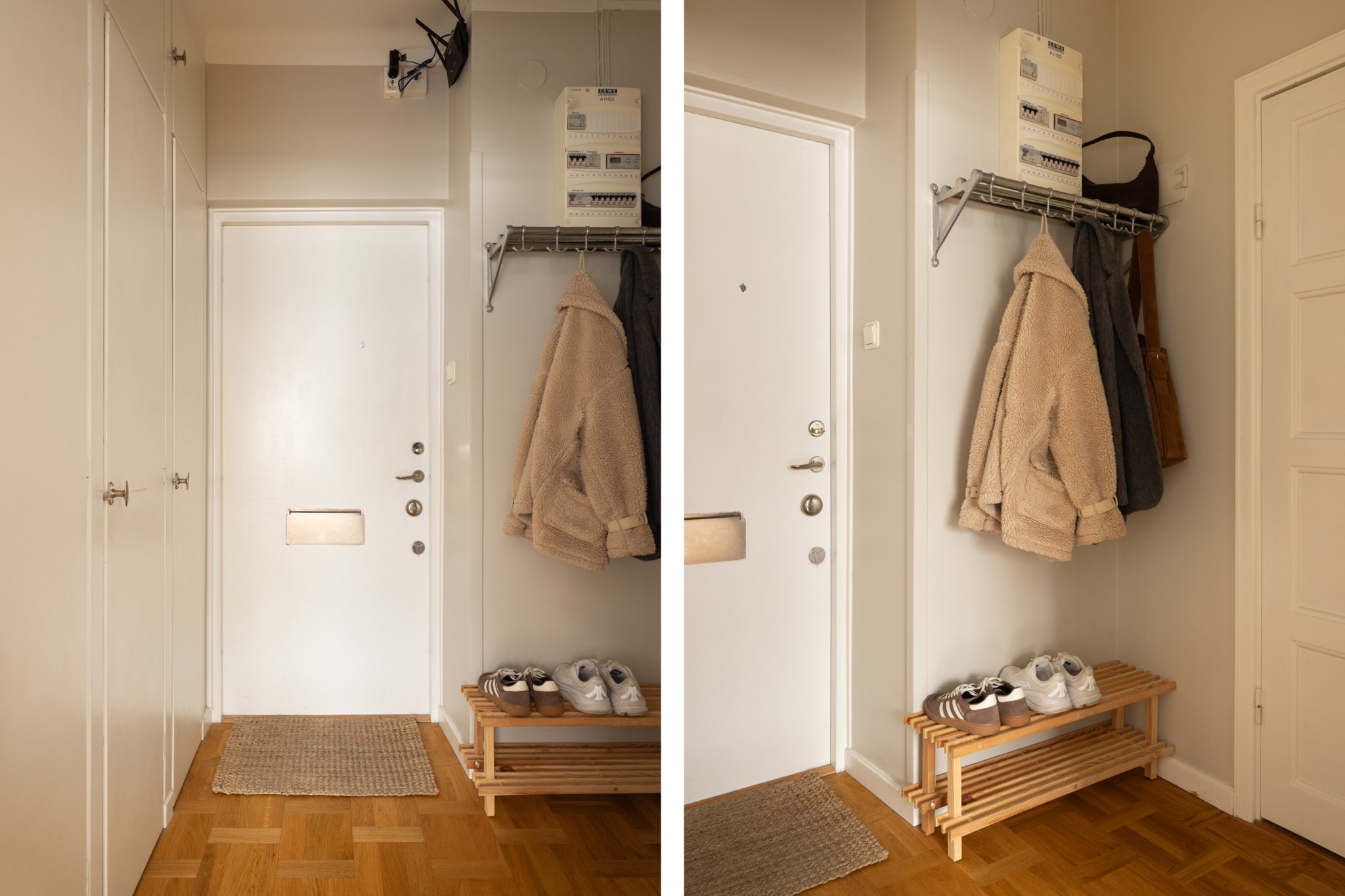 Välkomnande hall med ljusa väggar och praktisk förvaring i garderober med tidsenliga detaljer. Goda möjligheter till avhängning och plats för skoställ. Säkerhetsdörr.