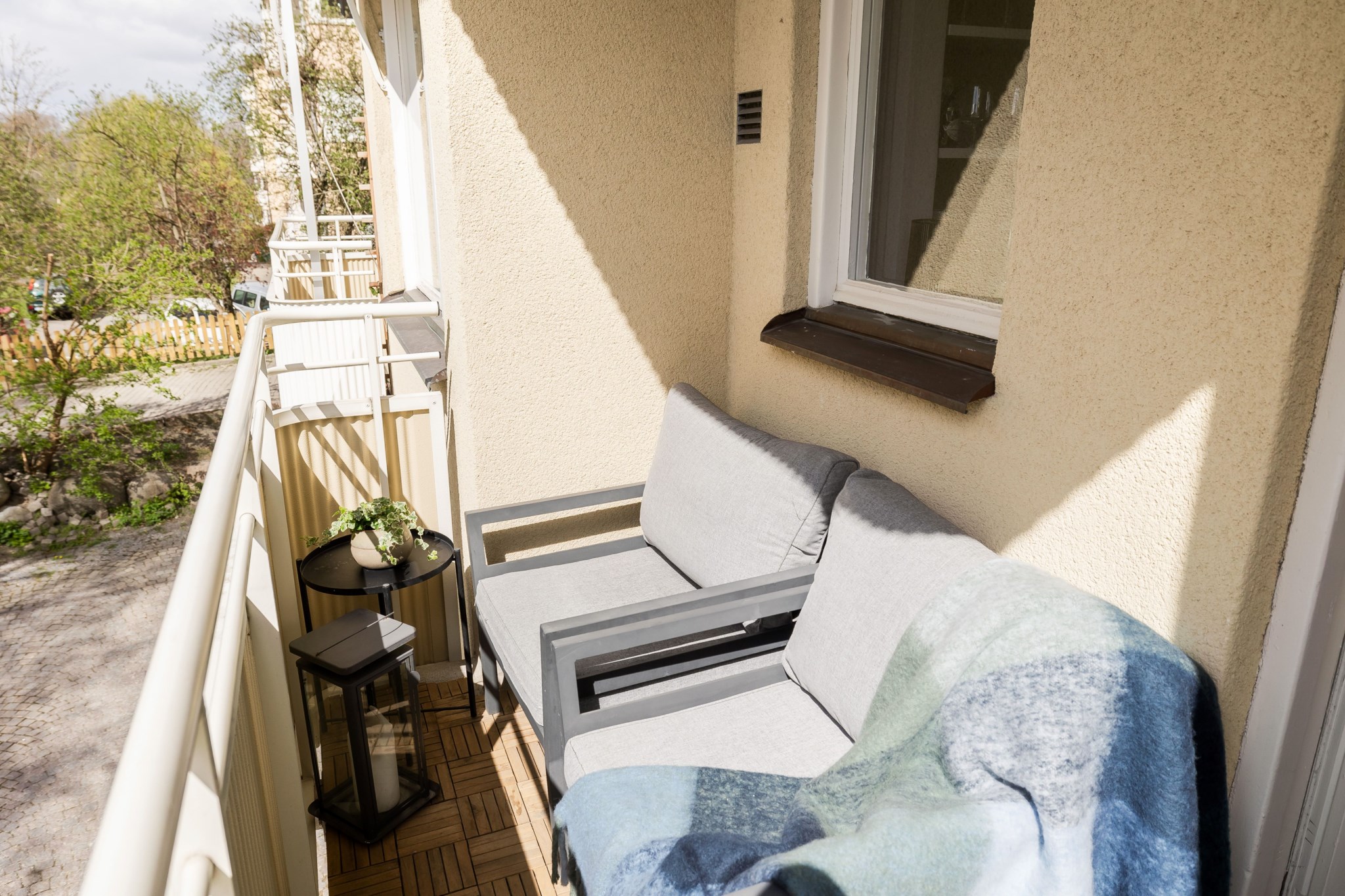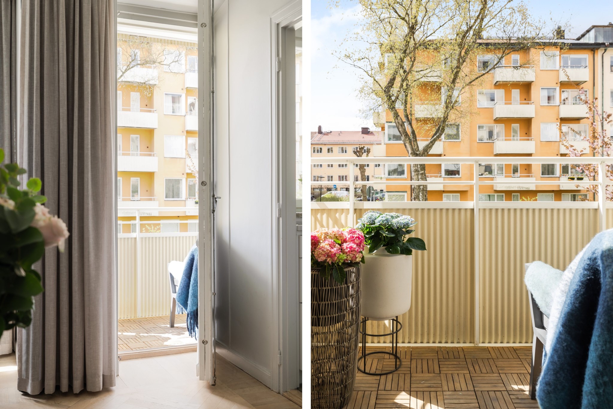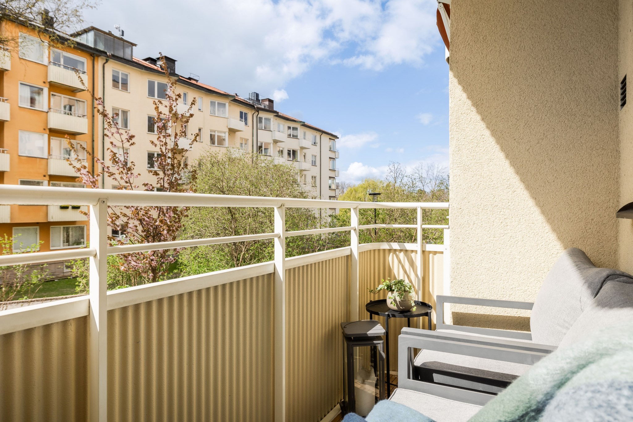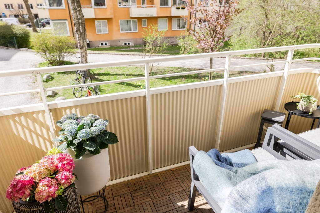 Solig balkong i sydvästläge med plats för loungemöbler, växter och planteringar. Lugnt ostört läge mot gård.