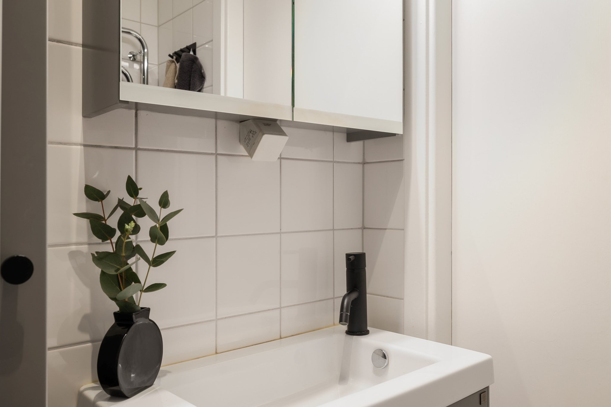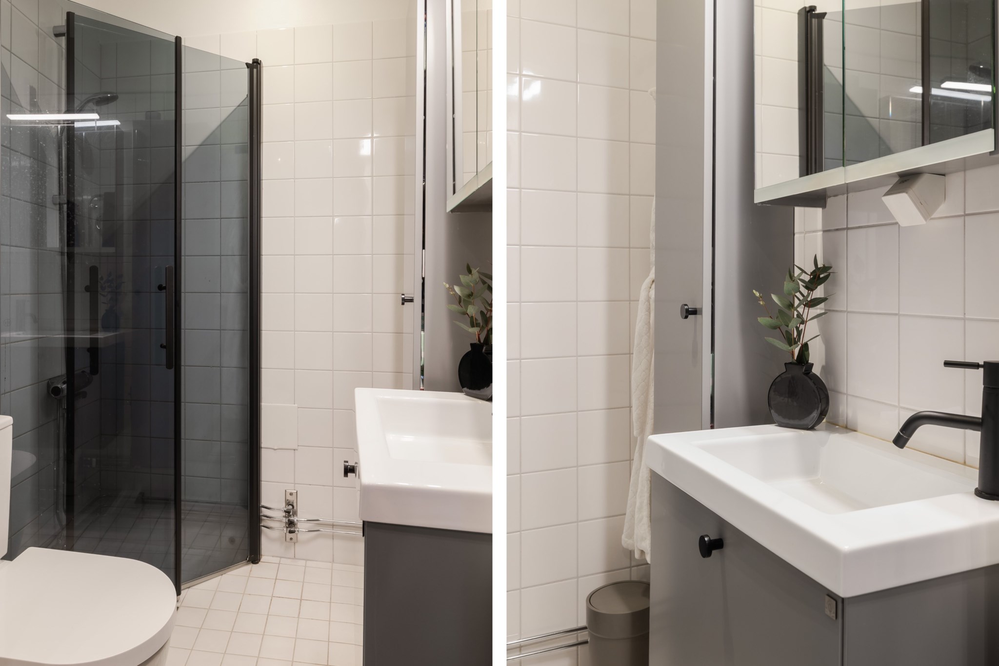 Stilrent helkaklat badrum med ljust kakel och klinker som smakfullt bryts av med mörkare badrumsinredning genom vikbara duschväggar, kommod med förvaring samt linneskåp. Badrummet i övrigt är utrustat med WC, spegelskåp samt dusch. Förberett för installation av tvättmaskin.