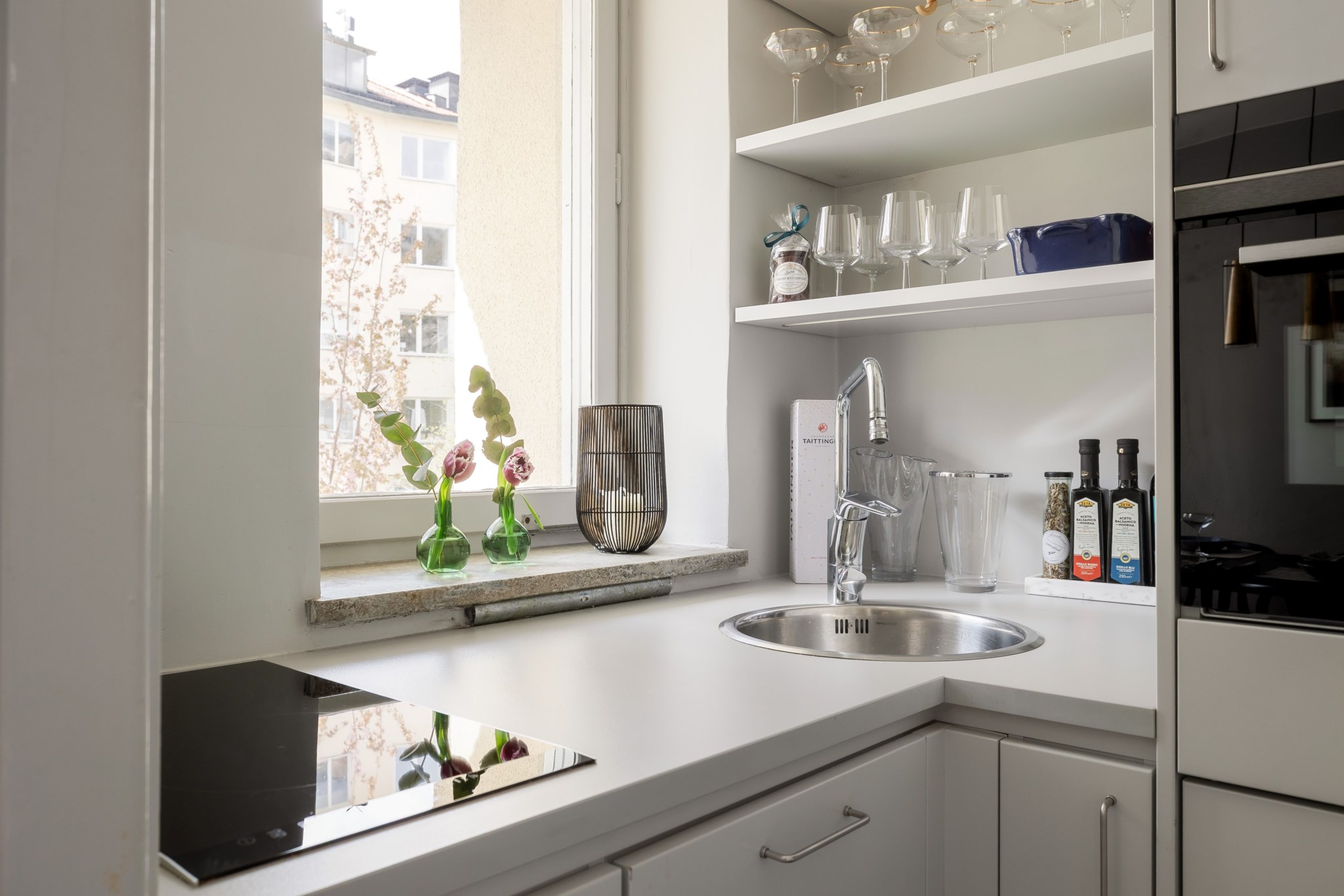 Bostaden är smakfullt renoverad med kök från Ballingslöv med integrerade vitvaror såsom diskmaskin, kombinerad mikro/ugn, samt kyl med frysfack. Fräscht och helkaklat badrum som är förberett för installation av tvättmaskin. Balkongen som är bostadens hjärta vetter mot ett soligt sydvästläge med en lummig utsikt. Huset är beläget i suterräng vilket gör att balkong och fönster har ett upphöjt läge.