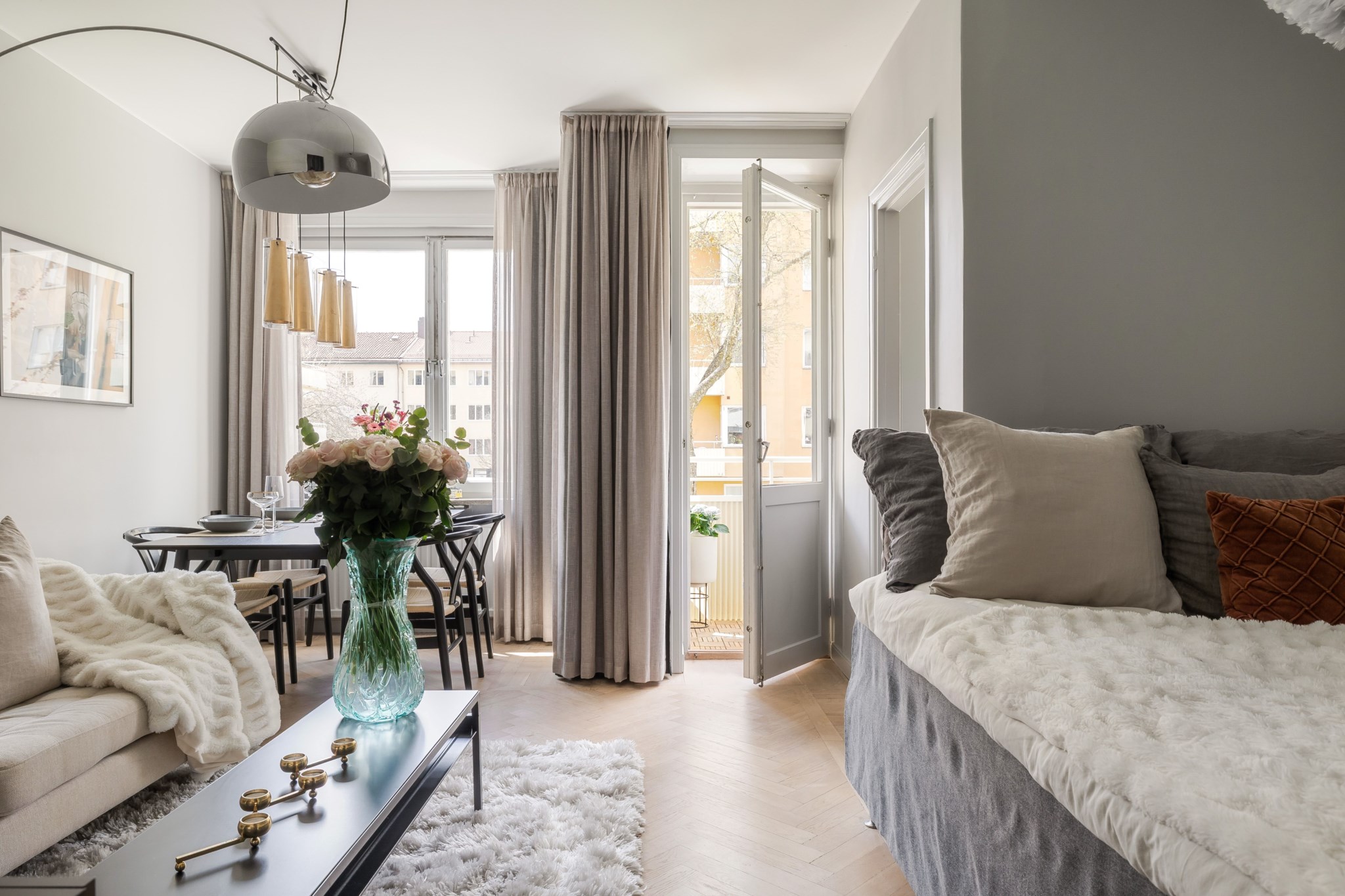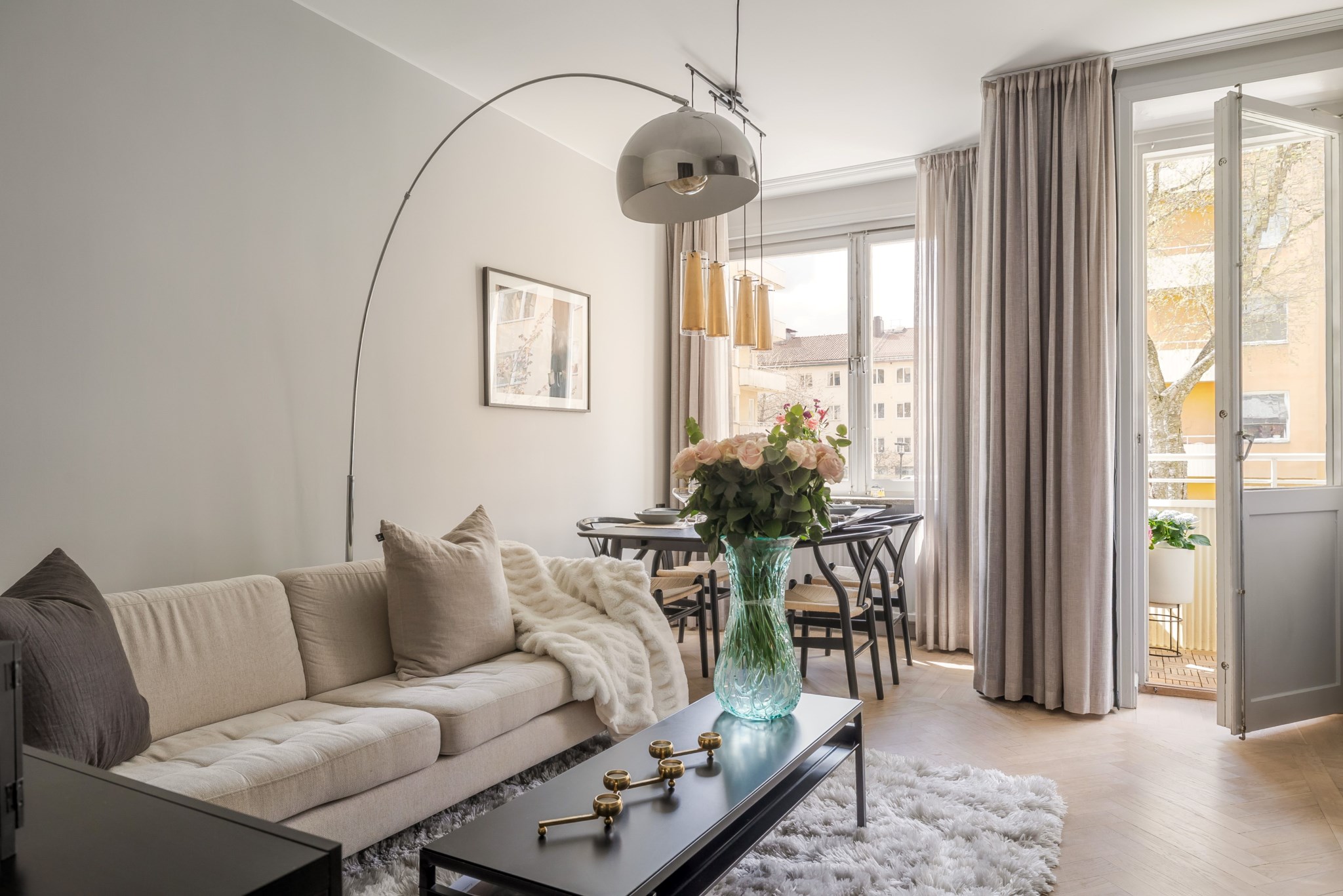 Ljust och lättmöblerat allrum med fin fiskbensparkett och målade väggar i en ljusgrå nyans. Rummet erbjuder plats för matgrupp för 6 personer, soffa, soffbord, mediebänk och TV. Från vardagsrummet nås bostadens rofyllda balkong.