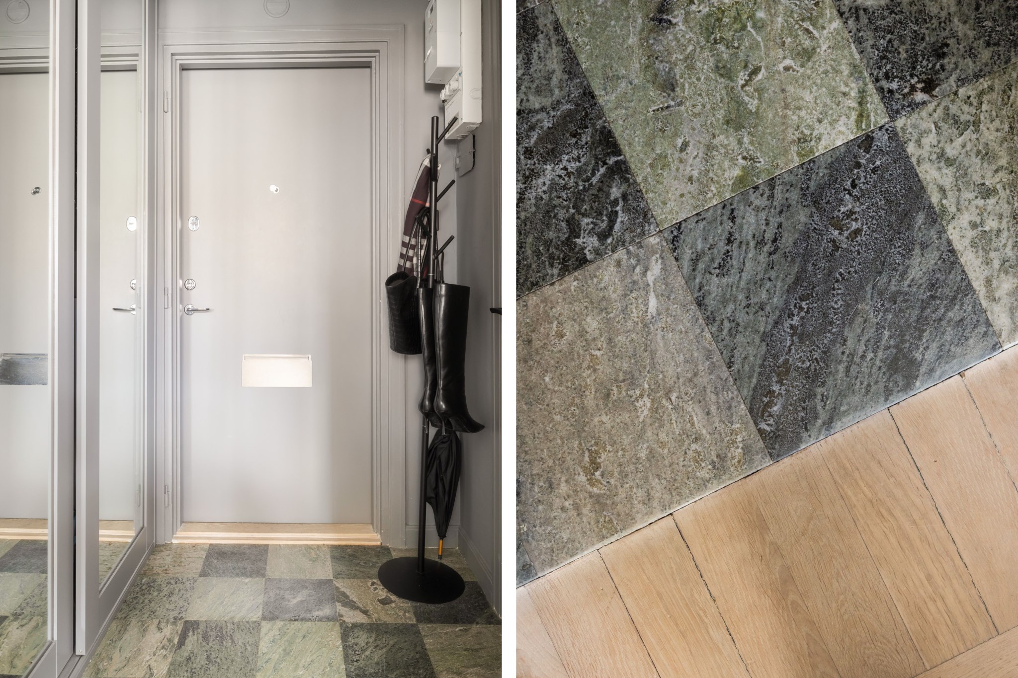 Välkomnande hall med ljusa väggar och rutigt tidstypiskt stengolv. God förvaring i garderober som försluts med stora spegeldörrar från golv till tak. Plats för avhängning av kläder och skor. Garderobsinredning från Ballingslöv.