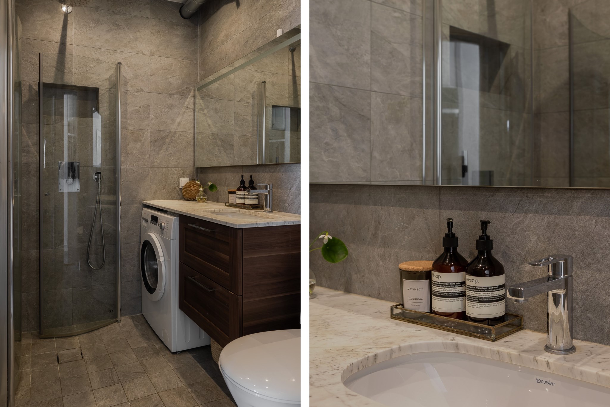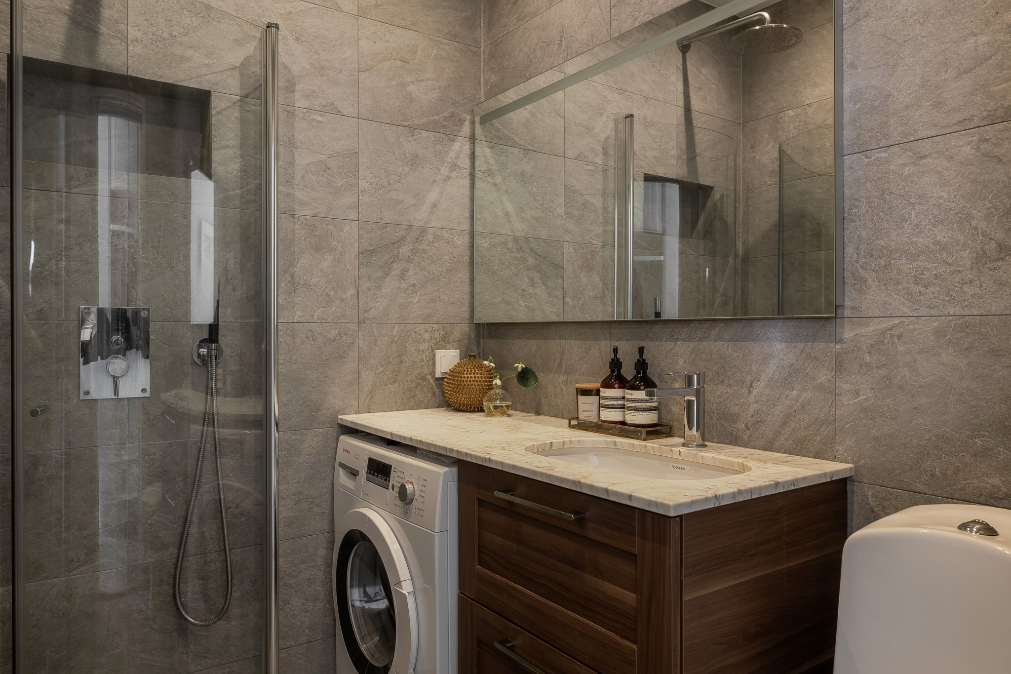 Modernt badrum med melerat kakel. Badrummet är inrett med WC, handfat med melerad bänkskiva, kommod i trä, stor spegel samt tvättmaskin. Duschhörna med stilren nisch, utrustad med dusch och infällbara duschväggar i glas.