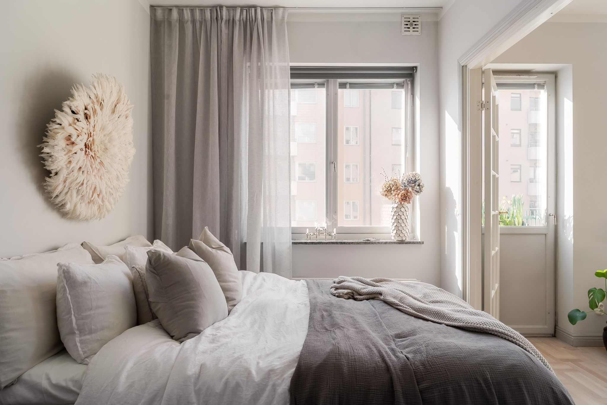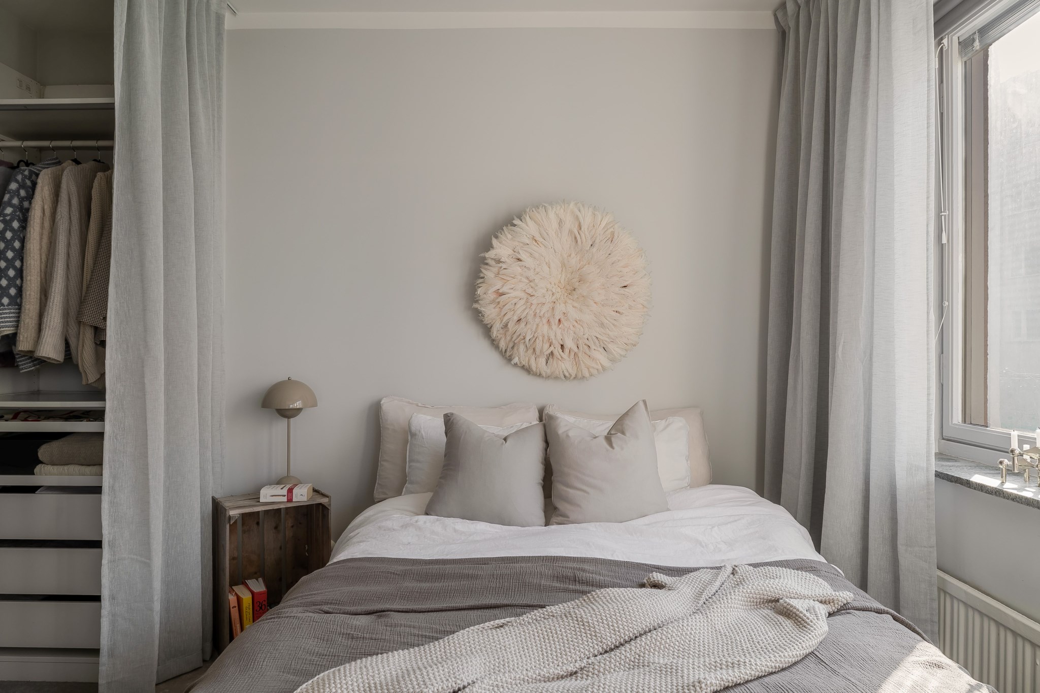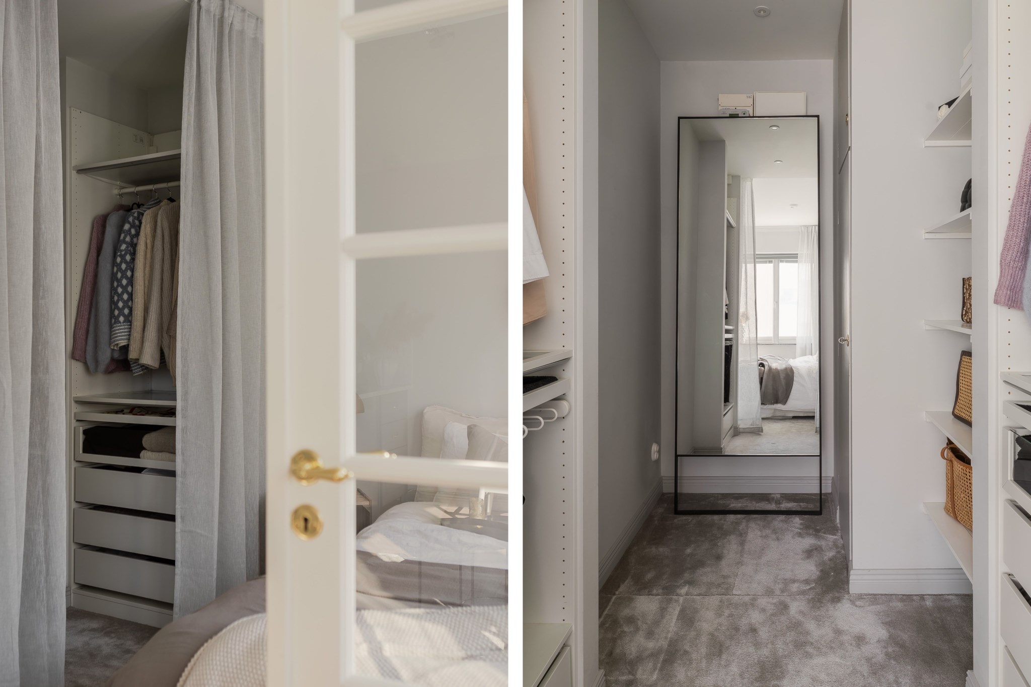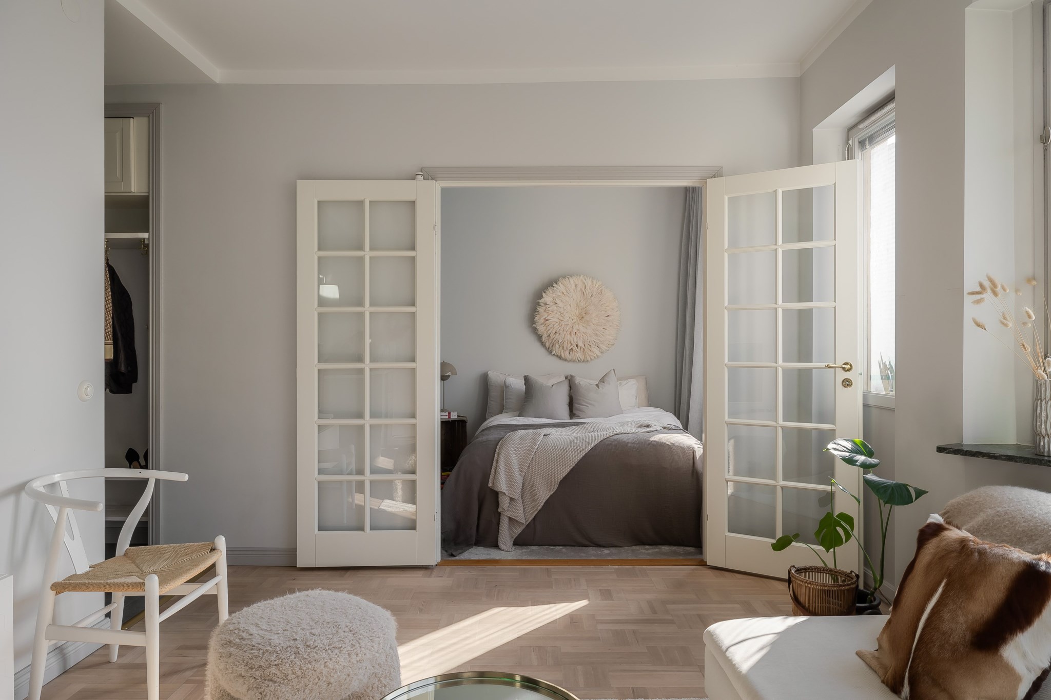 Rogivande sovrum med neutralt målade ytskikt som nås via vackra dubbeldörrar med spröjsade glaspartier. Här finns plats för en större säng med tillhörande sängbord. Rummet får fint ljusinsläpp från ett stort fönster och erbjuder god förvaring i en intilliggande walk-in closet. Sovrummet och walk in closet har heltäckningsmatta genomgående.