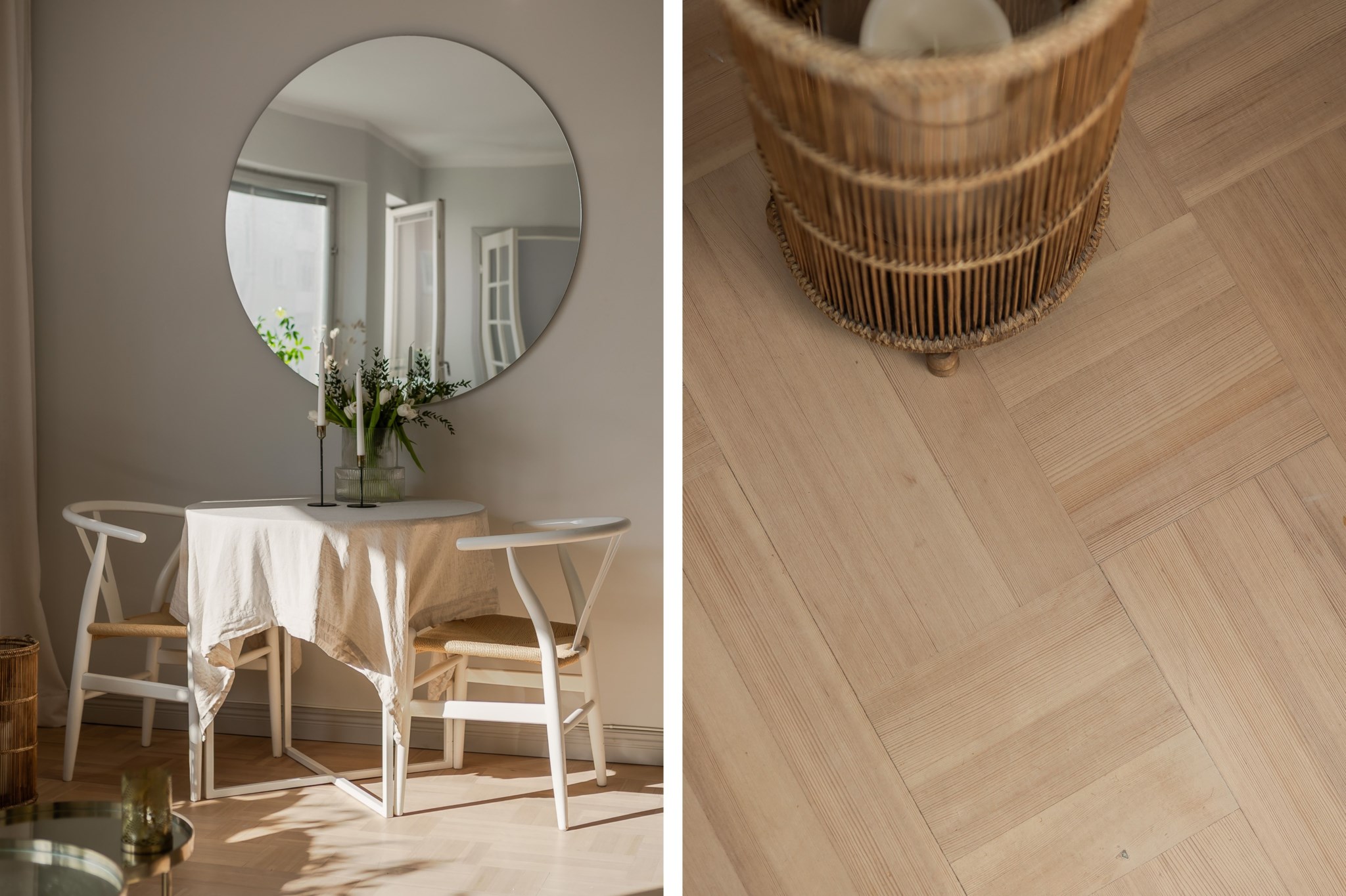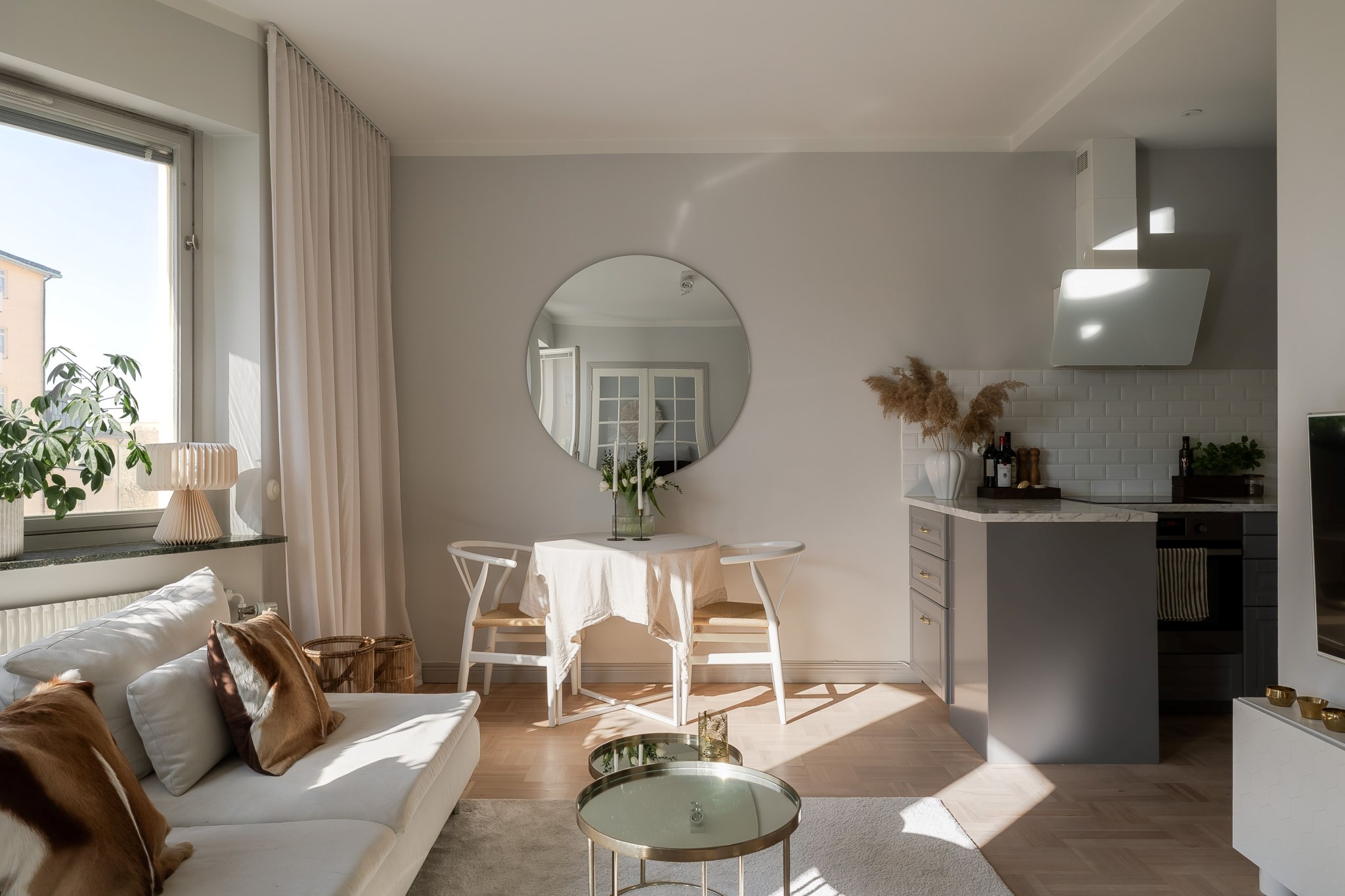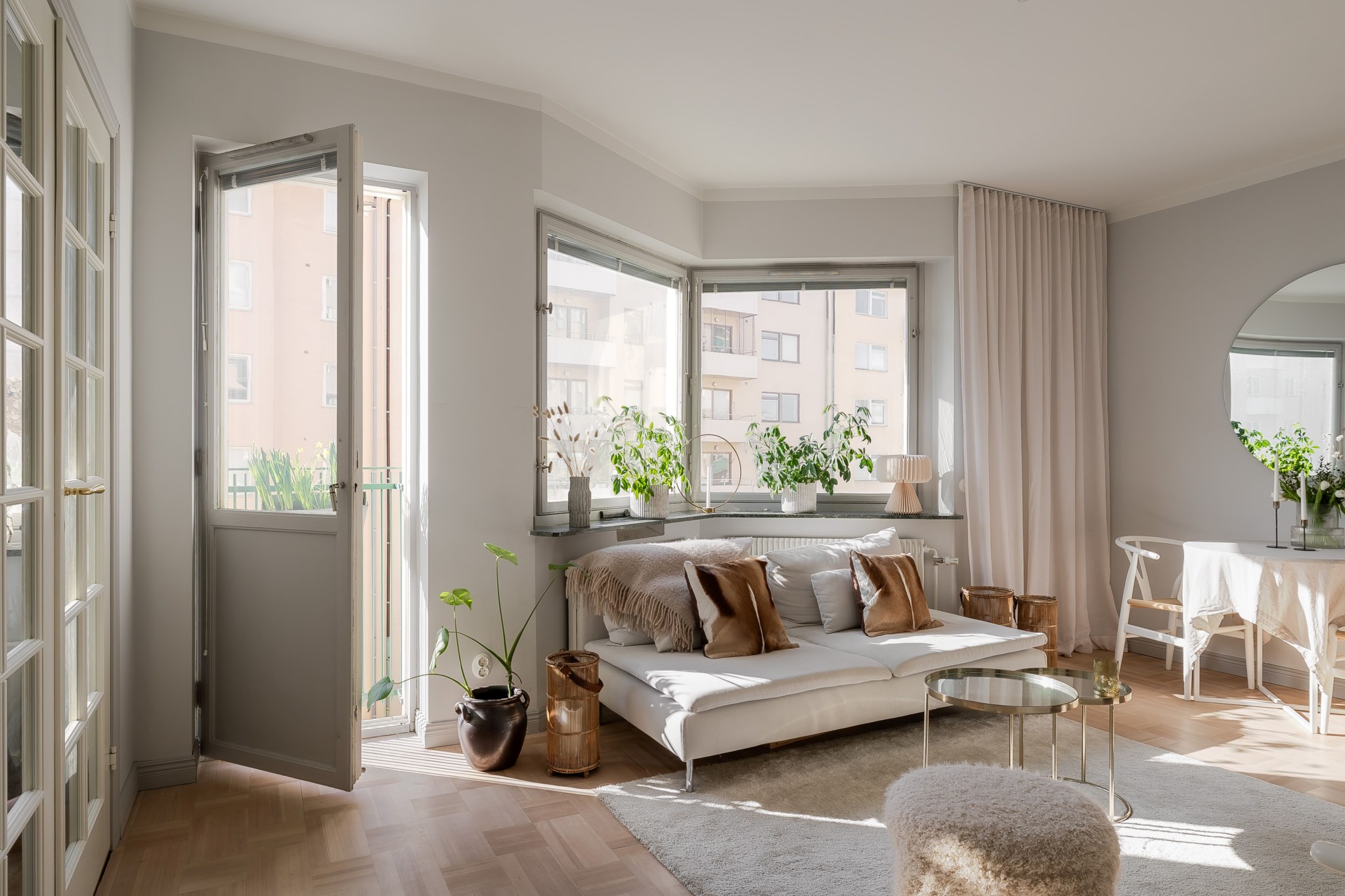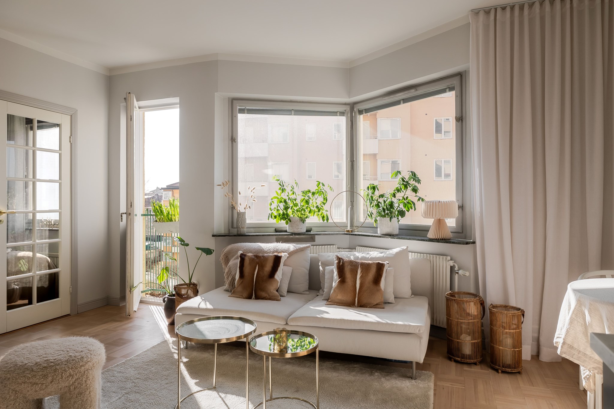 Socialt vardagsrum med ljusmålade ytskikt och fint parkettgolv. Öppen planlösning och fint ljusinsläpp från vinklat fönsterparti samt öppning mot fransk balkong. Lättmöblerat med plats för både soffgrupp, matgrupp och annan personlig inredning.