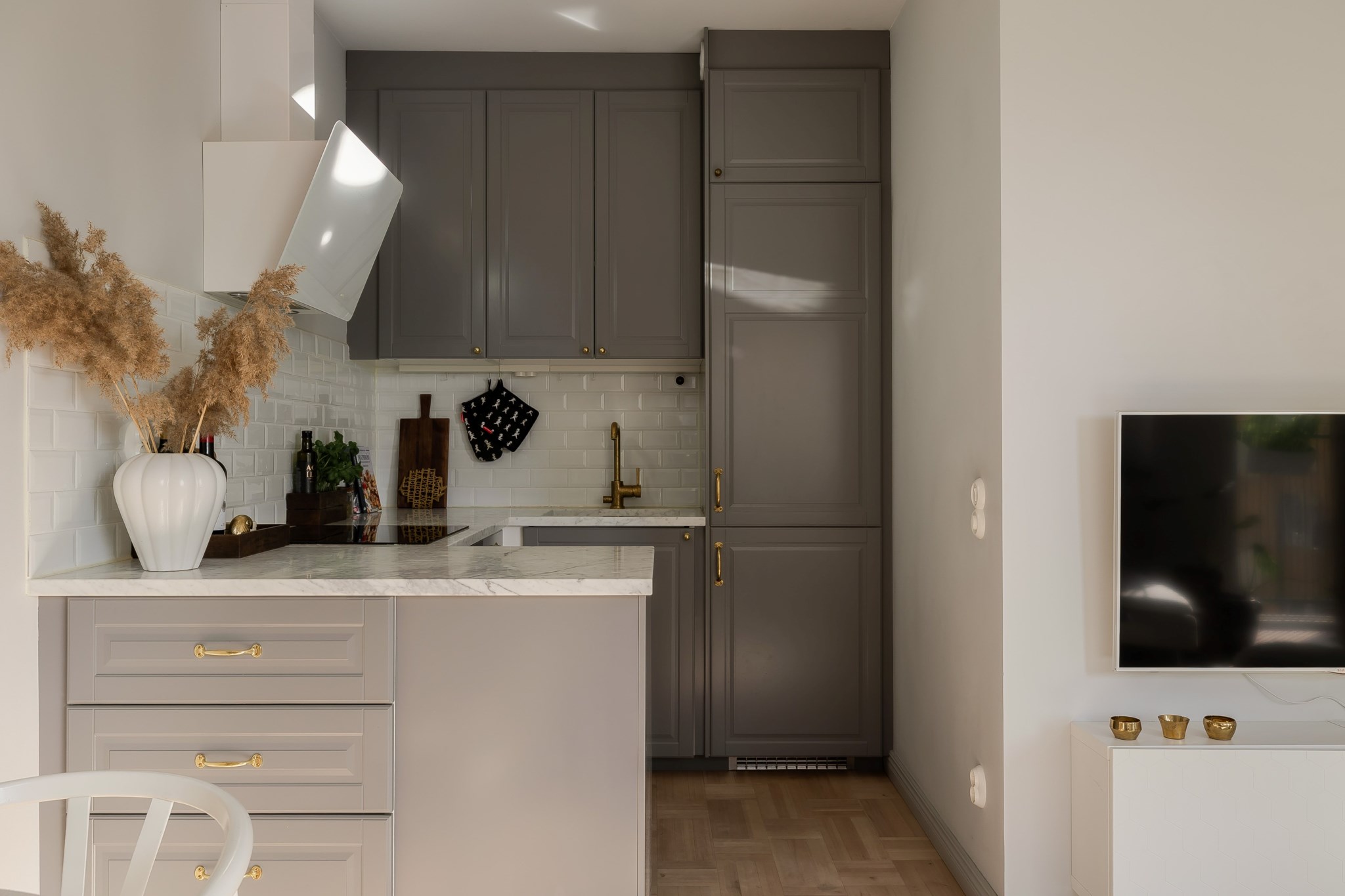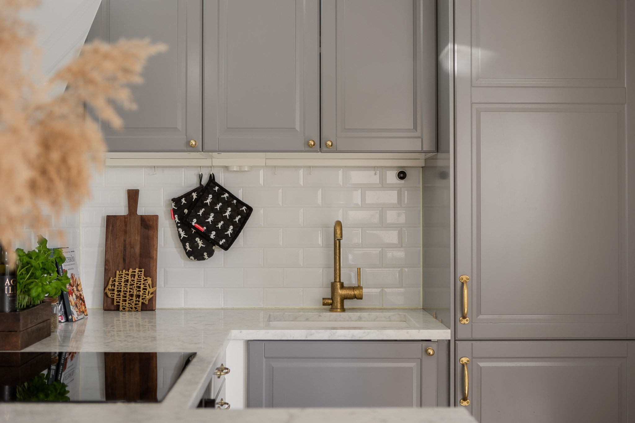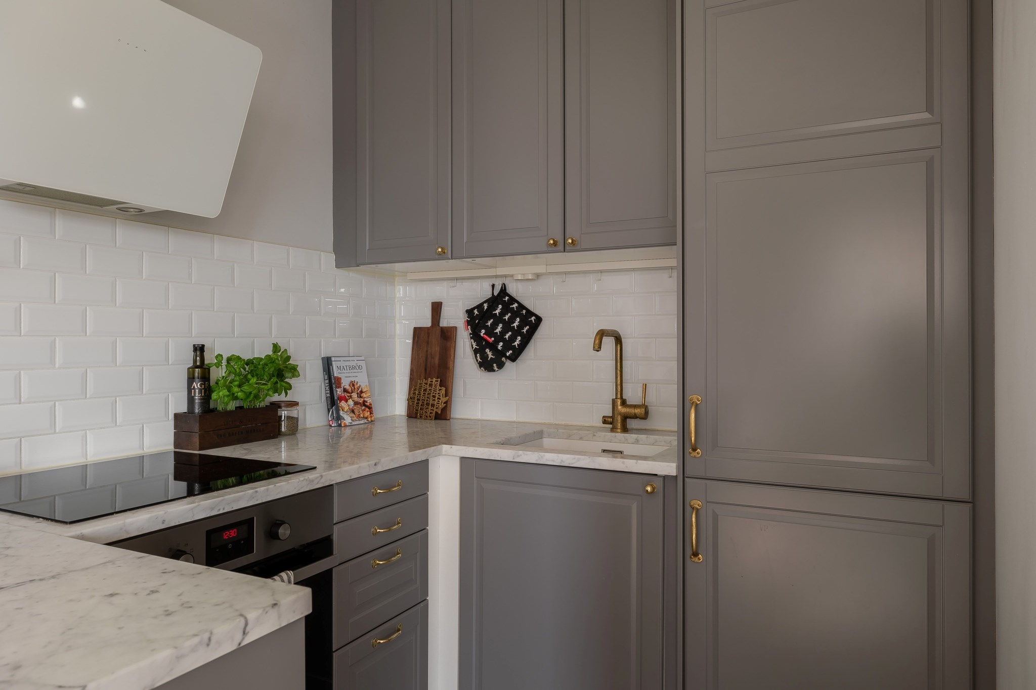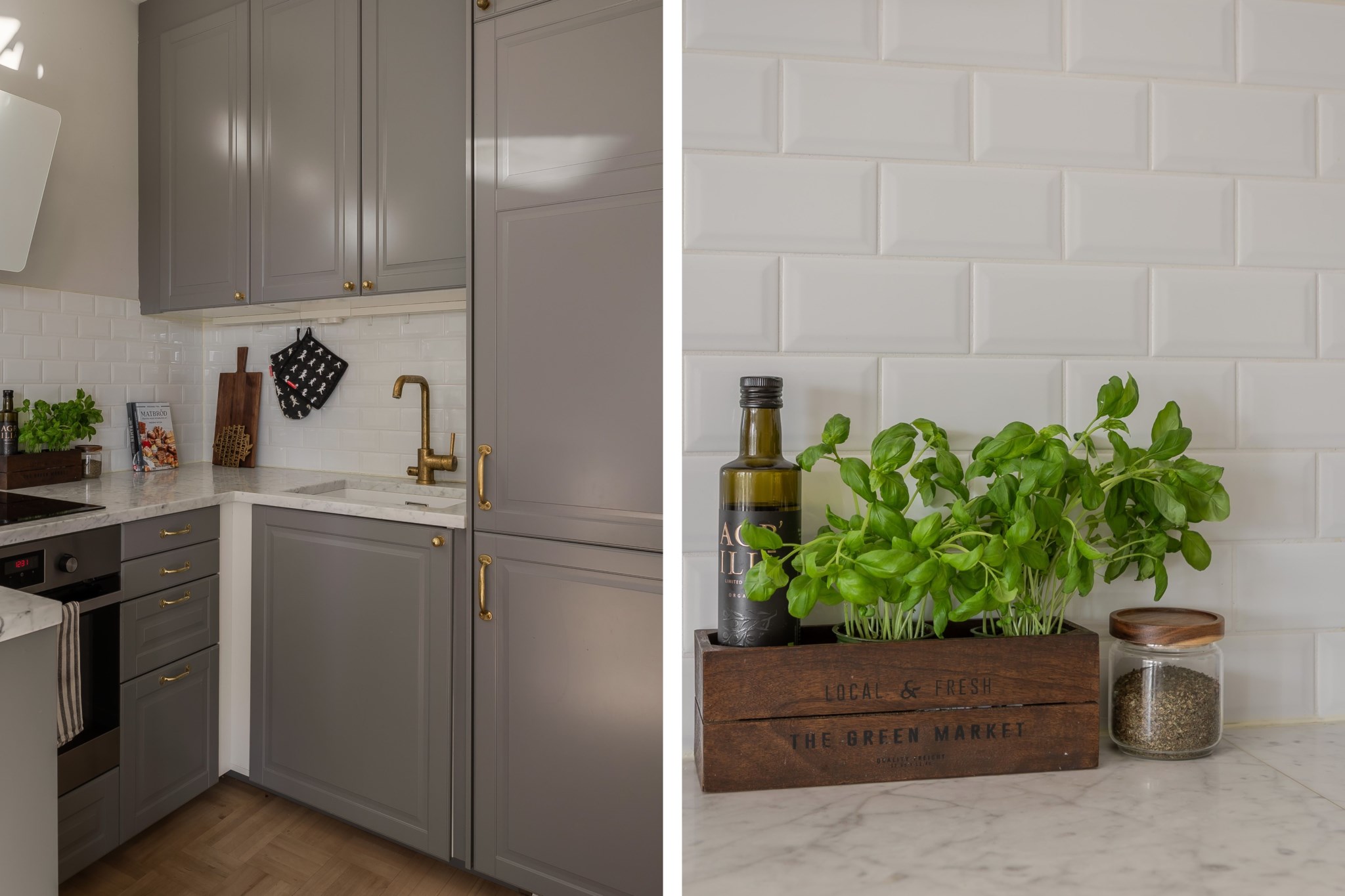 Stilrent kök med ljusmålade ytskikt och fint parkettgolv. Köket har genomtänkta färg- och materialval med grå skåpsfronter, vit kaklad väggpanel samt bänkskiva i carerra marmor. Öppen planlösning mot vardagsrummet där en köksö med förvaring fungerar som avgränsning. Kökets maskinella utrustning består av kyl/frys, spishäll, ugn, fläkt och diskmaskin.