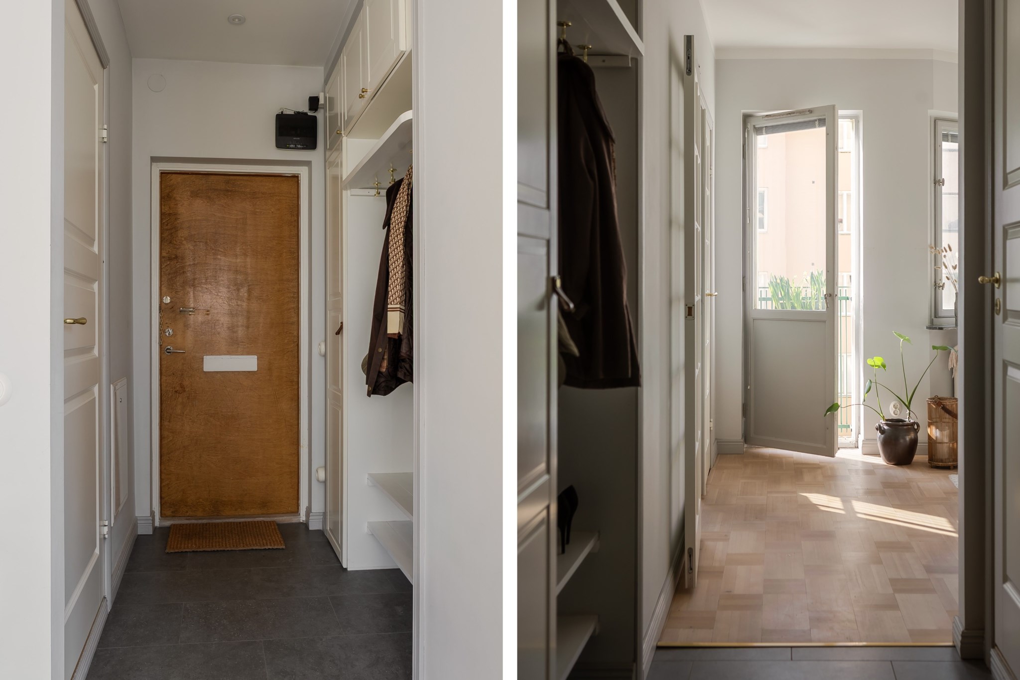 Välkomnande hall med ljusmålade ytskikt och mörkt klinkergolv. Här finns en platsbyggd förvaringslösning samt hatthylla med plats för ytterkläder och skor.