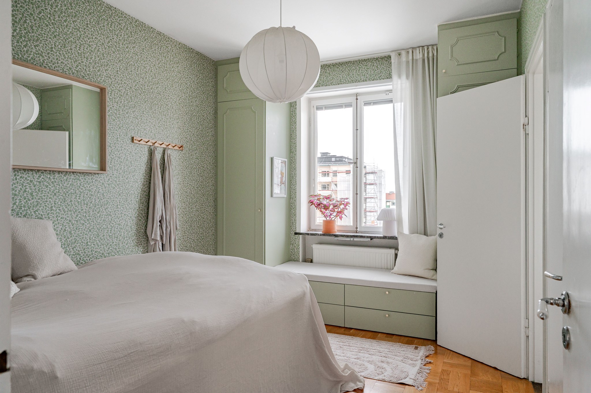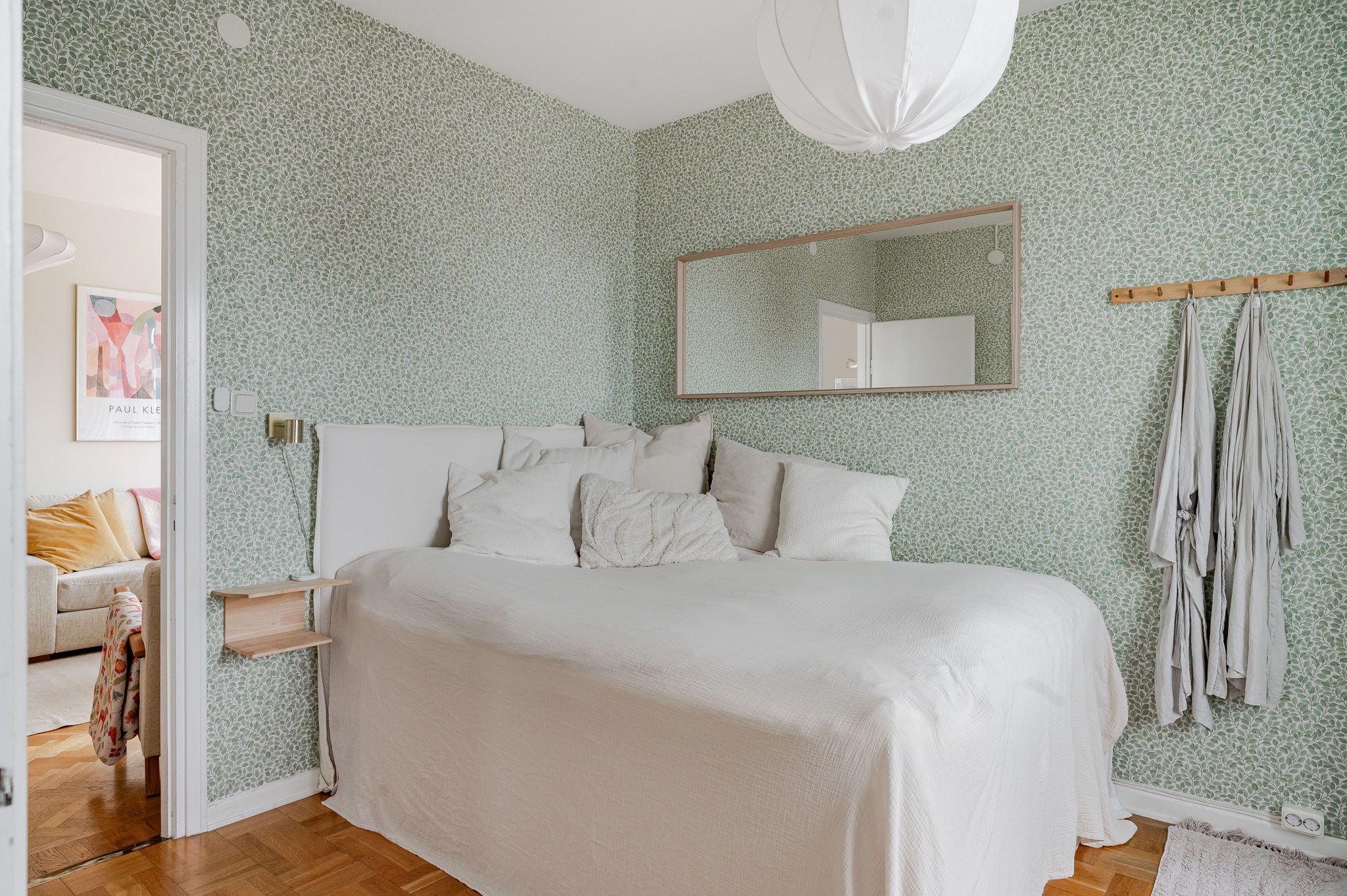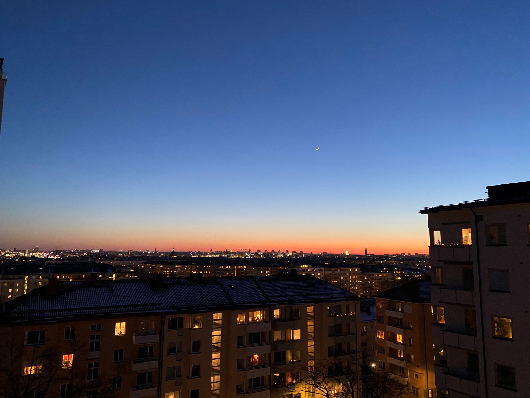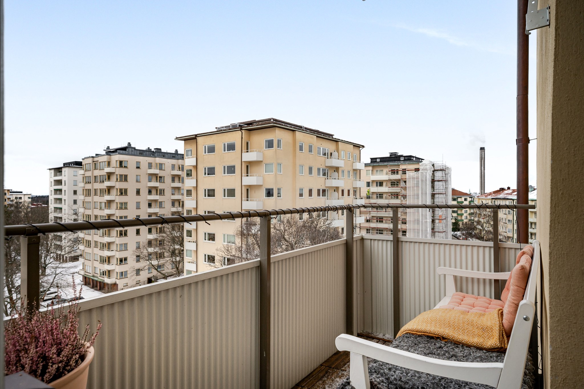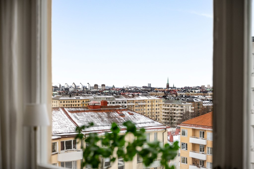 Bostadens hjärta är vardagsrummet där det dels skapas total mysfaktor genom den fungerande öppna spisen, och det är även från vardagsrummet som ni når den fantastiska balkongen i sydvästläge med enastående utsikt över trädtoppar och takåsar. Tack vare bostadens höga belägenhet så ser ni över hela Stockholm och kan njuta av en utsikt som är något utöver det vanliga.