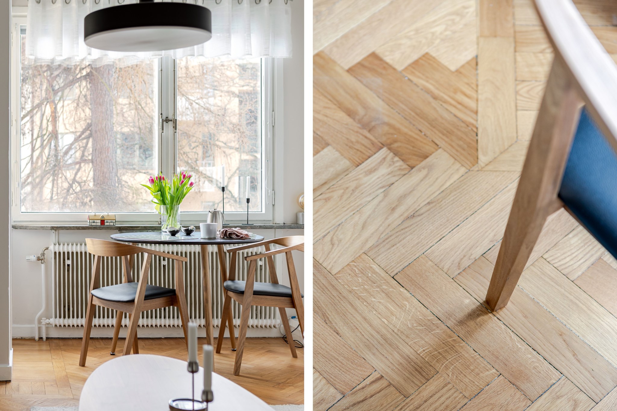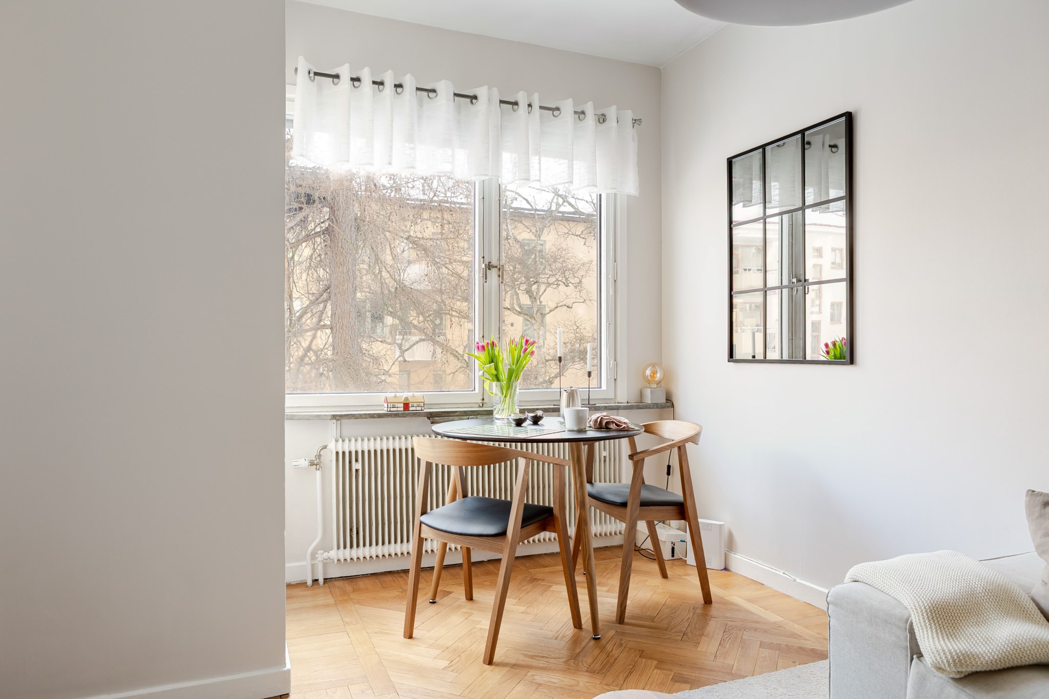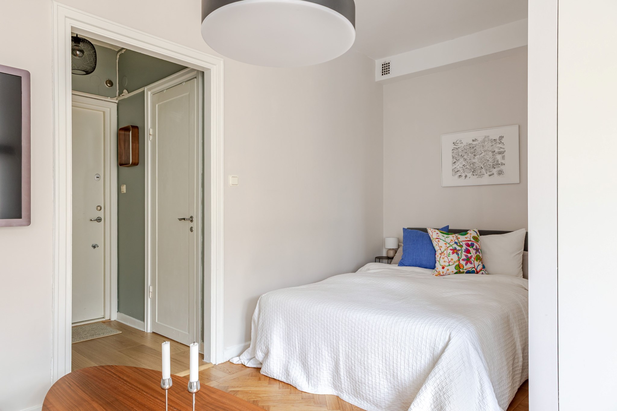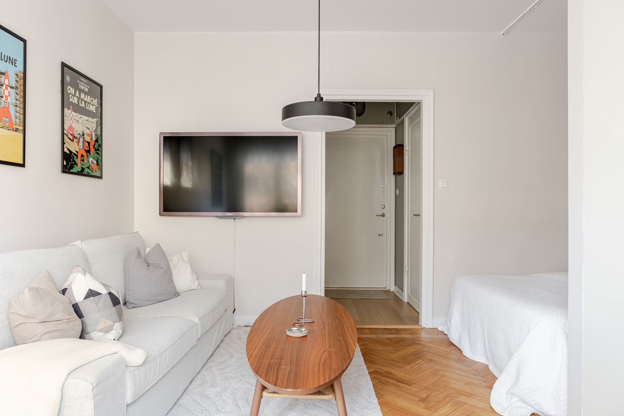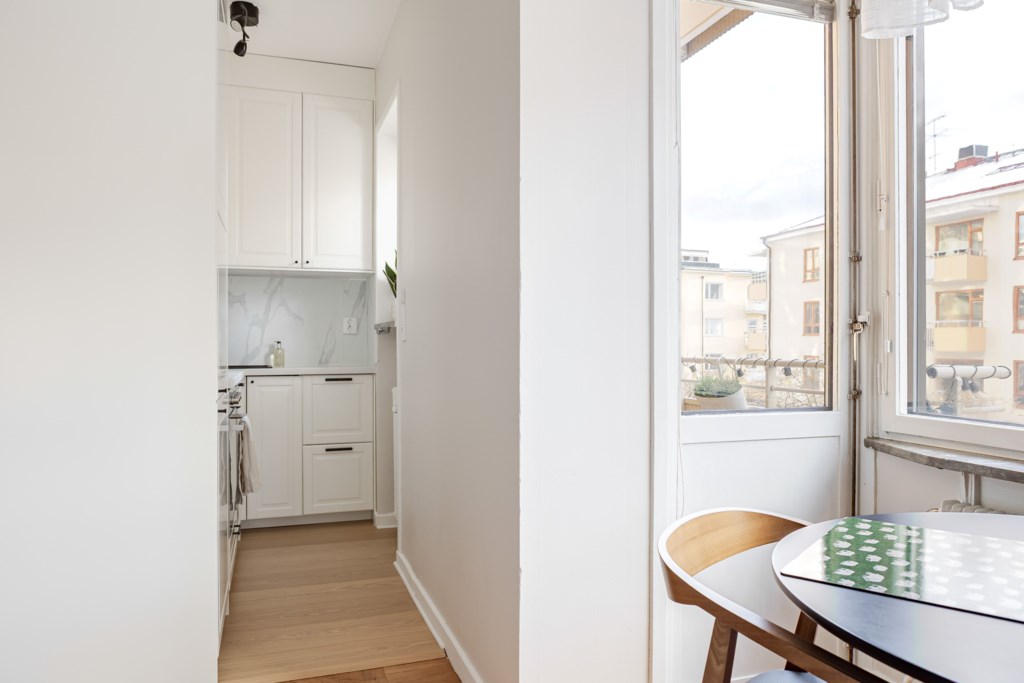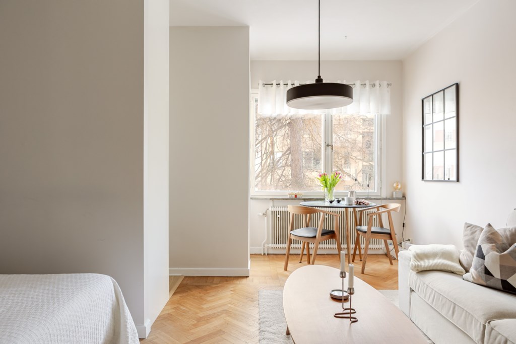 Rymligt allrum med ljusa väggar och vackert golv i fiskbensparkett. Här finns plats för soffa, soffbord, matgrupp samt säng i alkov.
