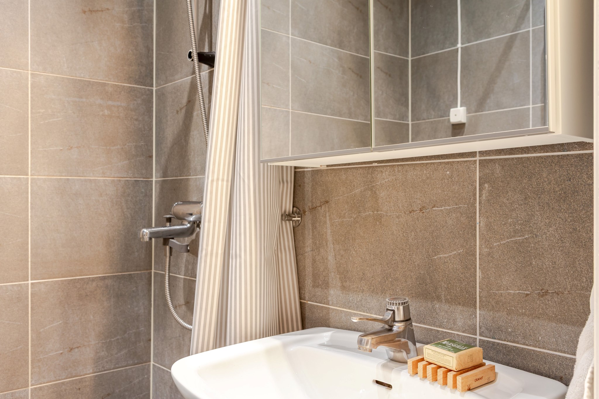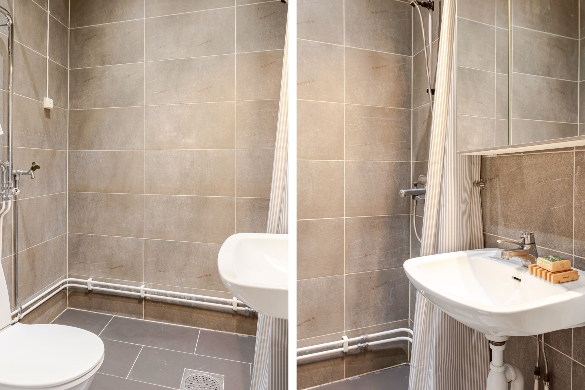 Helkaklat badrum med grått kakel och grått klinker. Badrummet är utrustat med WC, handfat och spegelskåp.