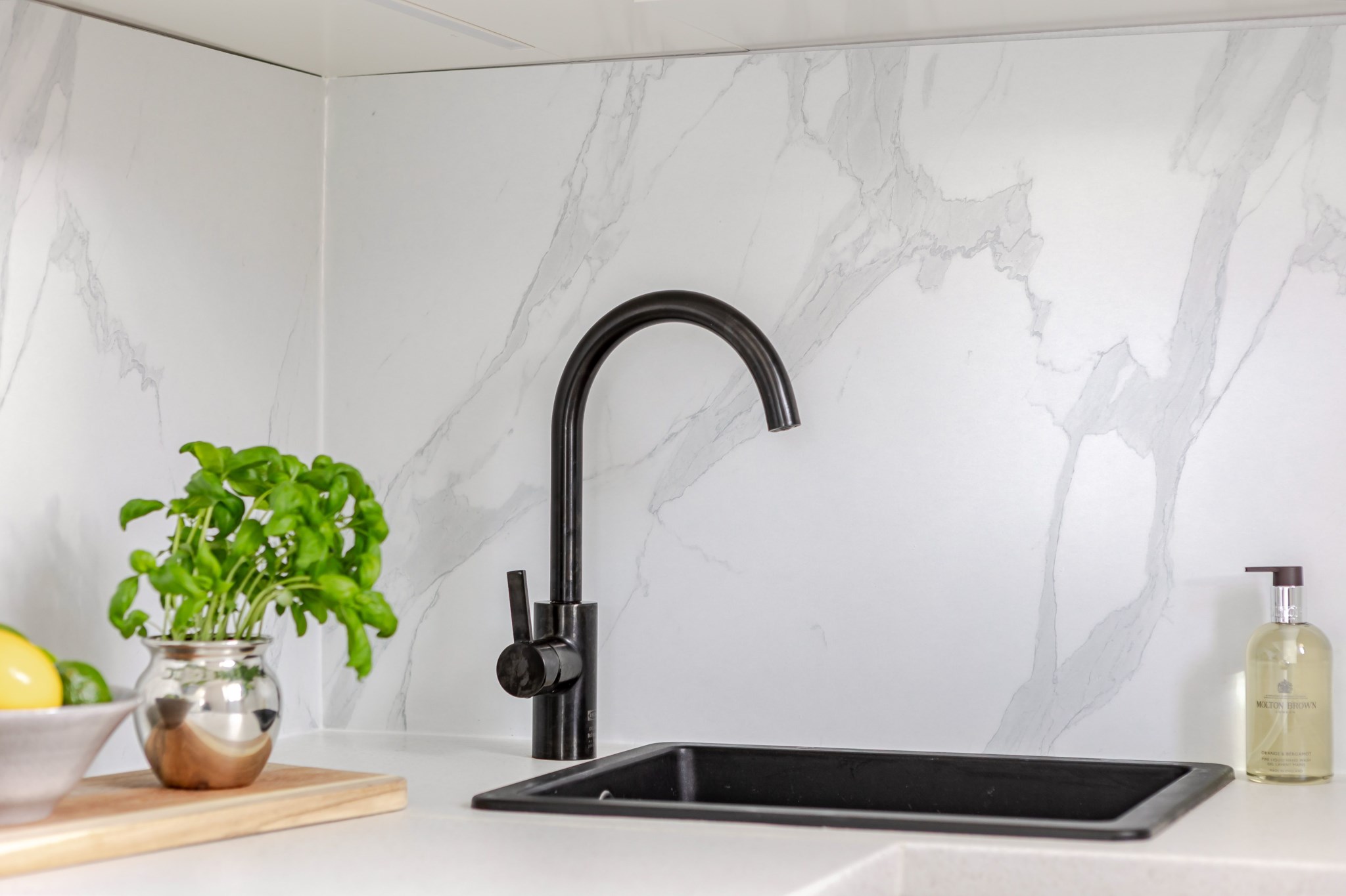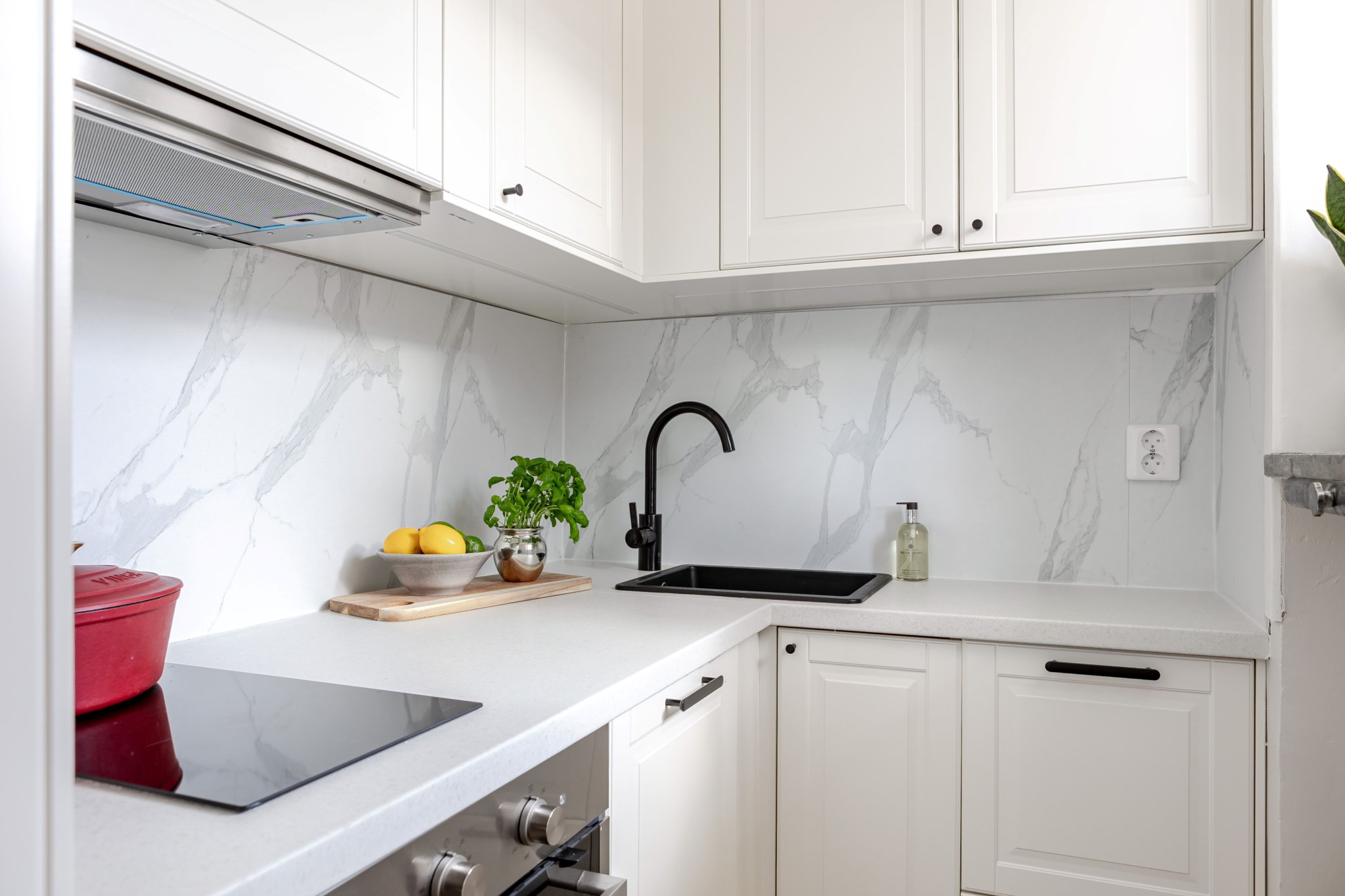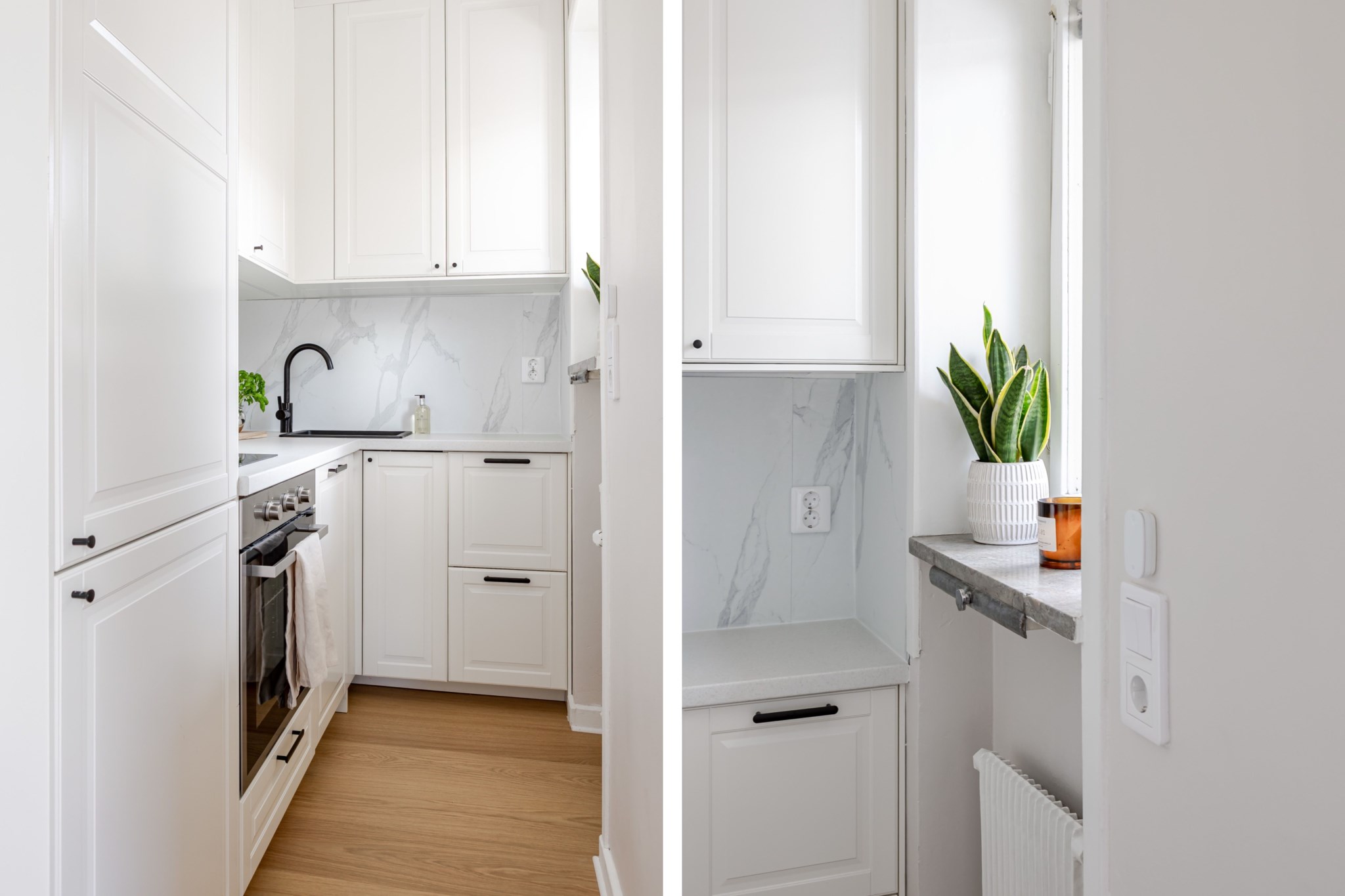 Nyrenoverat kök i smakfull design med ljusa luckfronter med svarta beslag. Köket är utrustat med diskmaskin, integrerad kyl/frys, ugn, spishäll samt diskho. God förvaring i över- och underskåp. Fint ljusinsläpp från fönster.