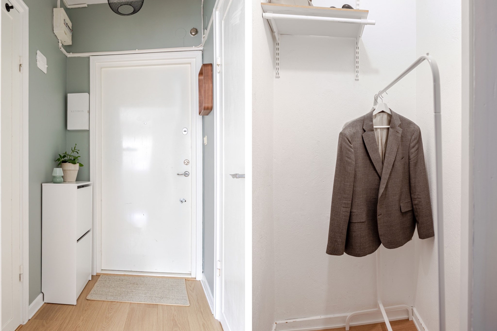 Ljus och välkomnande hall med målade väggar och ljust golv. Här finns plats för avhängning av kläder och skor samt förvaring i klädkammare.