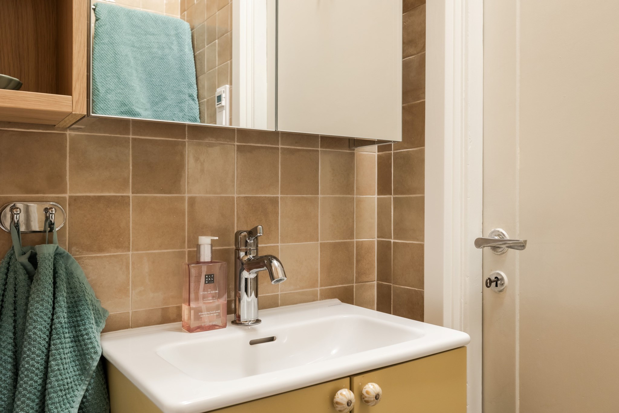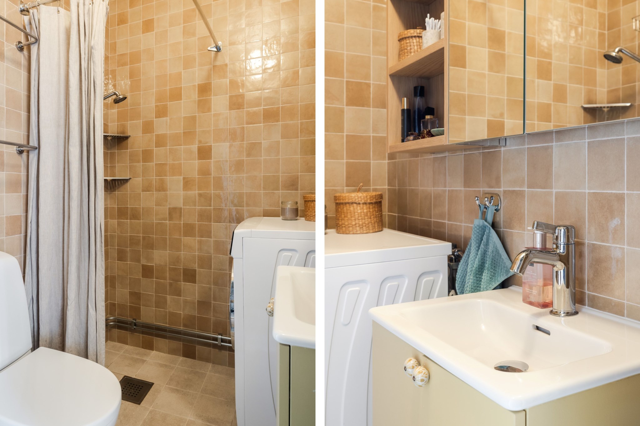 Helkaklat badrum inrett med wc, handfat med kommod, dusch samt spegelskåp och öppen förvaring i trä. Tvättmaskin.