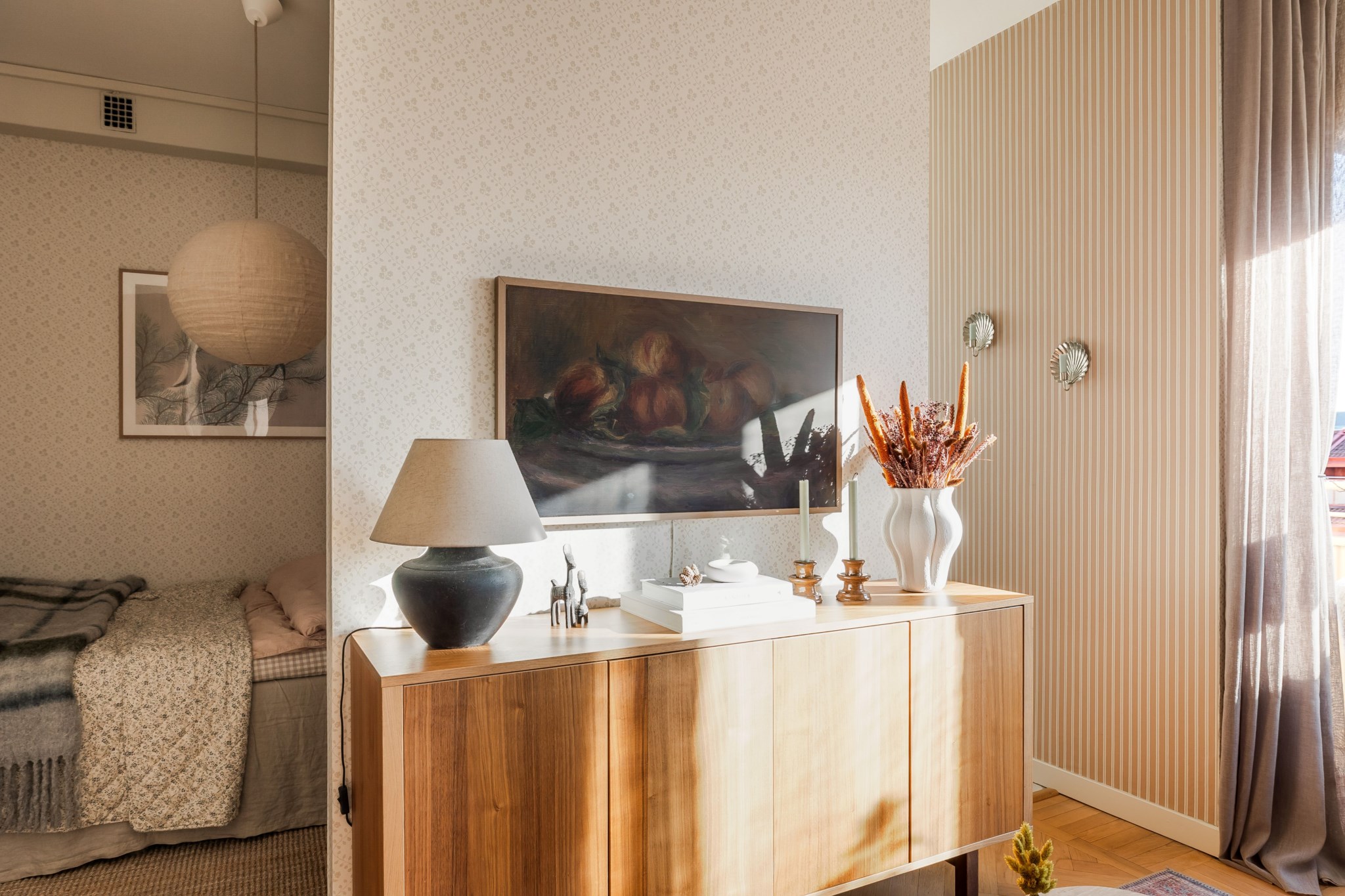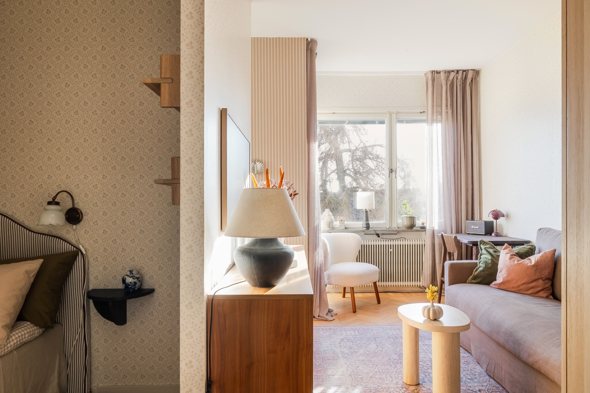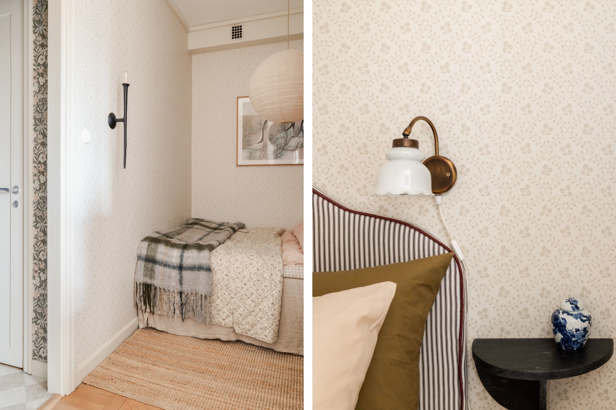 Mysig sovalkov med vackert tapetserade väggar och plats för säng och tillhörande sängbord.