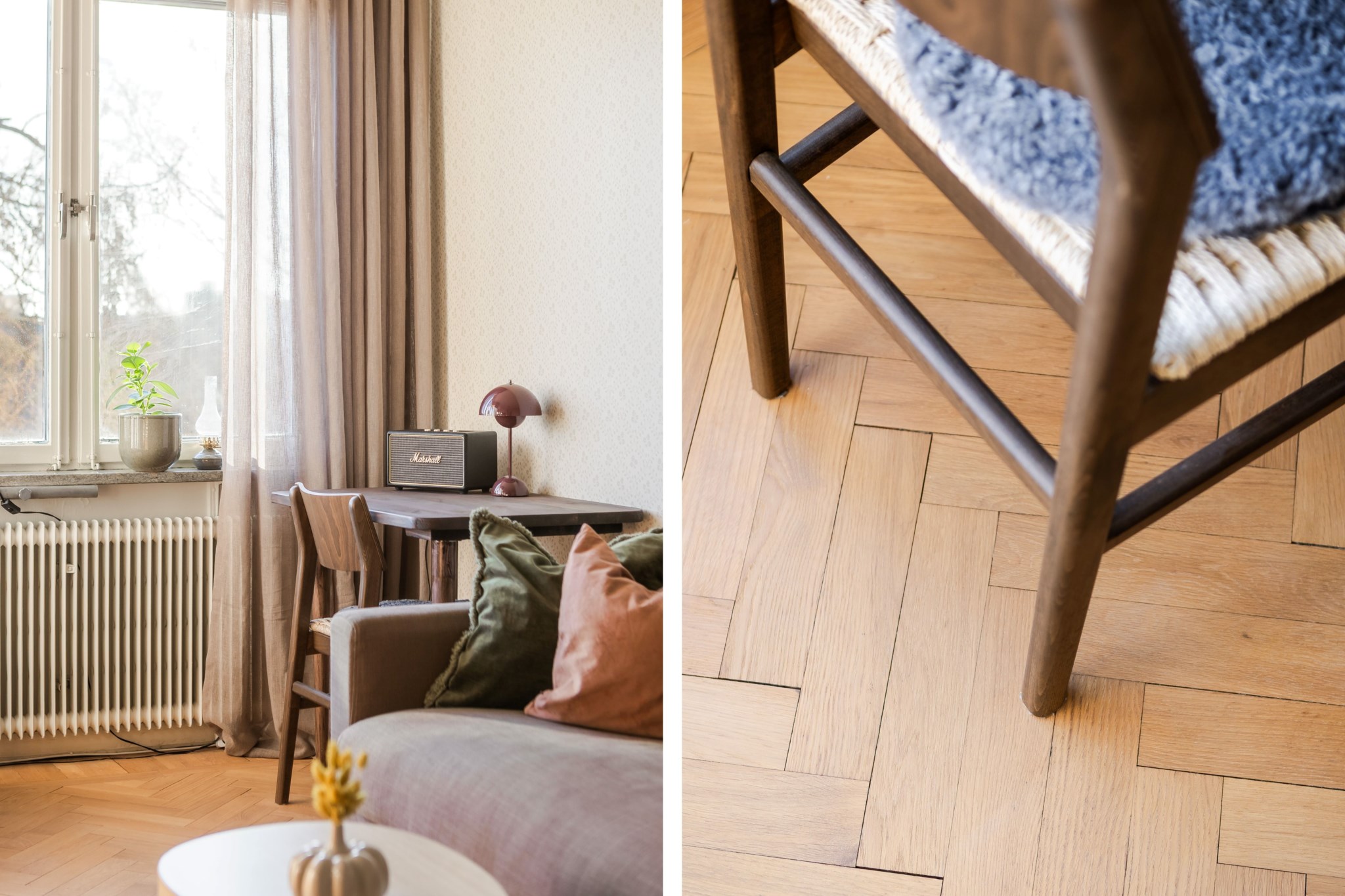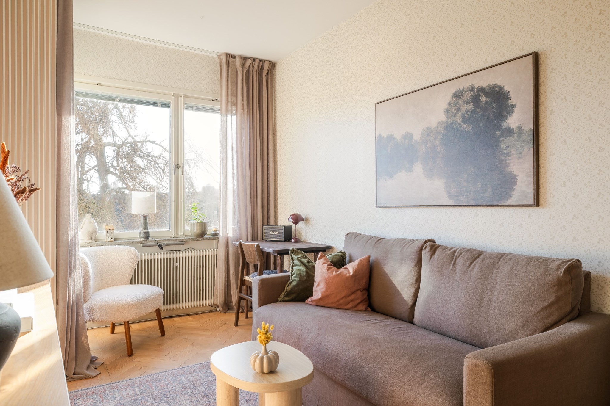 Trivsamt vardagsrum med plats för soffa och övrigt möblemang efter behov och smak. Generöst ljusinsläpp från stort fönsterparti samt utgång till bostadens balkong, som blir en naturlig förlängning av rummet under de varmare månaderna. Ljusmålade ytskikt och vacker fiskbensparkett.