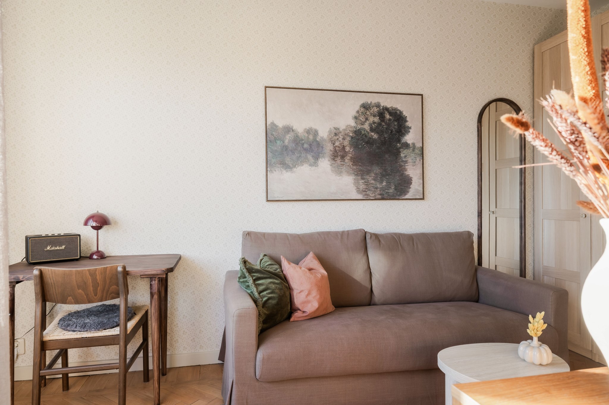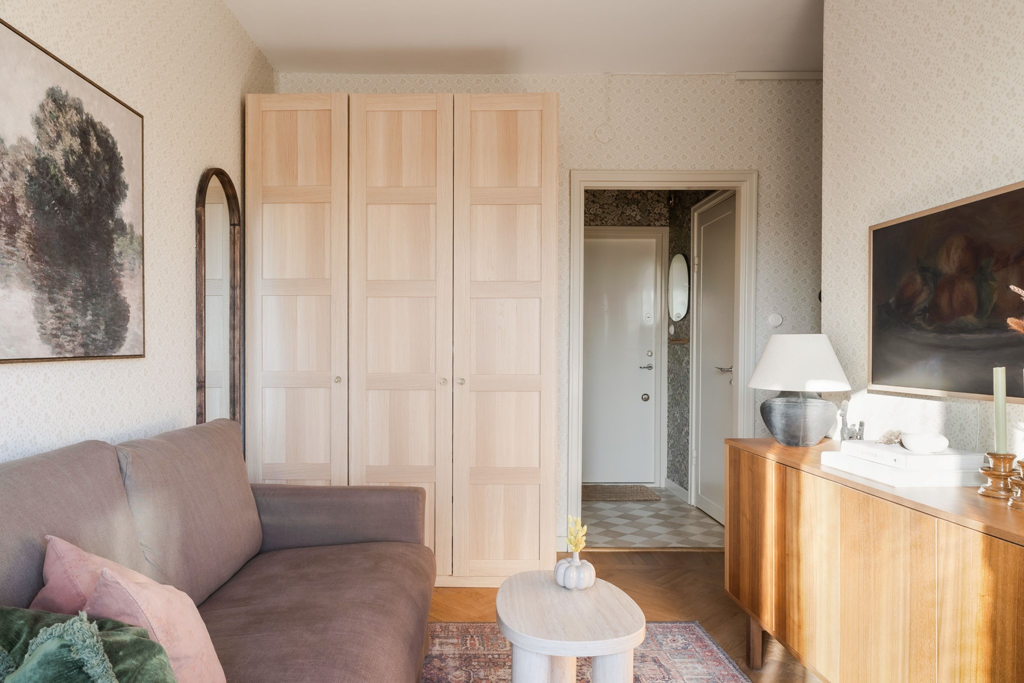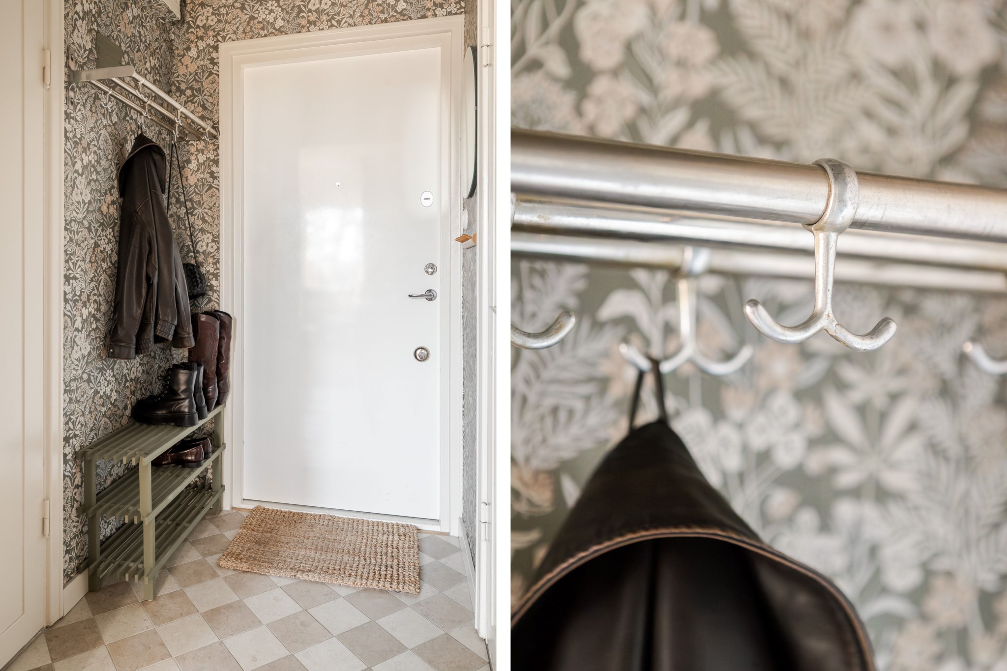 Välkomnande hall med vackert tapetserade väggar och ett charmigt schackrutigt stengolv. Plats för avhängning av ytterkläder direkt intill ytterdörren.