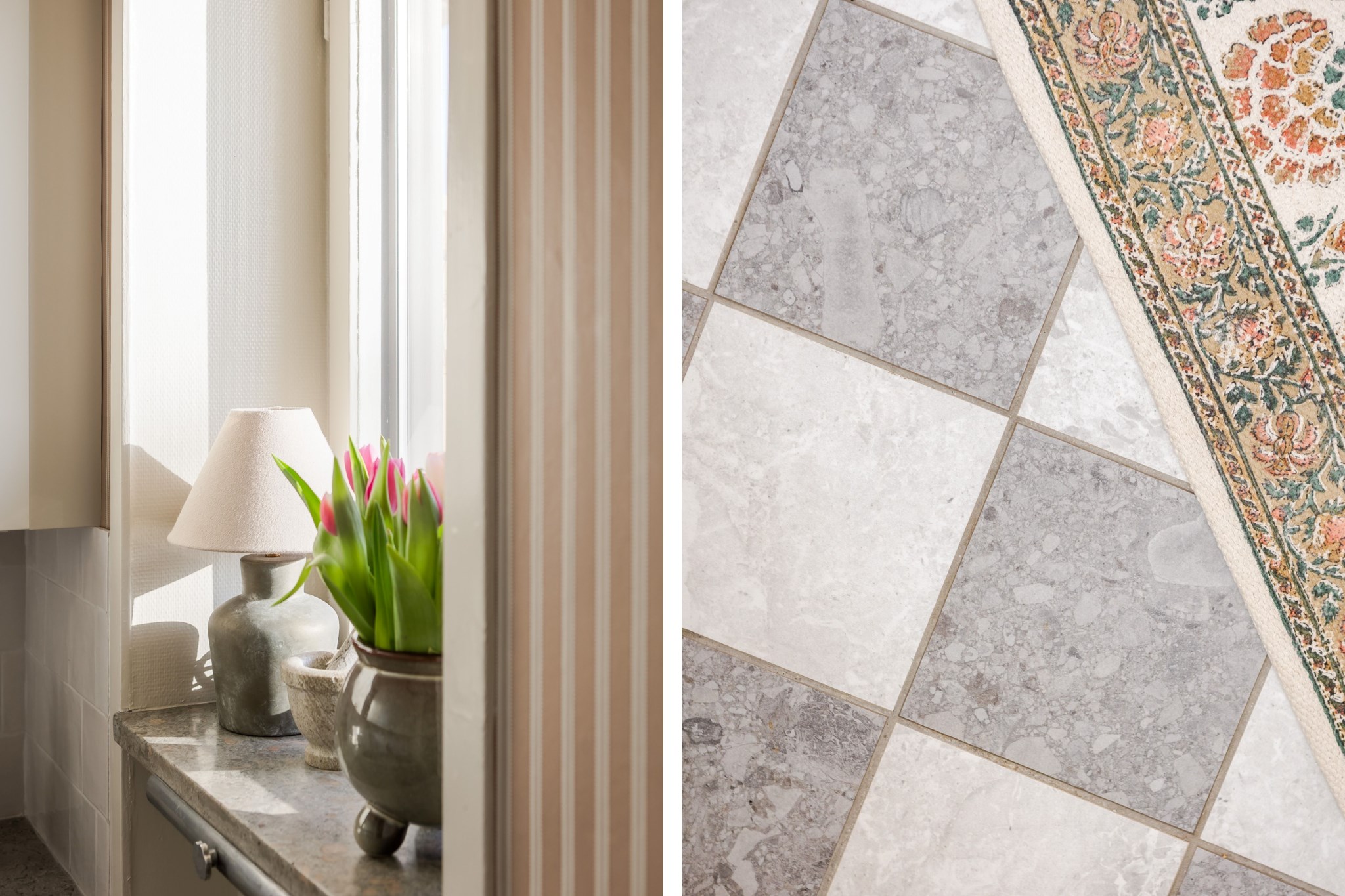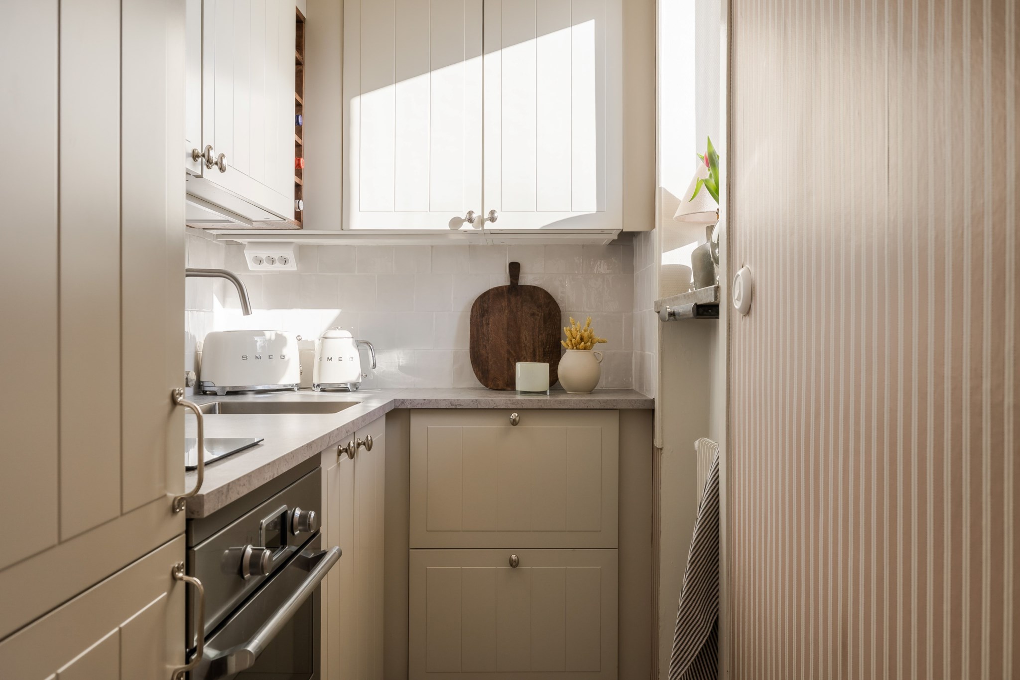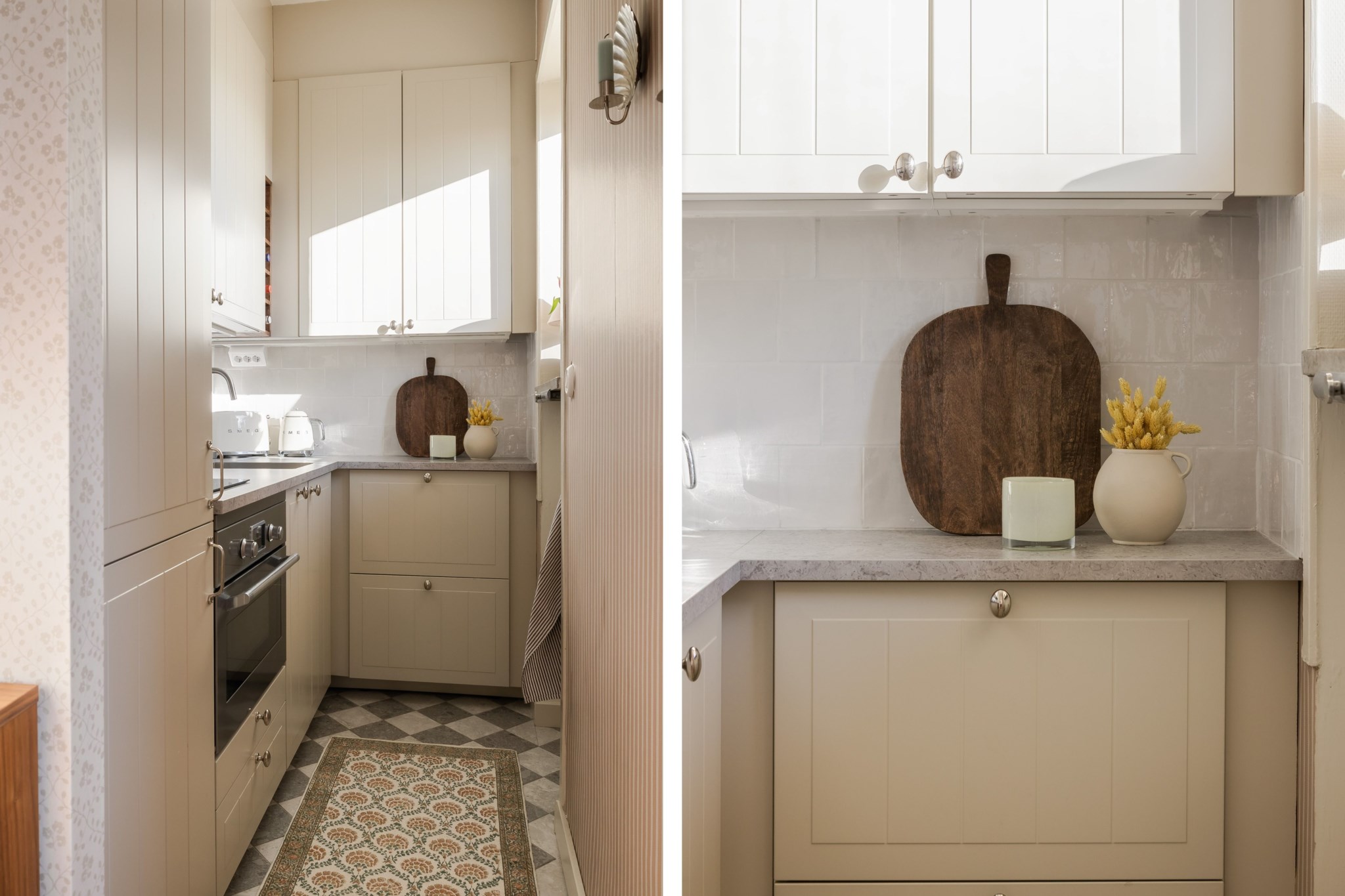 Stilrent kök med noggrant utvalda materialval, bland annat beiga köksluckor med struktur, vit kaklad väggpanel och marmorerad bänkskiva. Generöst ljusinsläpp från fönster. Kökets maskinella utrustning bestå av kyl/frys, spishäll och ugn. Neutrala ytskikt och vackert schackrutigt golv kompletterar kökets eleganta uttryck.