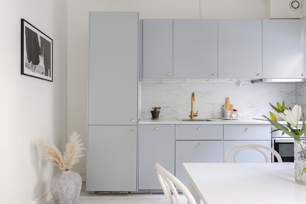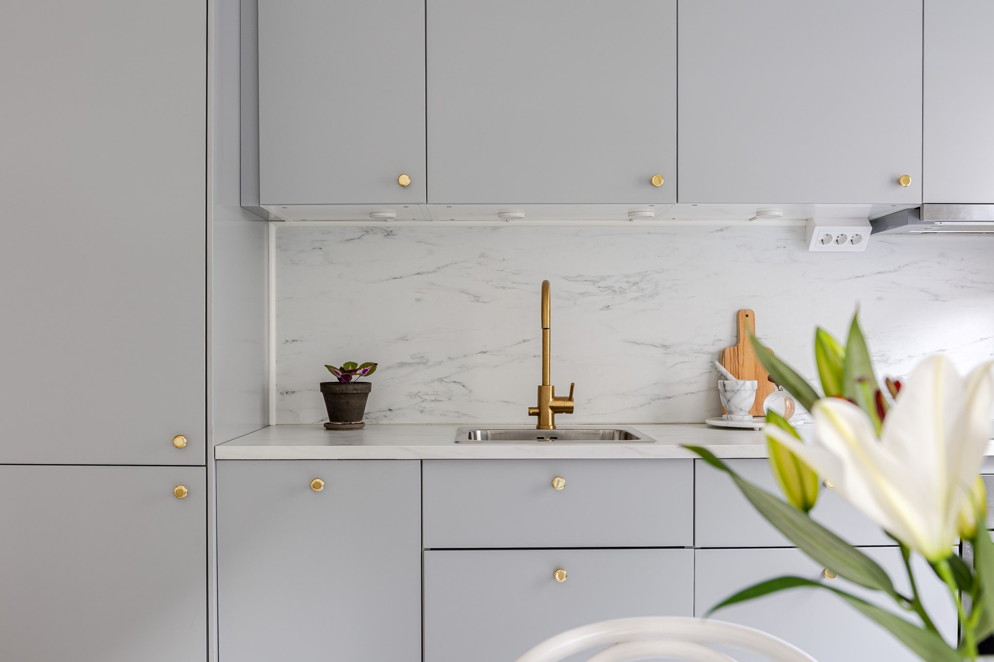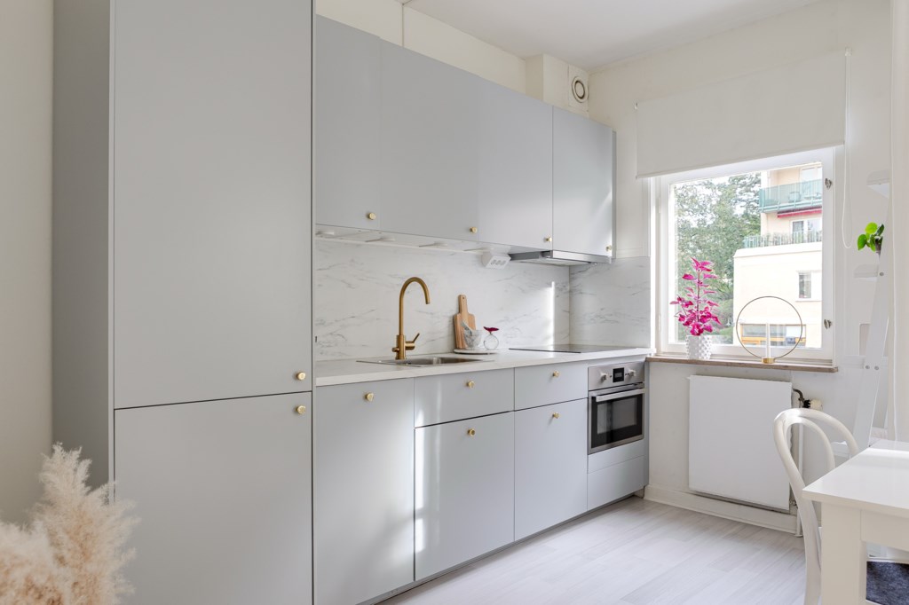 Modernt kök med öppen planlösning mot allrummet. Köksskåpen är försedda med ljusgråa, släta luckor samt en marmorerad bänkskiva som elegant sträcker sig upp på väggpanelen. Kökets maskinella utrustning består av kyl/frys, spishäll, fläkt, ugn och diskmaskin. Ljusmålade ytskikt och ljust golv.