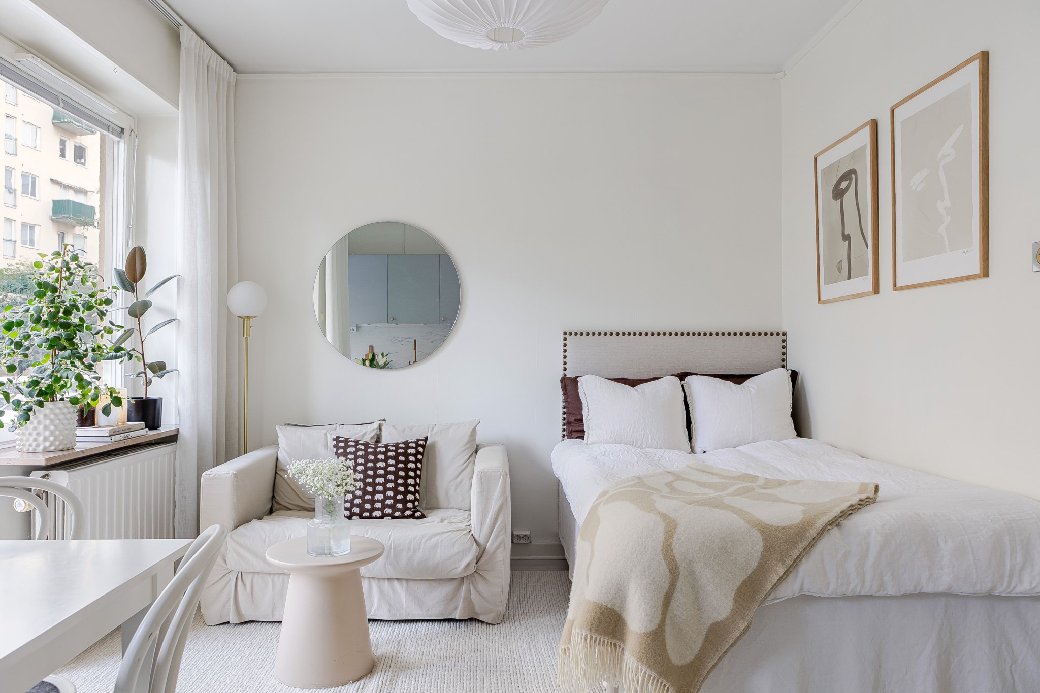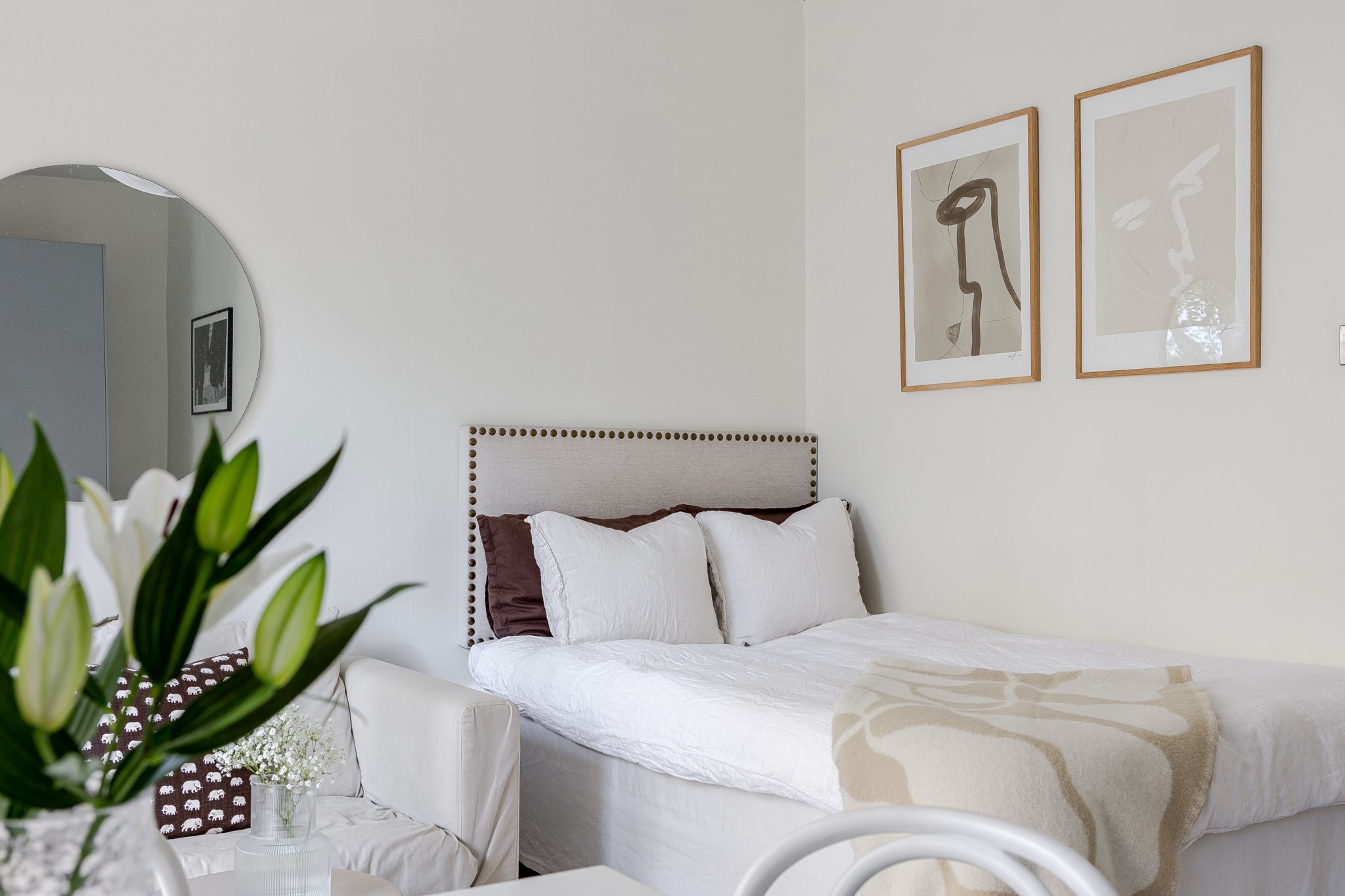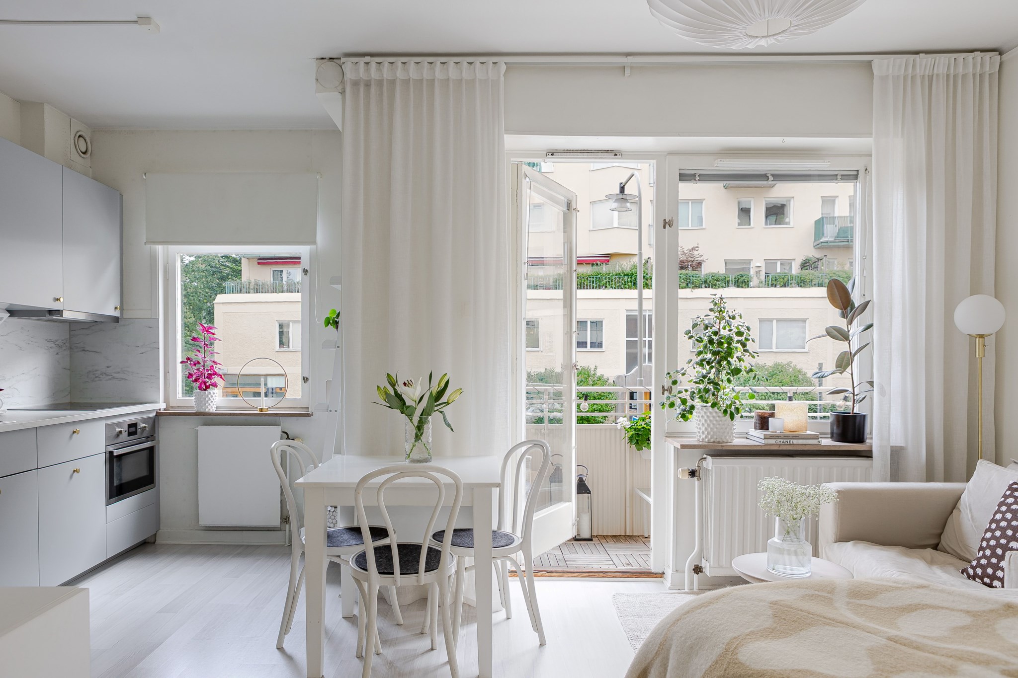 Välplanerat allrum med plats för säng, soffa, matgrupp och annan möblering efter behov och smak. De stora fönstren släpper in rikligt med naturligt ljus och öppningen mot bostadens balkong förlänger rummet på ett trevligt sätt. Ljusmålade ytskikt och ljust golv.