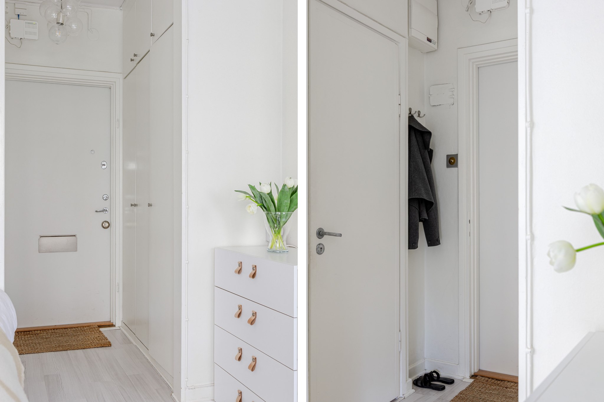 Välkomnande hall med bra förvaringsmöjligheter i flera rymliga garderober utrustade med överskåp. Ljusmålade ytskikt och ljust golv.