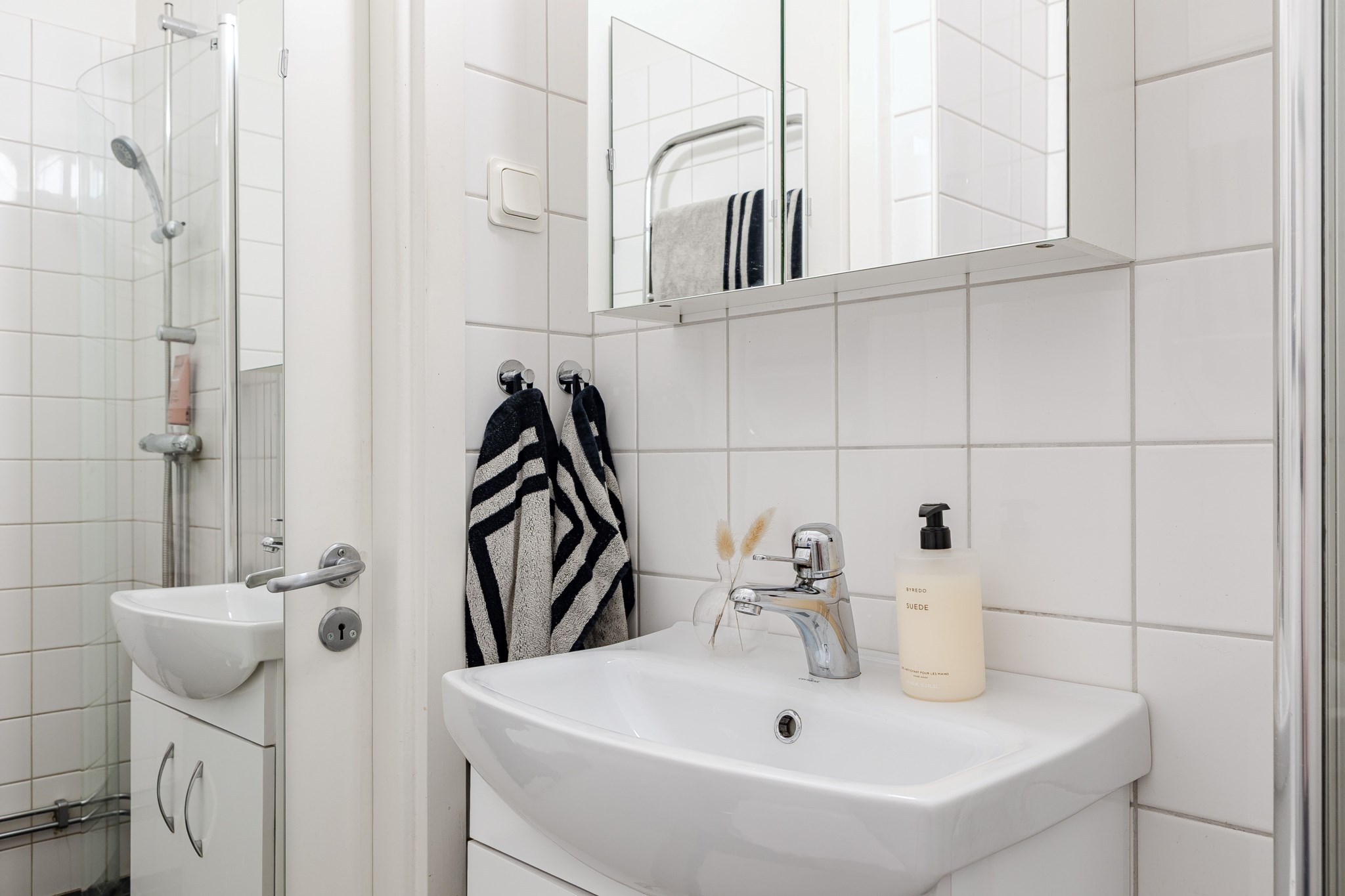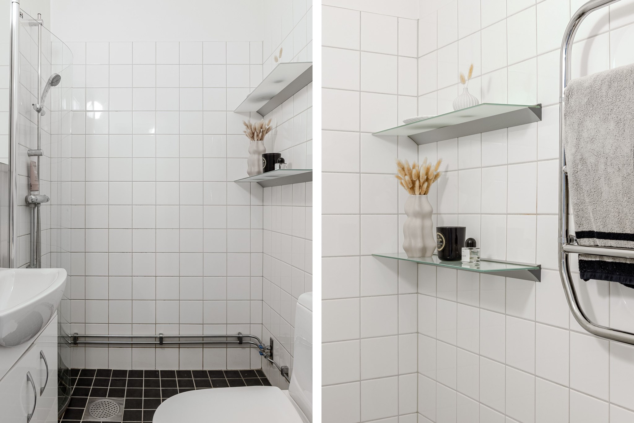 Fräscht badrum med ljust kakel och mörkt klinkergolv. Badrummet är inrett med WC, handfat med kommod, spegelskåp, handdukstork samt dusch.