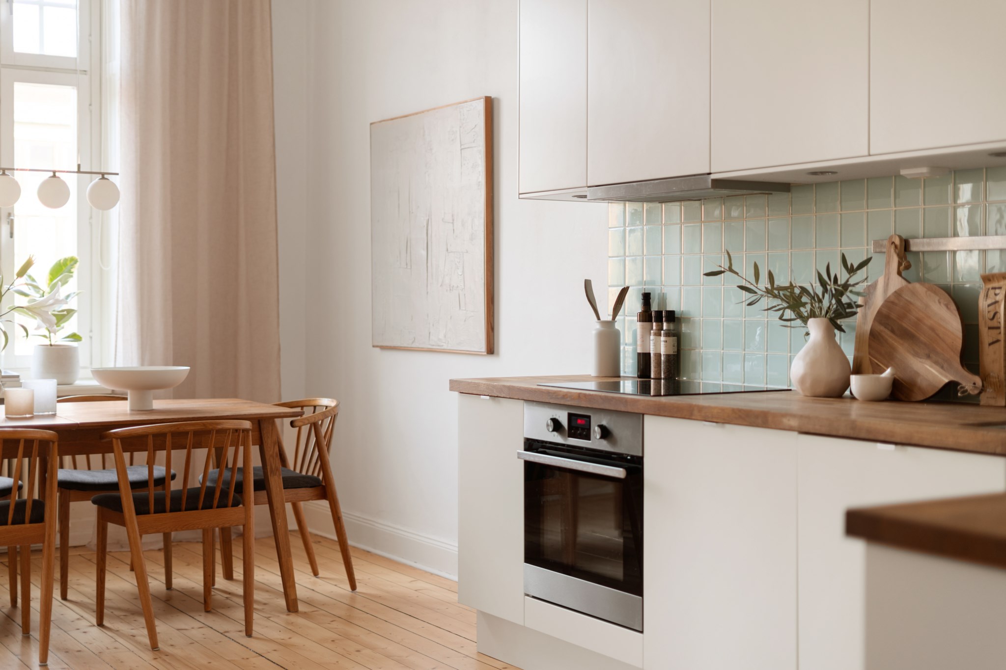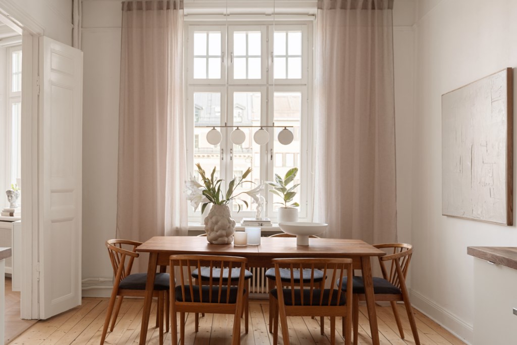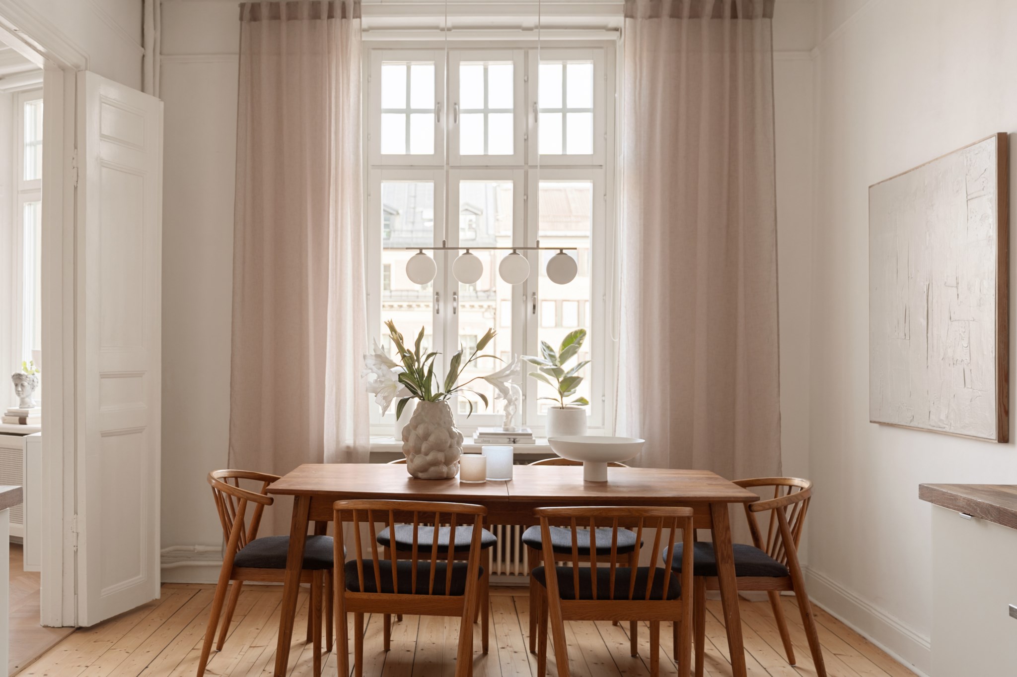 Ljust och trivsamt kök med klassisk karaktär och generöst ljusinsläpp från stora fönsterpartier. Här finns gott om plats för matbord vid fönstret, vilket skapar en naturlig samlingspunkt för både vardag och umgänge. Ljusa ytskikt, trägolv och generös takhöjd förstärker den luftiga känslan.