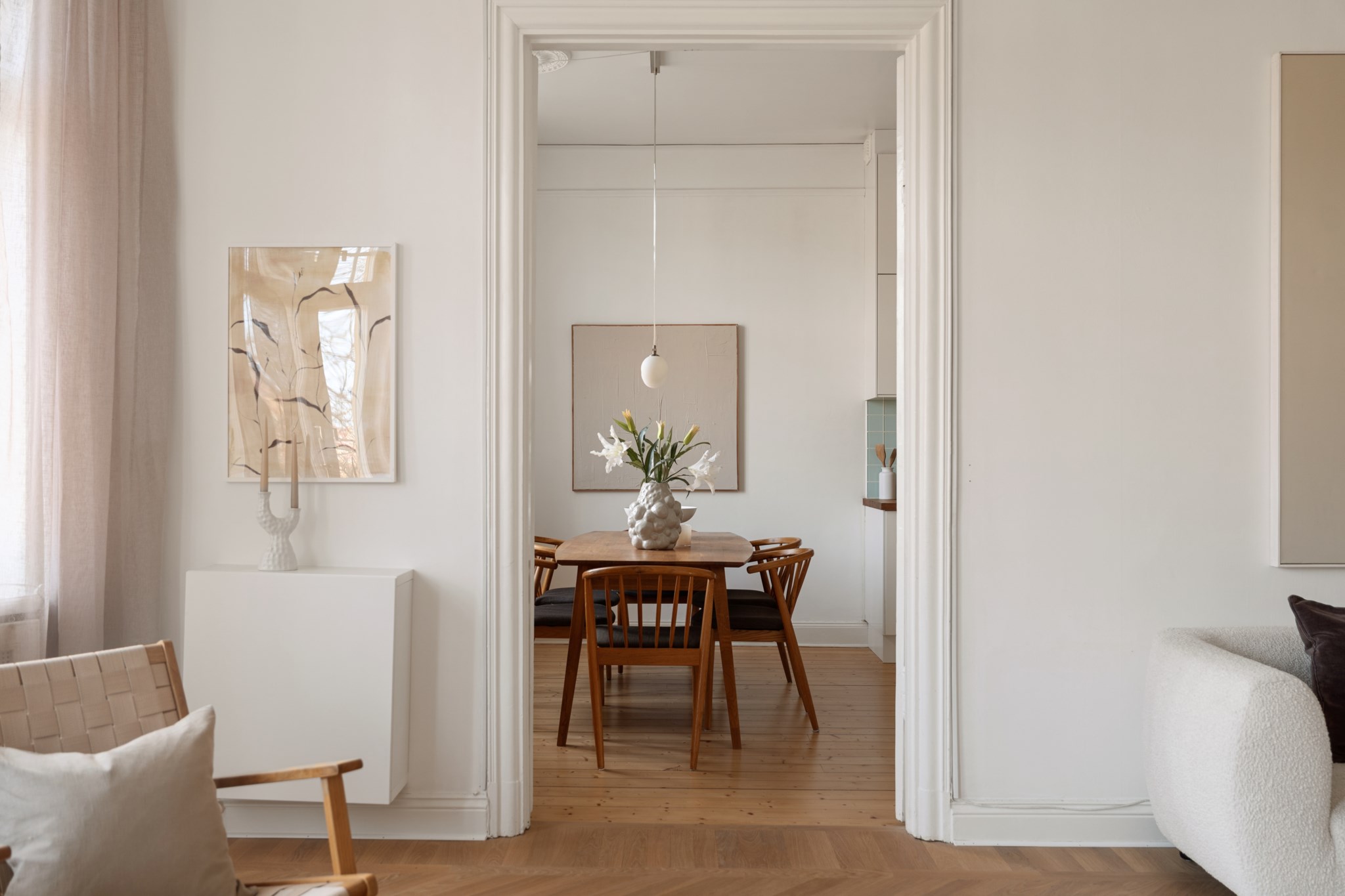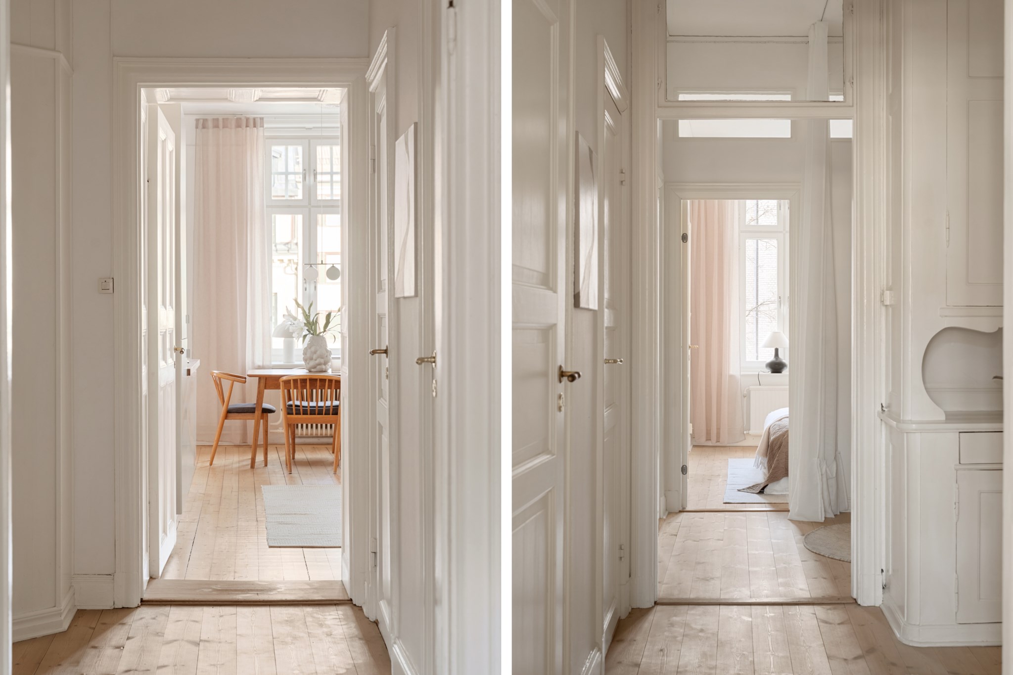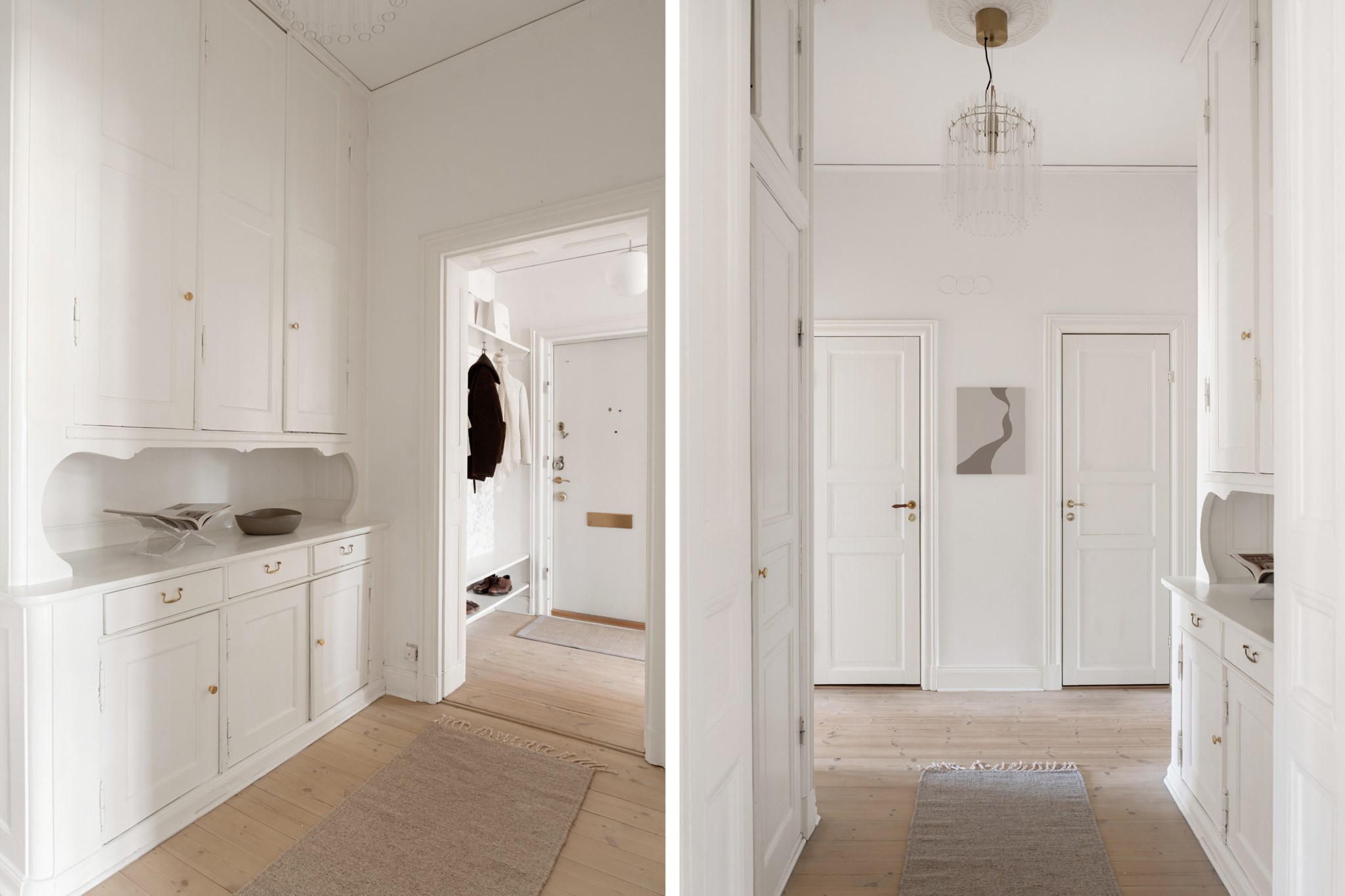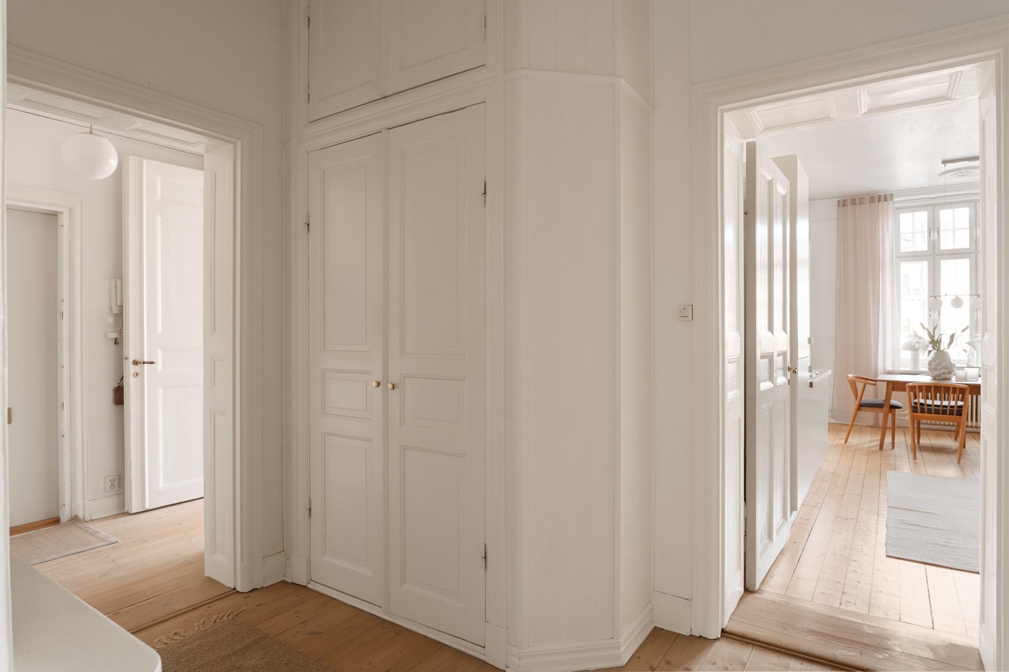 Välkomnande och ljus hall med klassisk karaktär som sätter tonen för bostaden redan vid entrén. Här möts man av ljusa väggar, vackert trägolv och generös takhöjd som skapar en luftig känsla. Goda förvaringsmöjligheter erbjuds genom platsbyggda garderober och skåp i tidstypisk stil, vilket ger både funktion och charm. Hallen binder samman bostadens rum på ett naturligt sätt och erbjuder en praktisk avhängningsyta nära entrén.