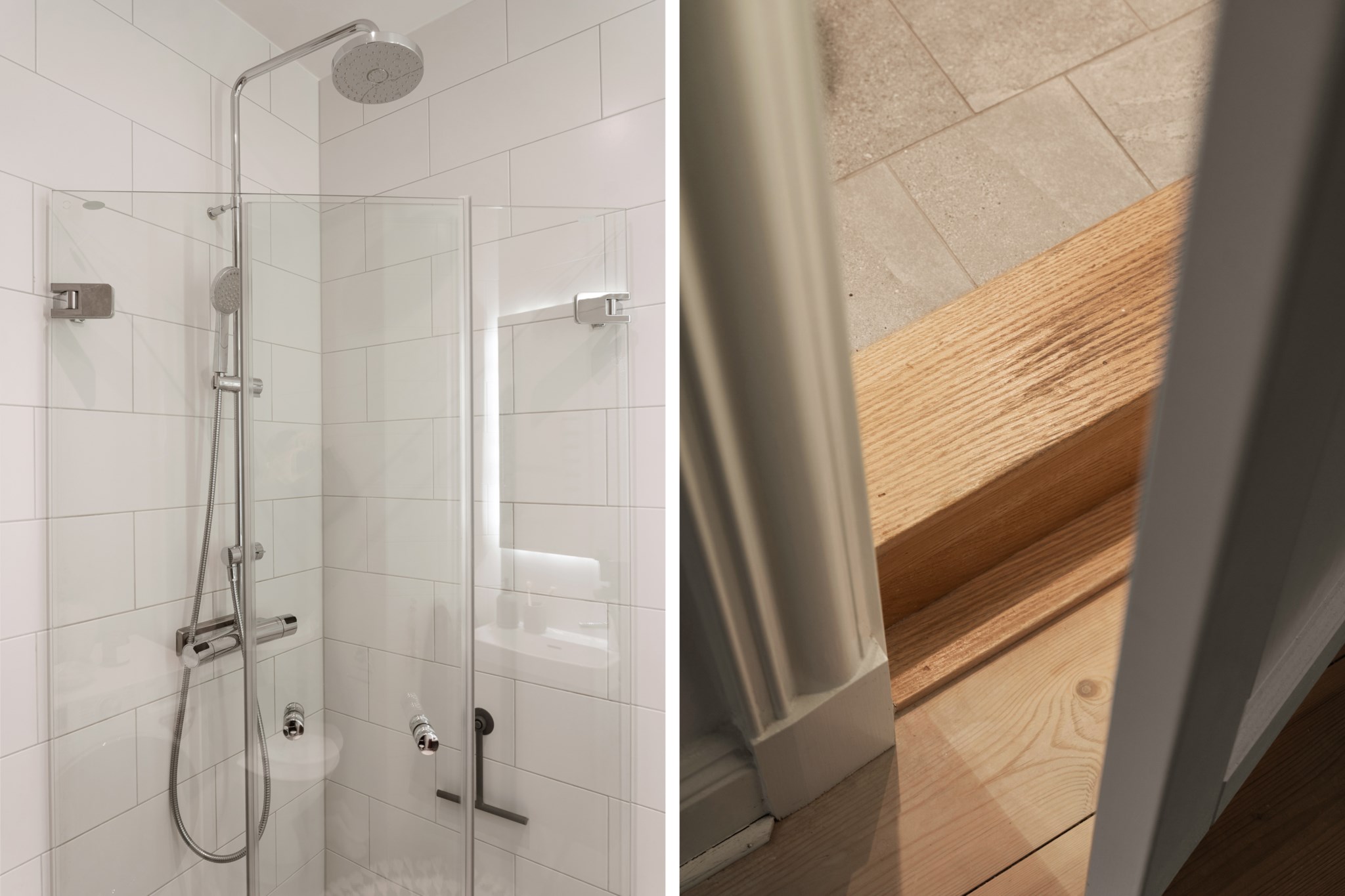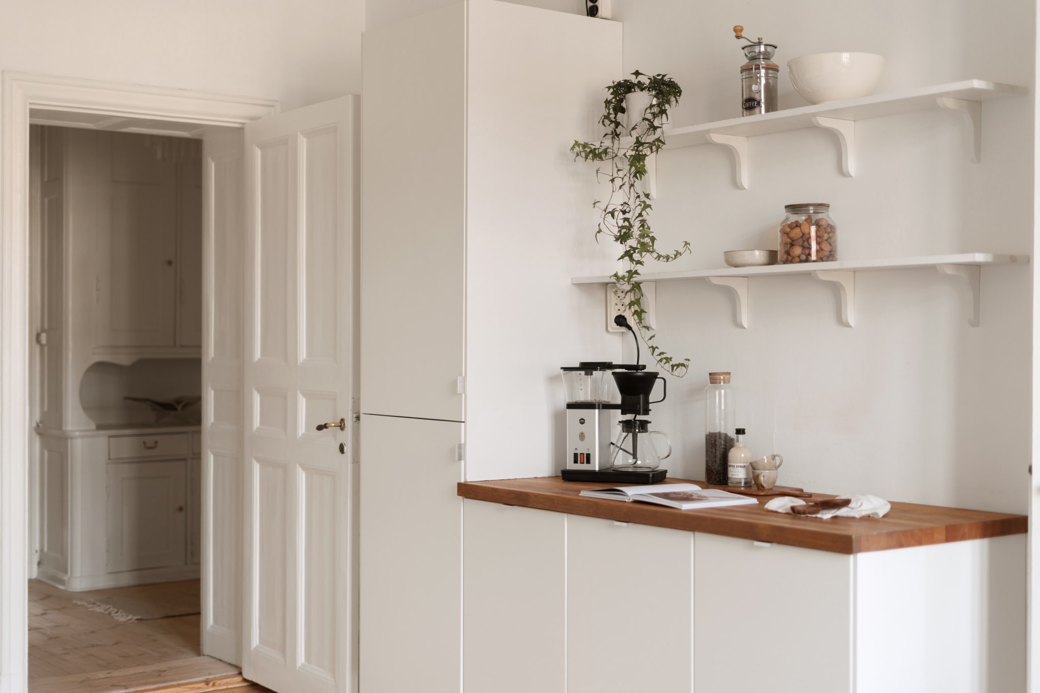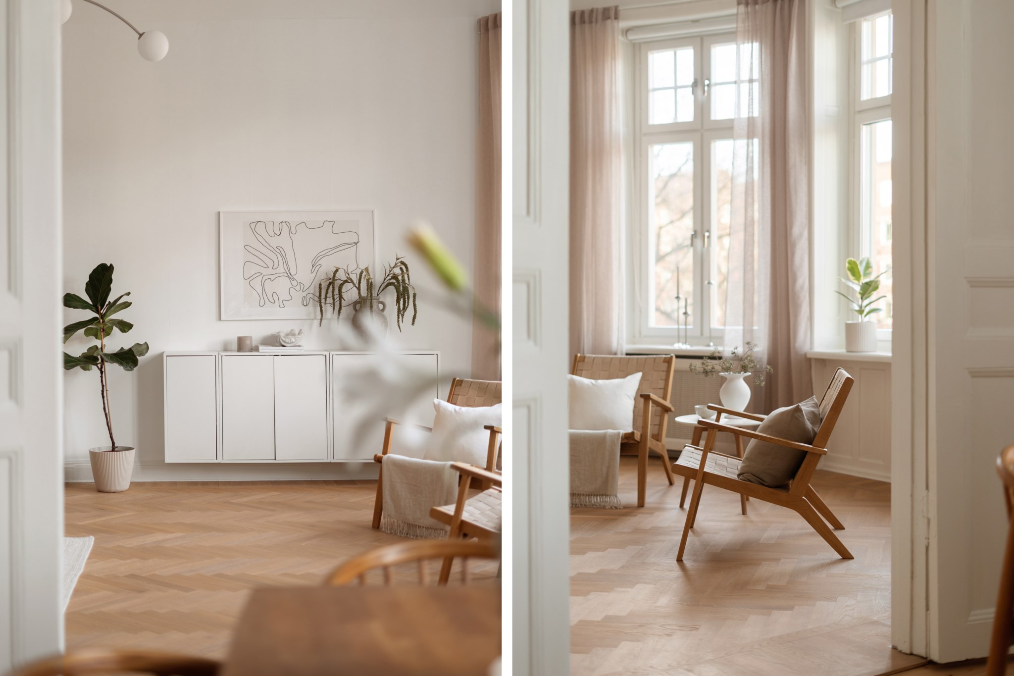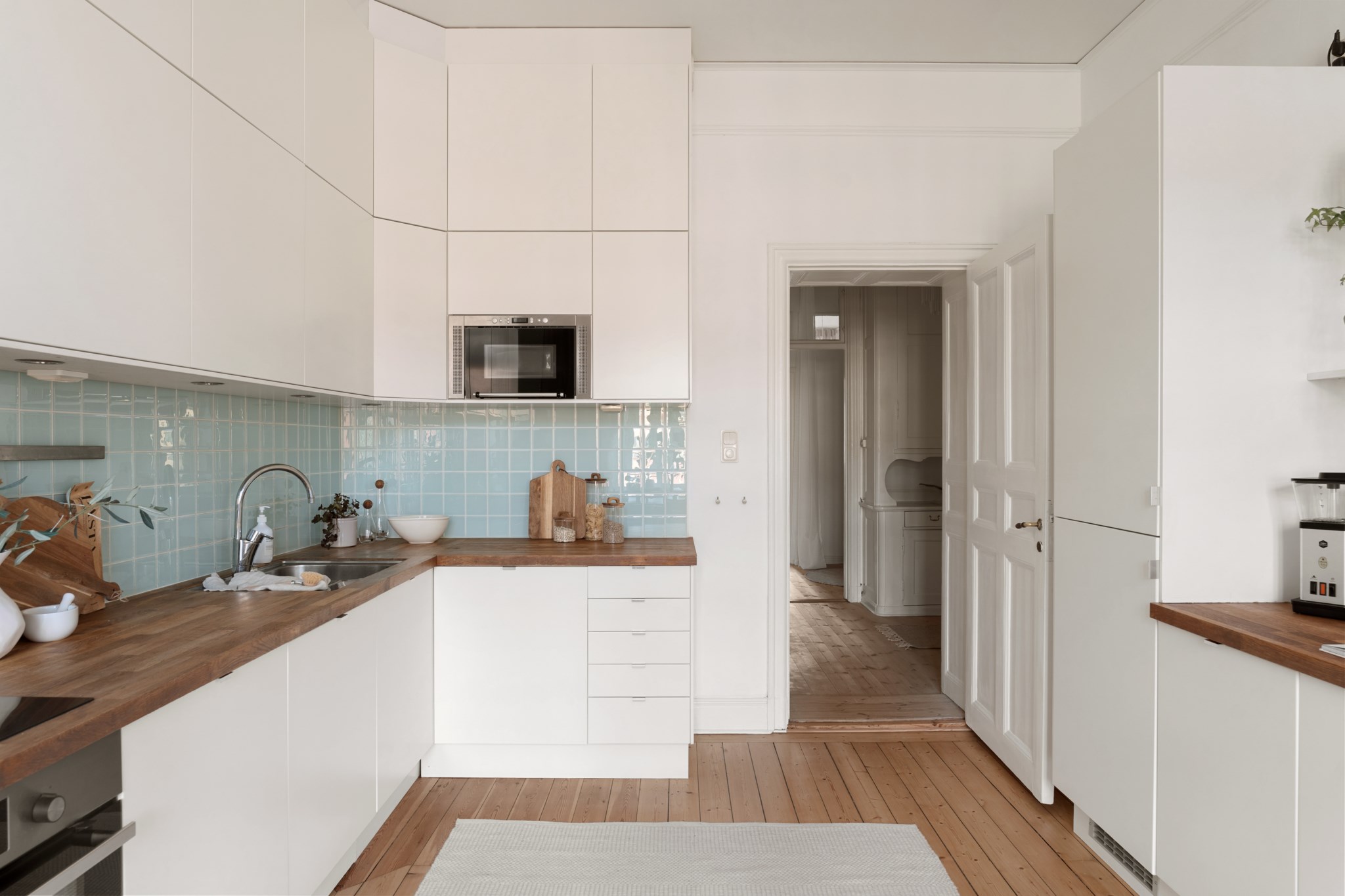 Välkomnande och ljus hall med klassisk karaktär som sätter tonen för bostaden redan vid entrén. Här möts man av ljusa väggar, vackert trägolv och generös takhöjd som skapar en luftig känsla. Goda förvaringsmöjligheter erbjuds genom platsbyggda garderober och skåp i tidstypisk stil, vilket ger både funktion och charm. Hallen binder samman bostadens rum på ett naturligt sätt och erbjuder en praktisk avhängningsyta nära entrén.
