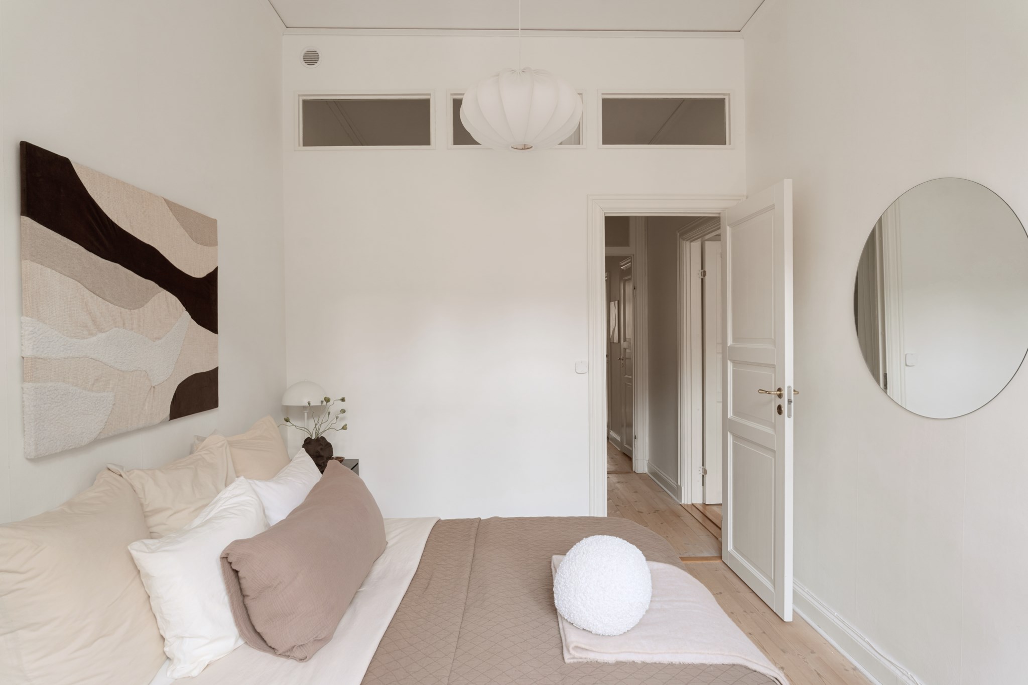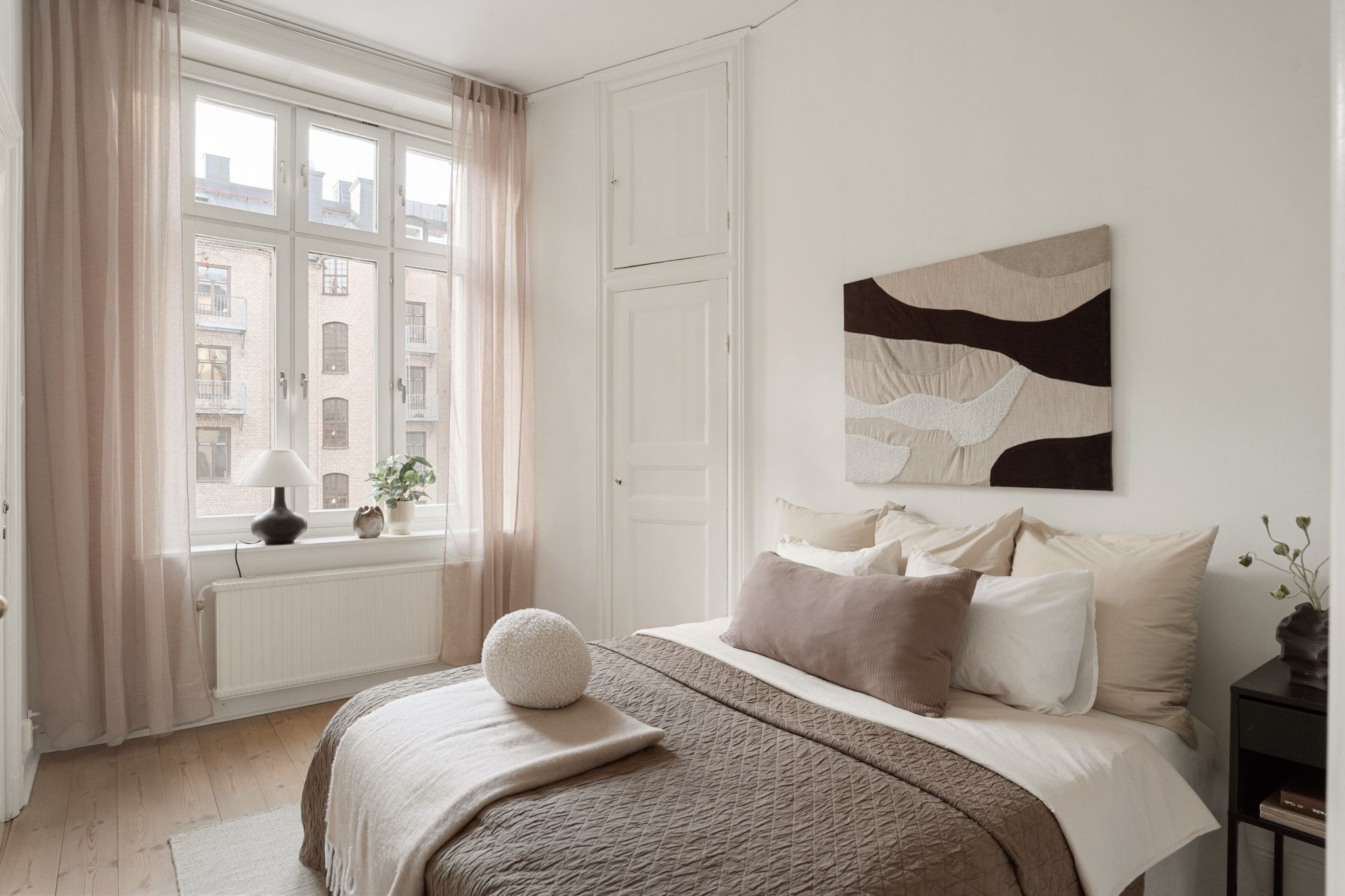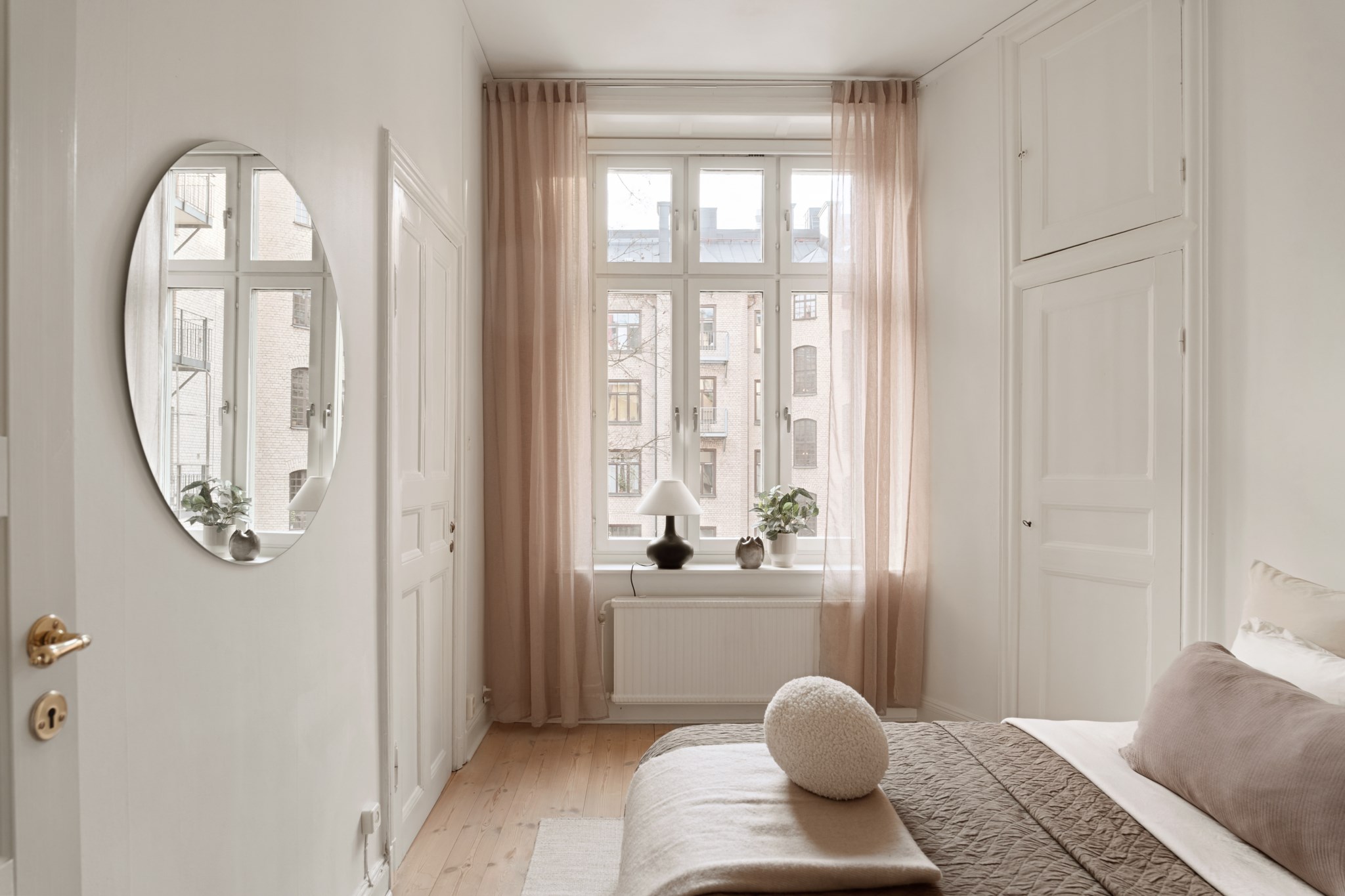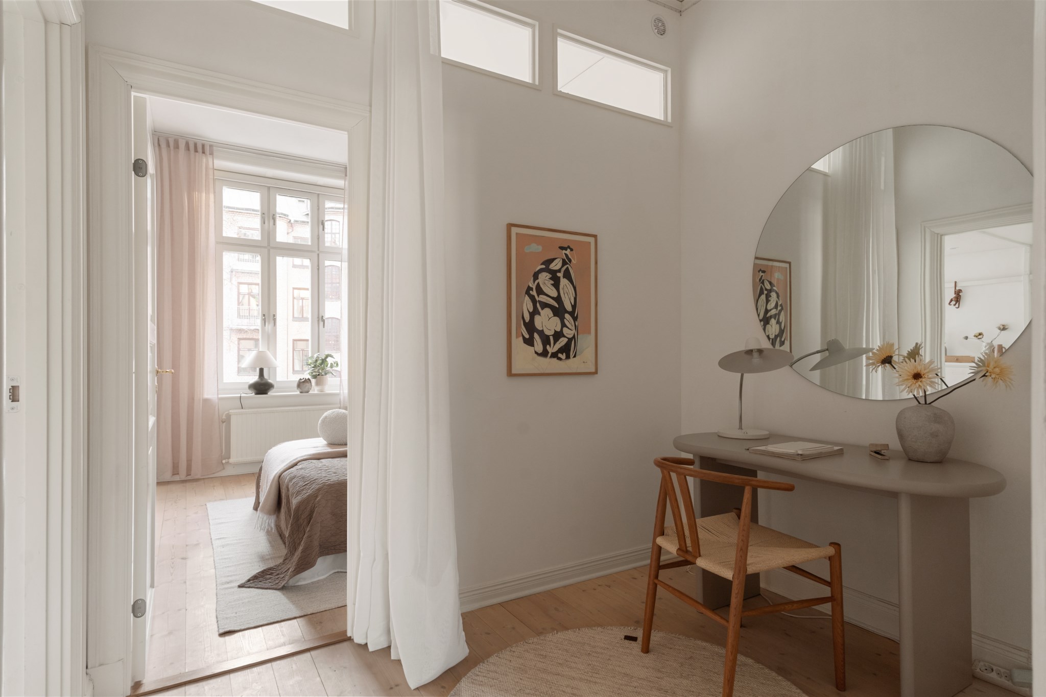Rofyllt sovrum med fint ljusinsläpp från stort fönster mot gårdsmiljö. Här finns plats för dubbelsäng samt ytterligare möblering efter behov. Intill rummet finns en praktisk klädkammare som erbjuder goda förvaringsmöjligheter. Ljusa ytskikt, trägolv och generös takhöjd skapar en lugn och harmonisk atmosfär.