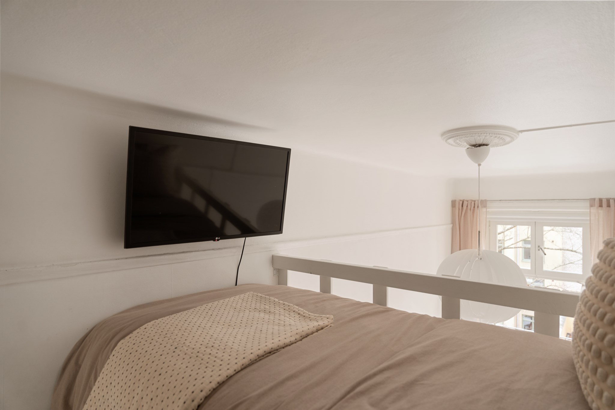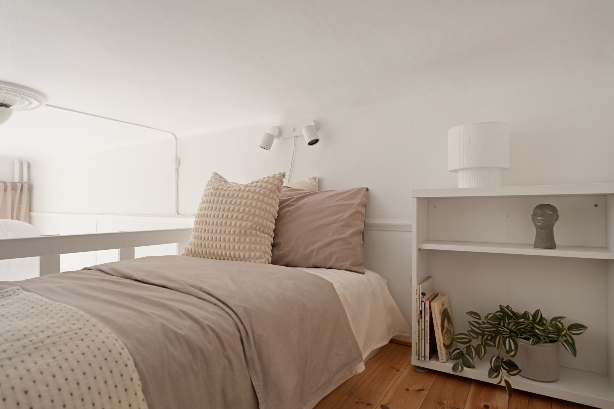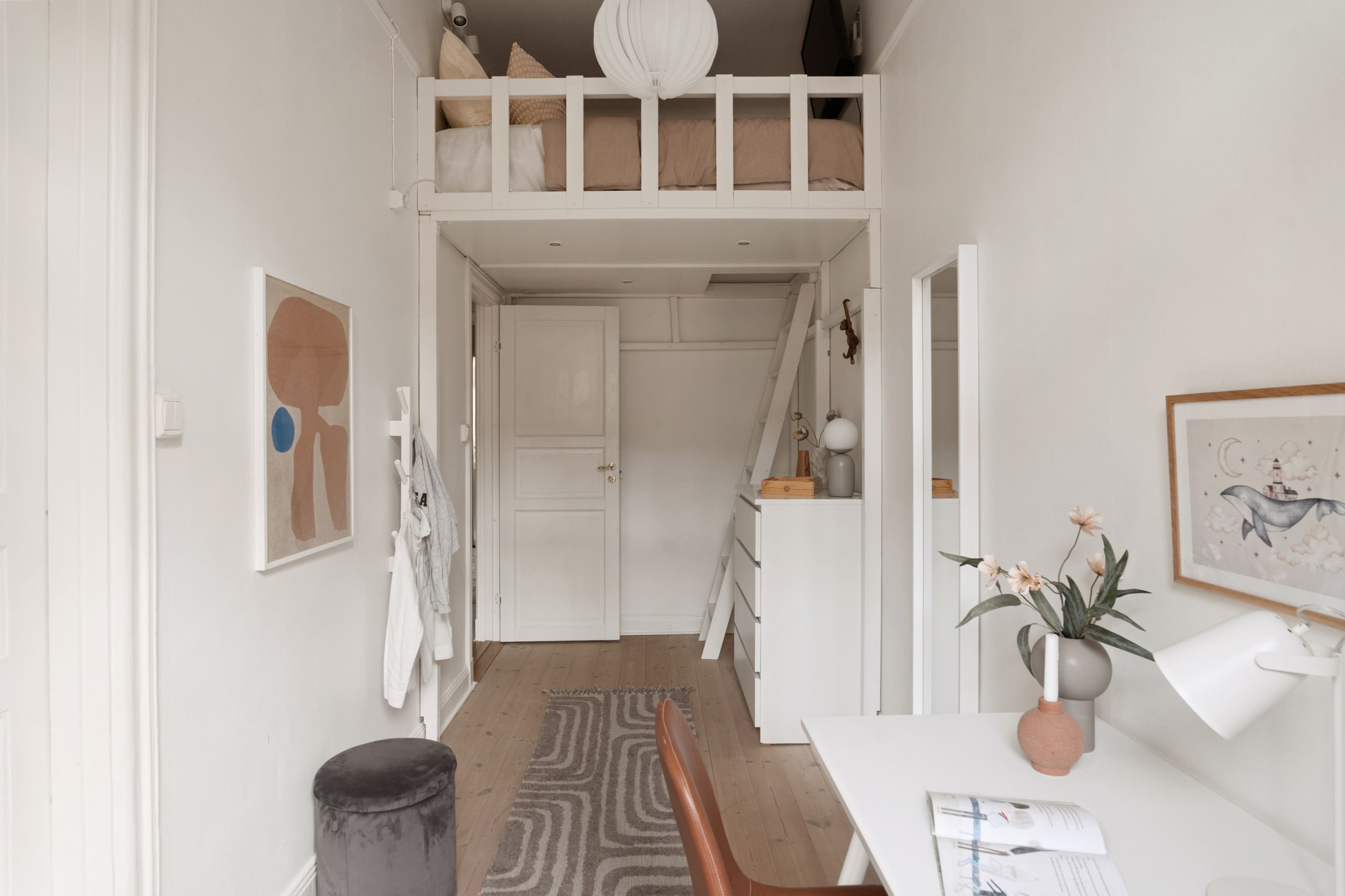 Flexibelt rum med utgång till balkong mot lugn gårdsmiljö. Rummet passar väl som sovrum, arbetsrum eller kombinerat gästrum och kontor. Den platsbyggda loftdelen skapar extra sovplats och frigör golvyta, vilket ger en praktisk och yteffektiv disposition. Ljusa ytskikt och trägolv bidrar till en enhetlig och trivsam känsla.