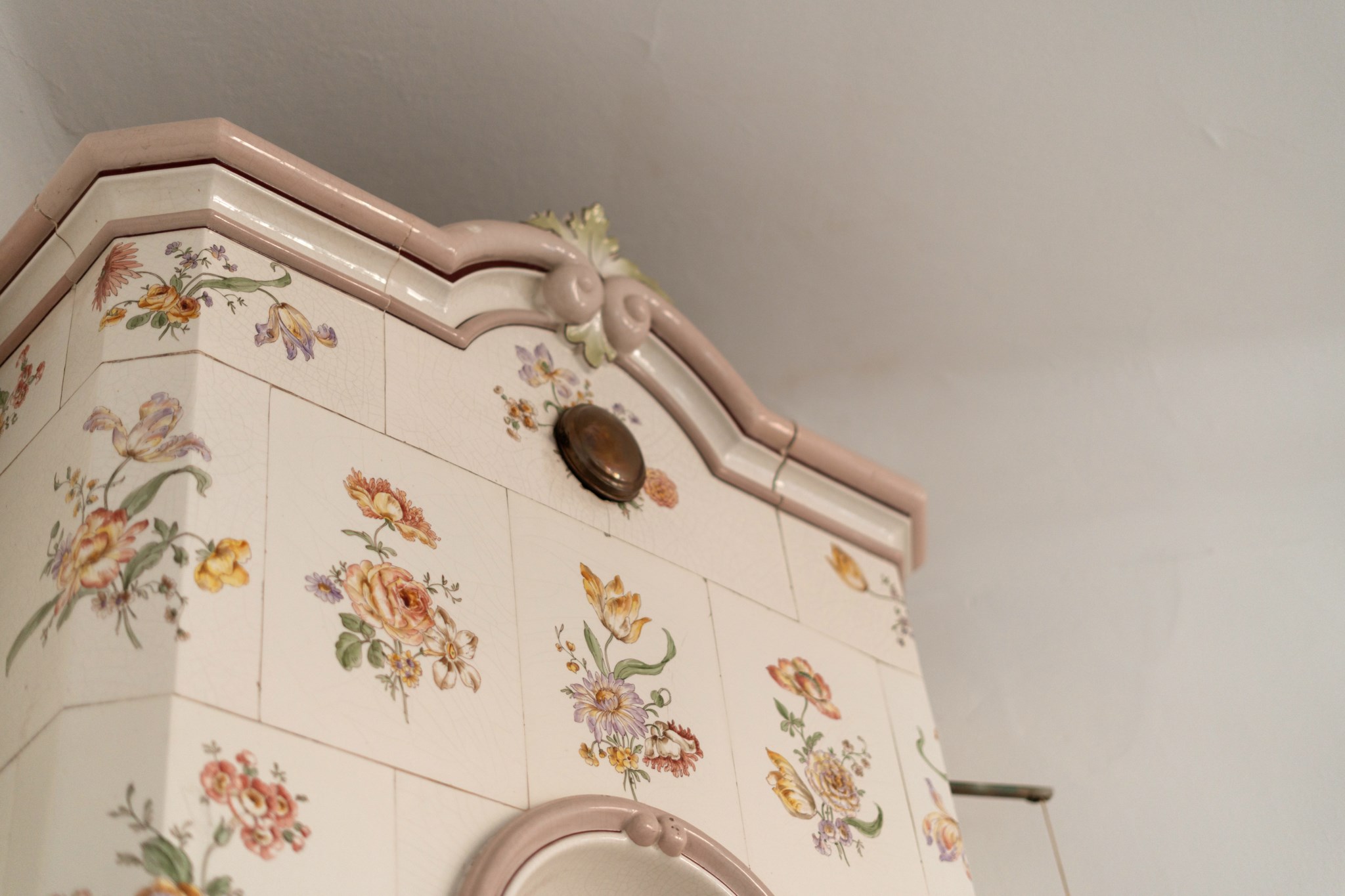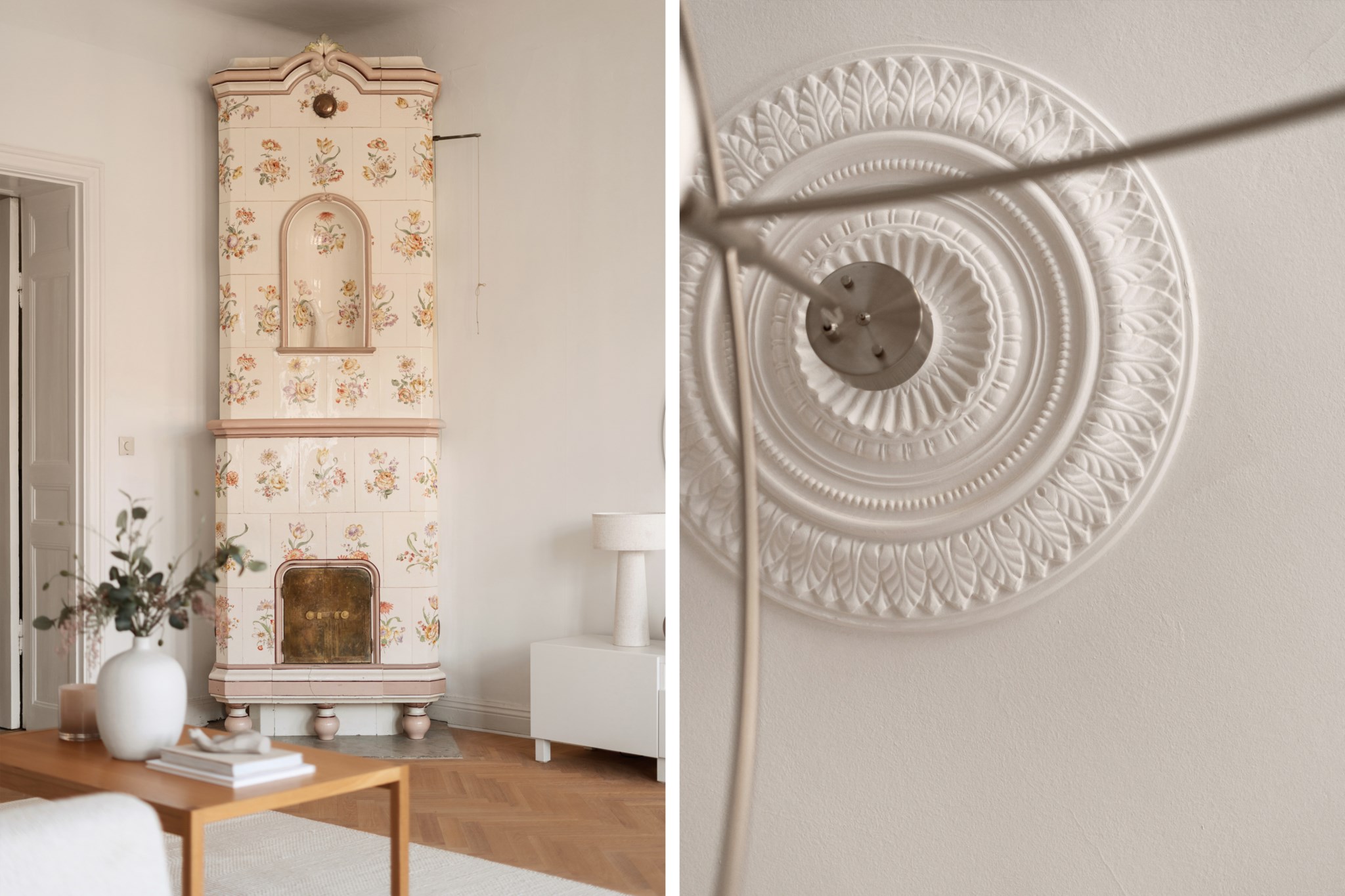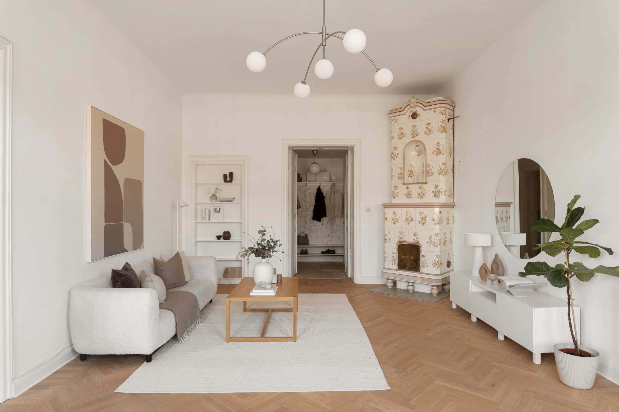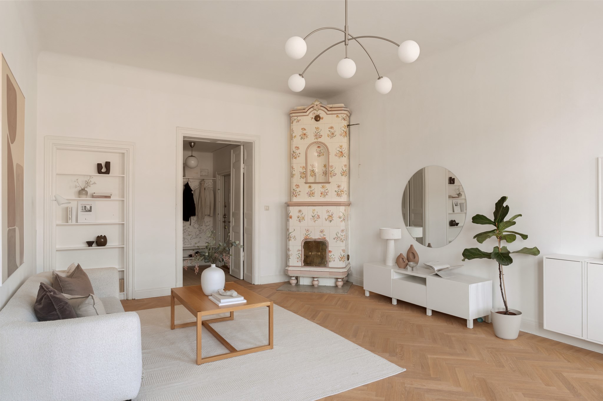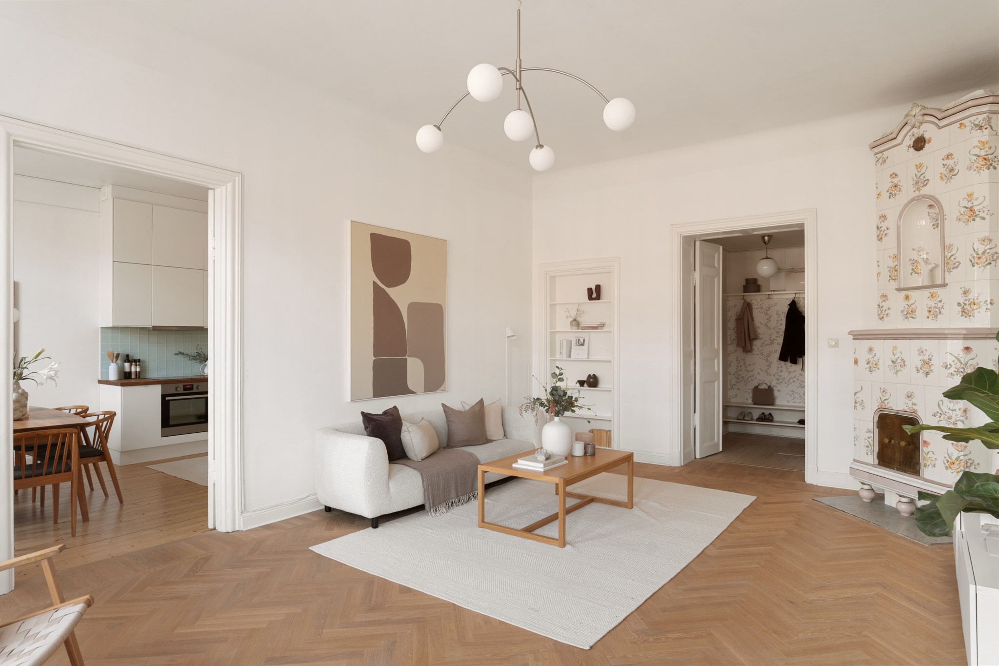 Den ståtliga kakelugnen utgör ett vackert blickfång och bidrar till rummets charm och atmosfär. Här finns gott om plats för både soffgrupp och sociala sammanhang, med en öppen och inbjudande känsla mot intilliggande rum som skapar fina siktlinjer genom bostaden.Kök