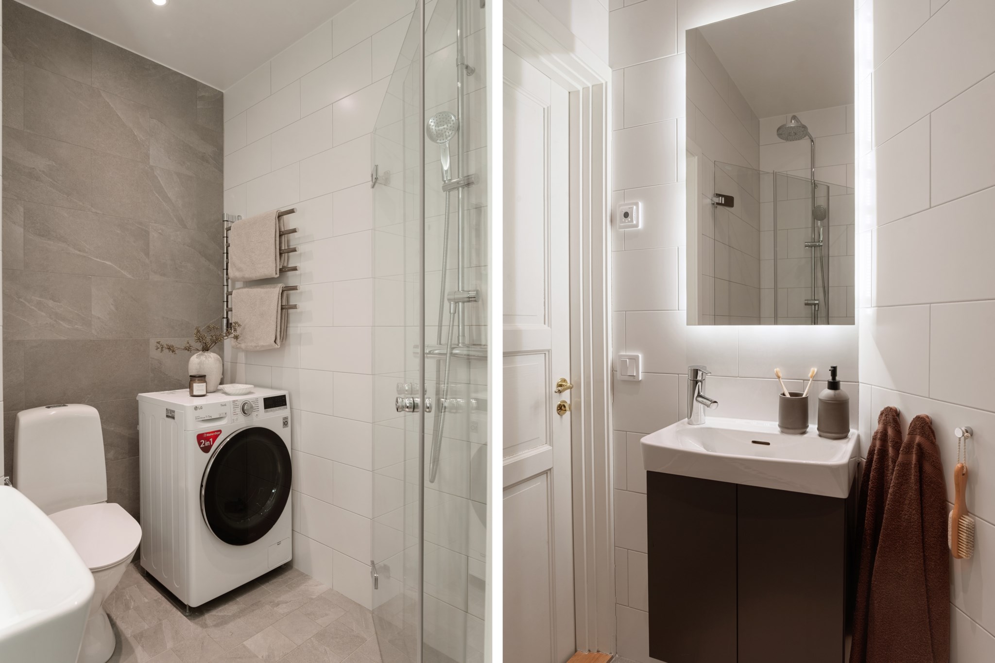 Stilrent badrum med helkaklade väggar och klinkergolv i neutrala kulörer. Badrummet är utrustat med dusch bakom glasvägg, wc, handfat med kommod samt spegel med belysning. Här finns även tvättmaskin som bidrar till god vardagskomfort. Handdukstork och praktiska förvaringsytor kompletterar rummet.