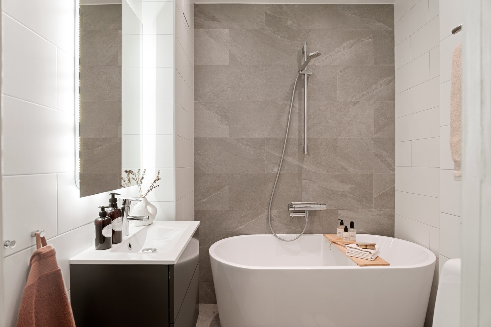Helkaklat badrum i stilrena, neutrala kulörer utrustat med badkar, wc samt handfat med kommod och spegel med belysning. Handdukstork bidrar till god komfort och en funktionell vardag. Ett välplanerat badrum som erbjuder både avkoppling och praktisk användning.