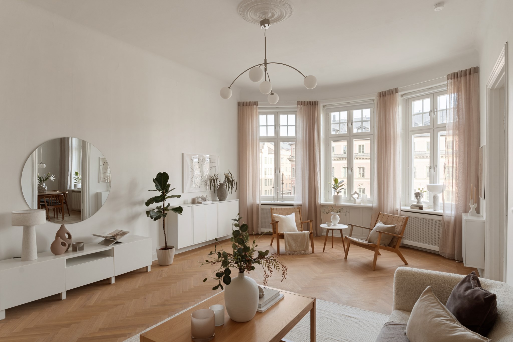 Representativt och mycket ljust vardagsrum med vackra sekelskiftesdetaljer och generösa sällskapsytor. Det stora burspråket med höga fönsterpartier släpper in rikligt med dagsljus och skapar en naturlig plats för sittgrupp eller läshörna. Rummet präglas av elegant fiskbensparkett, hög takhöjd och dekorativ takrosett som tillsammans förstärker bostadens tidstypiska karaktär.
