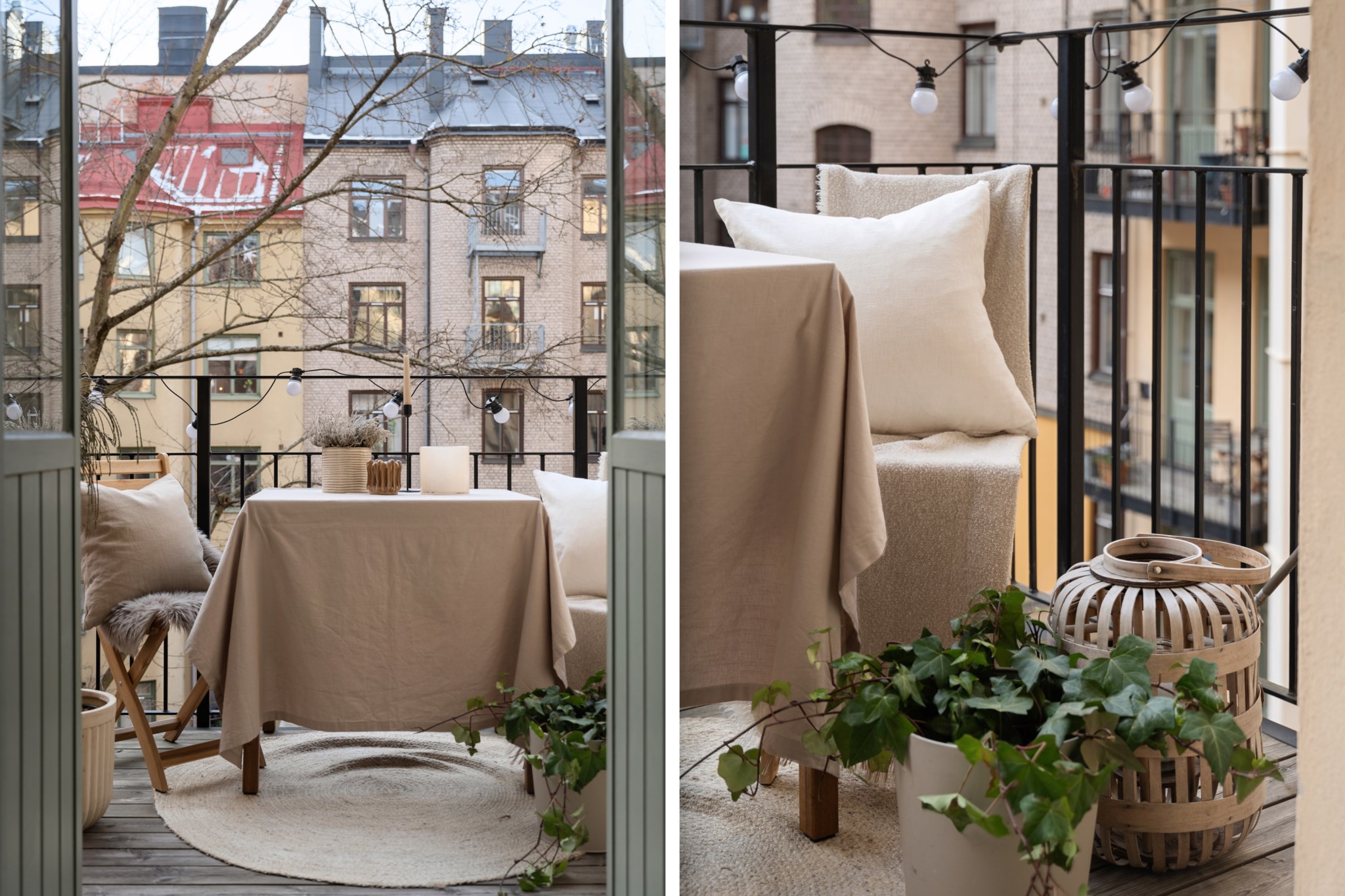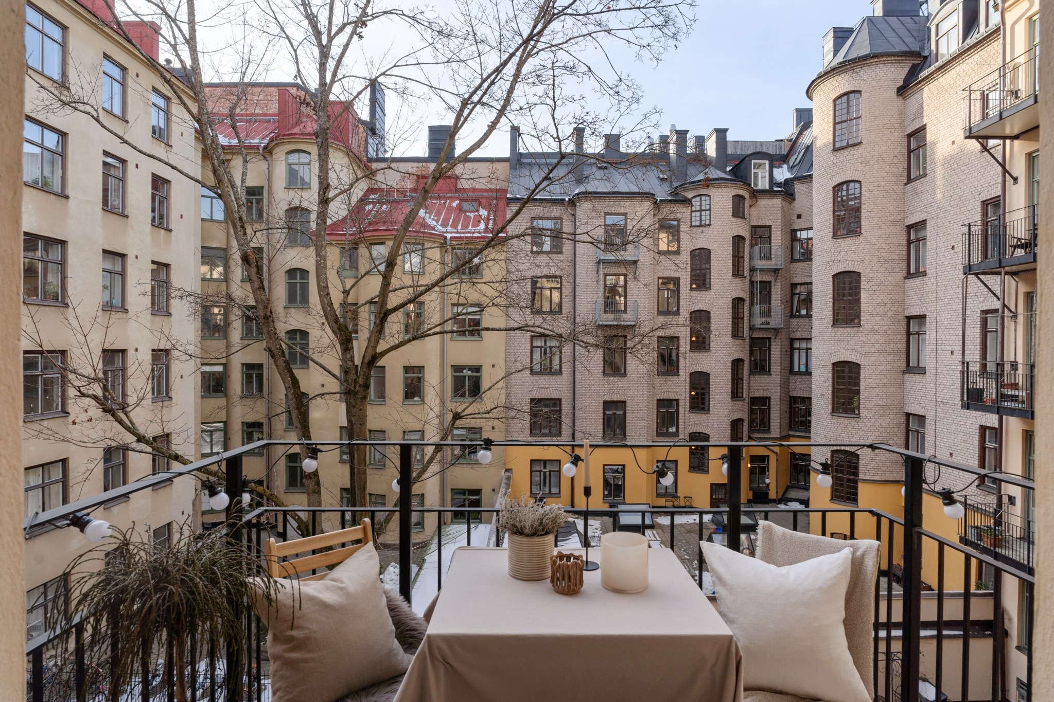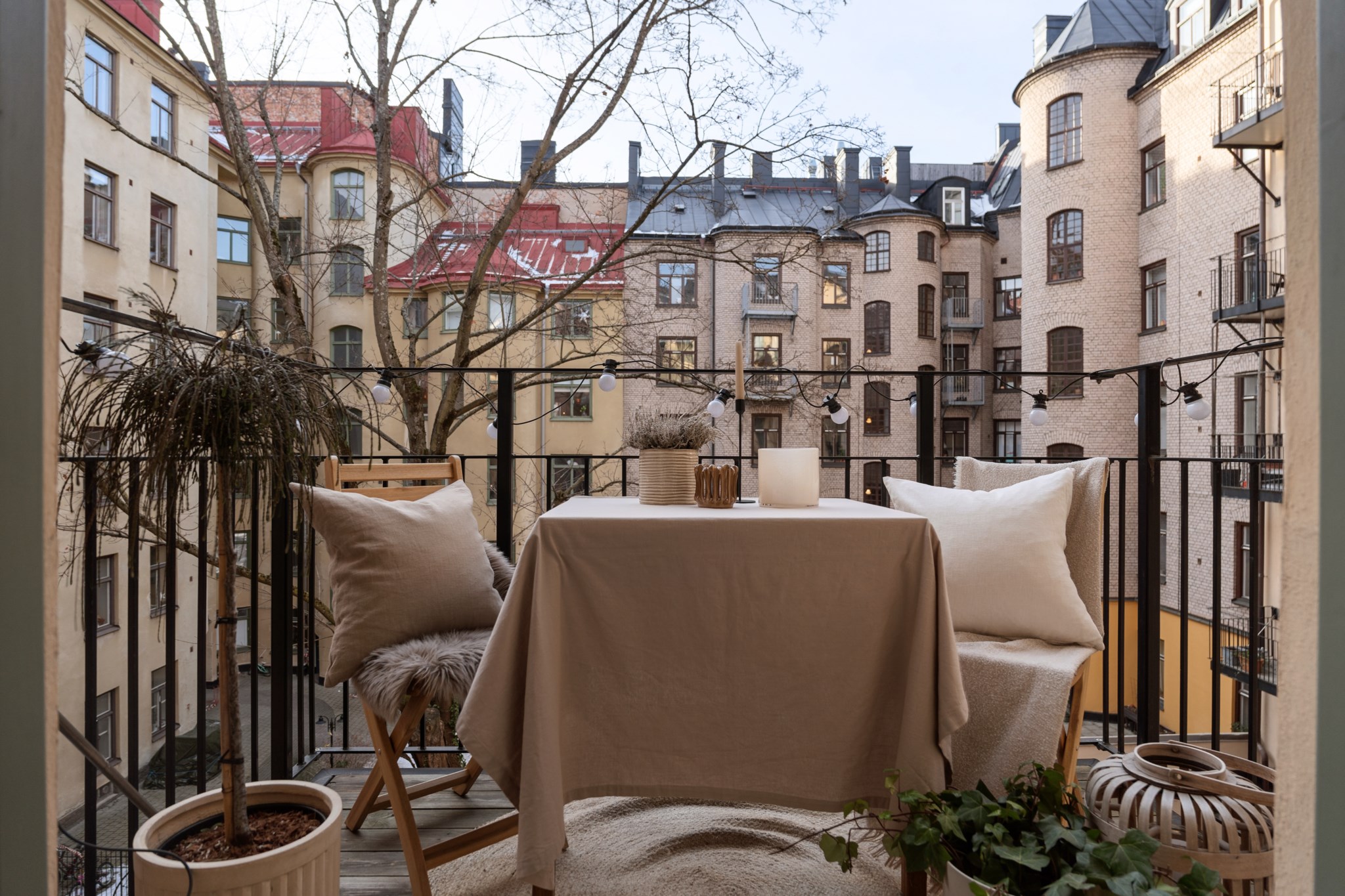 Trevlig balkong med lugnt läge mot innergård. Här finns plats för mindre sittgrupp och växter, vilket skapar en naturlig förlängning av bostaden under årets varmare månader.