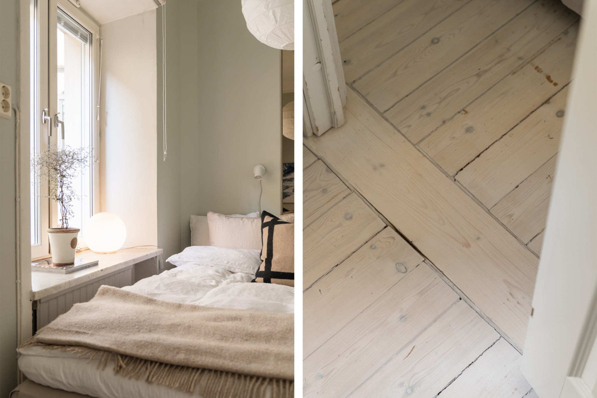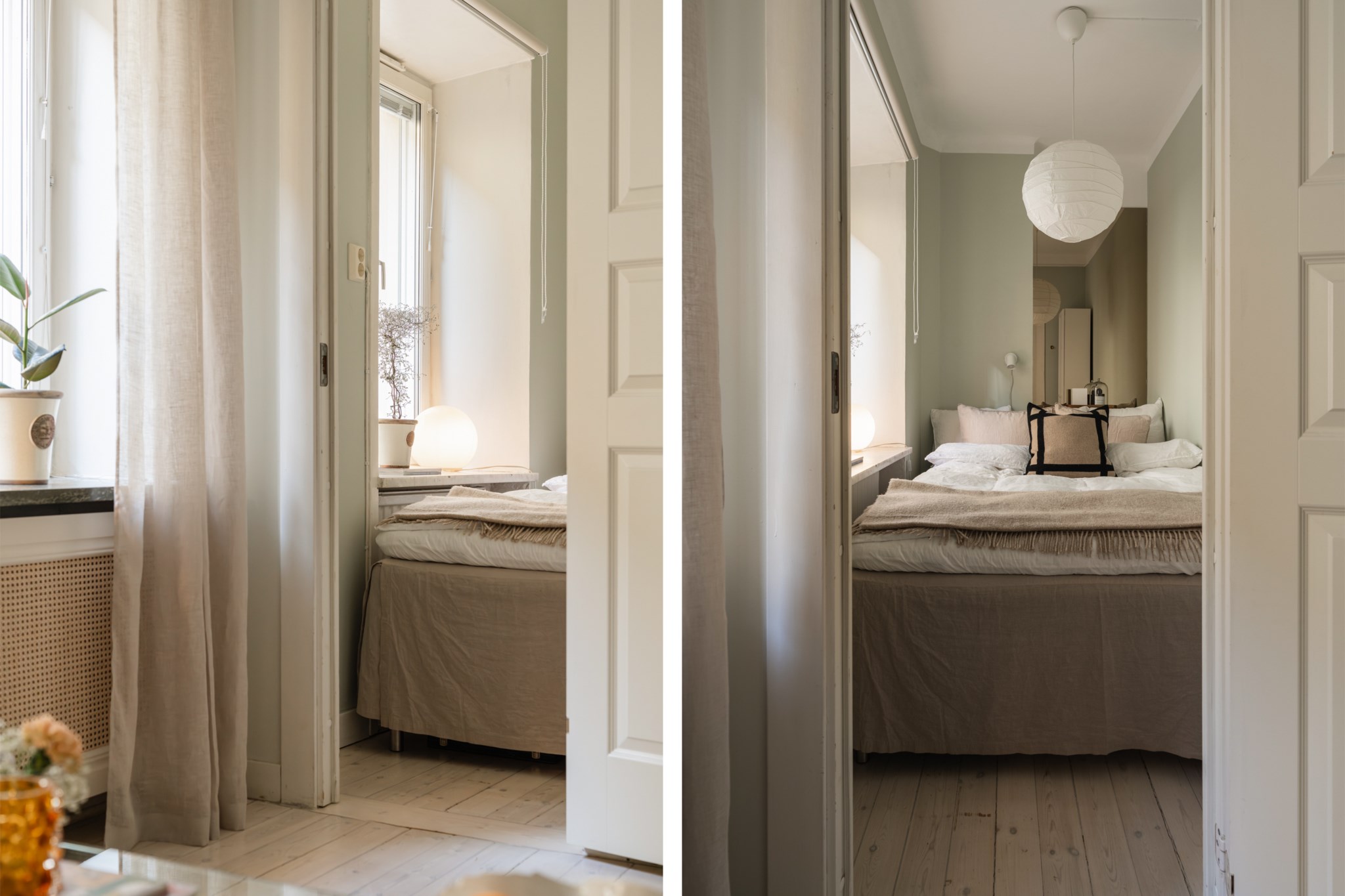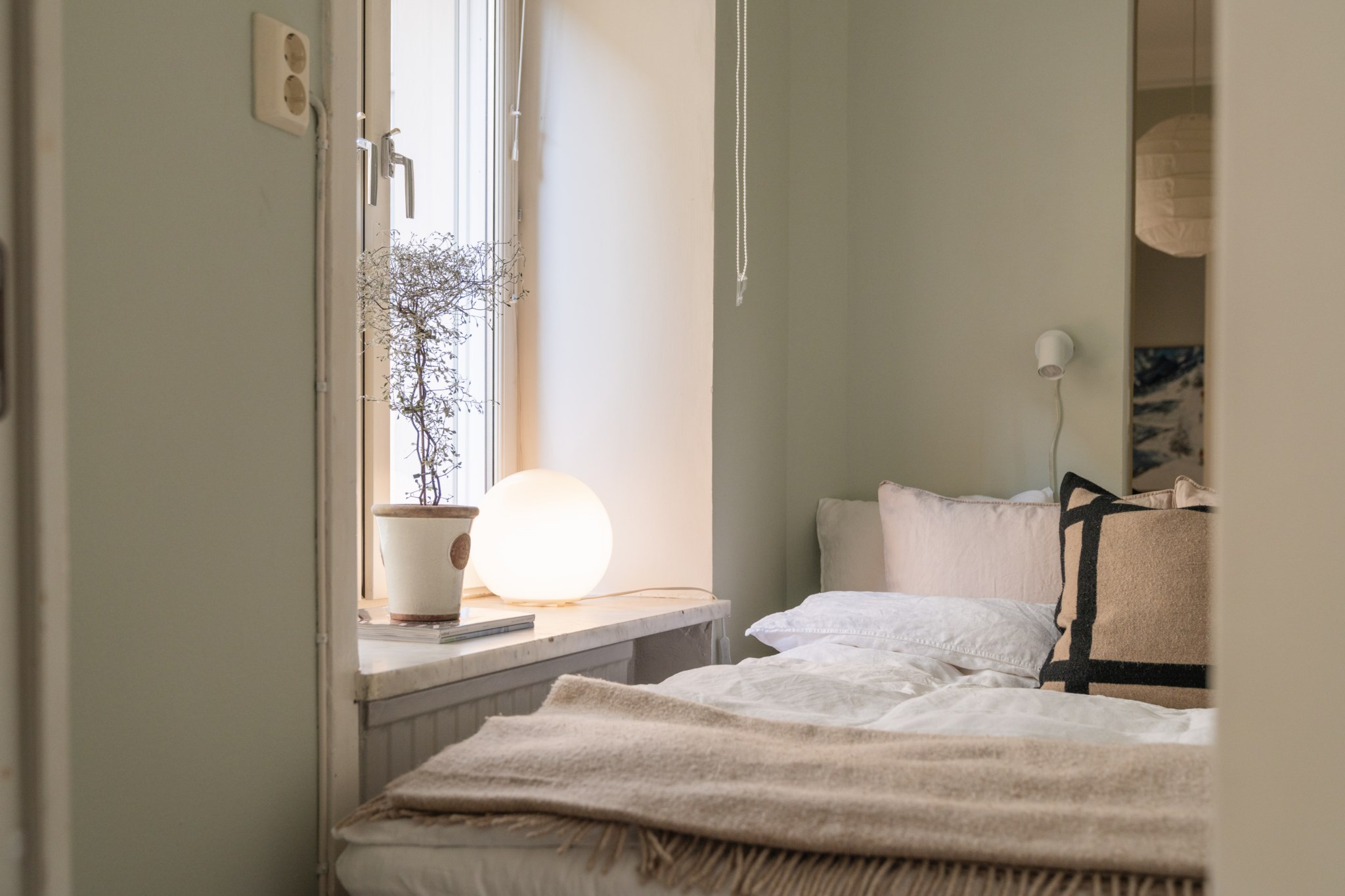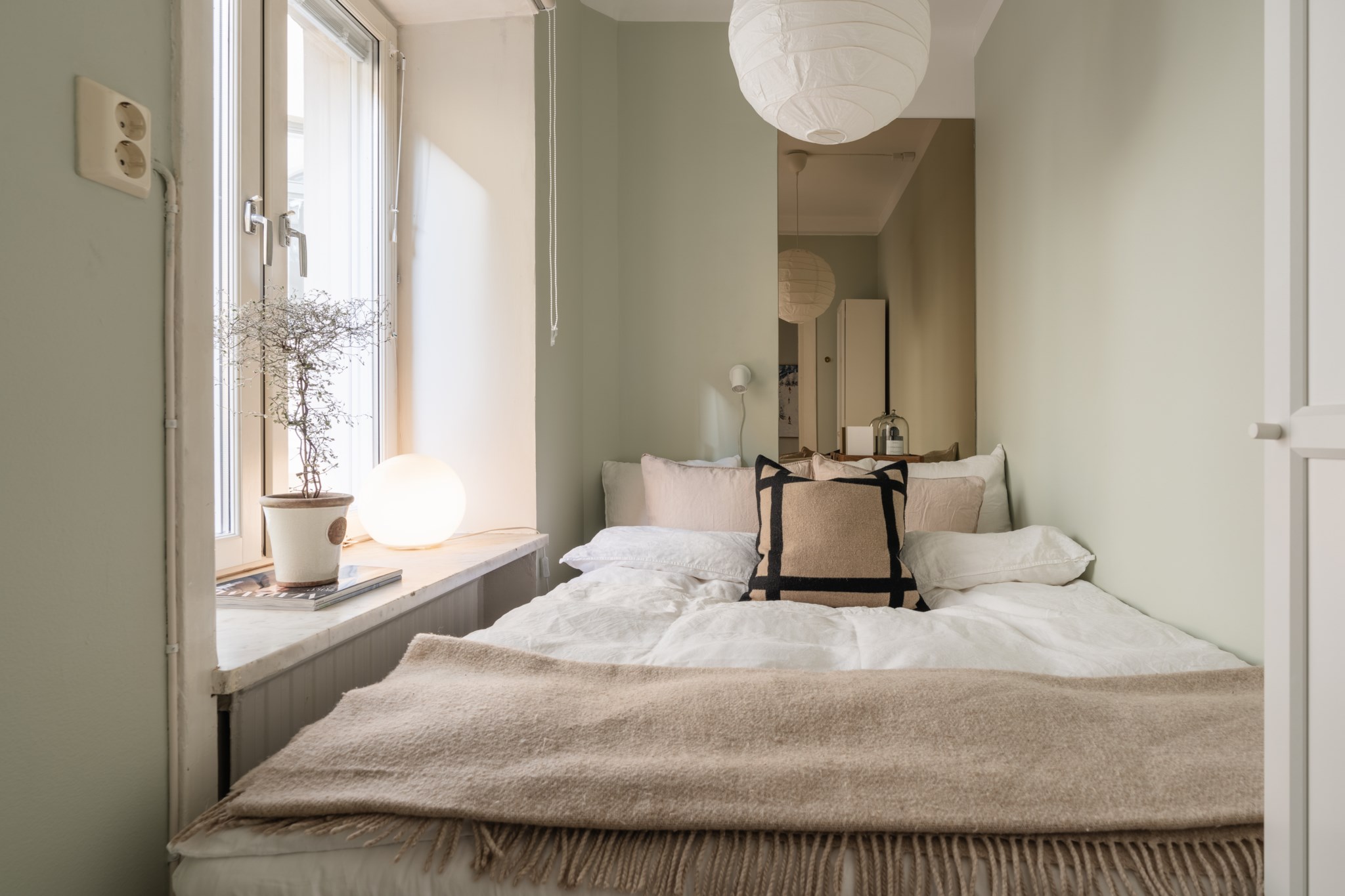 Mysigt sovrum med plats för dubbelsäng och annat möblemang efter smak och behov. Ett härligt ljusinsläpp tar sig in via fönster. Tidlösa ytskikt bestående av ljusa väggar i en grön nyans och ljust golv.