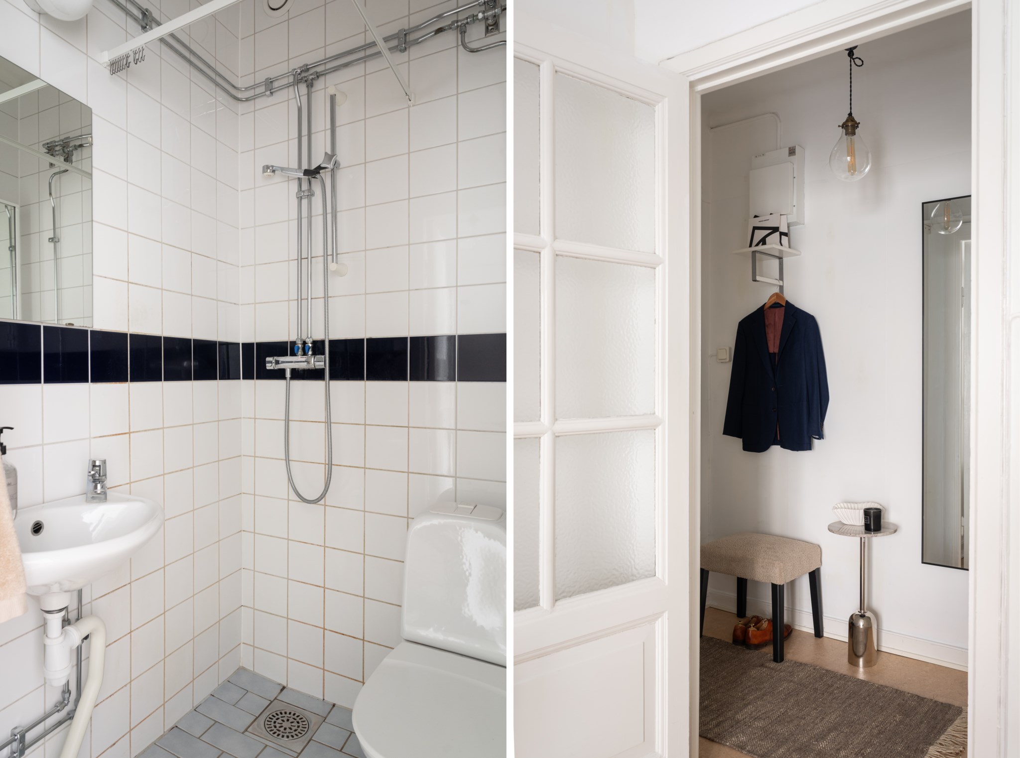 Helkaklat badrum med väl utvalda materialval. Kakel i vitt och klinker i en blå nyans. Badrummet är utrustat med WC, handfat och dusch.