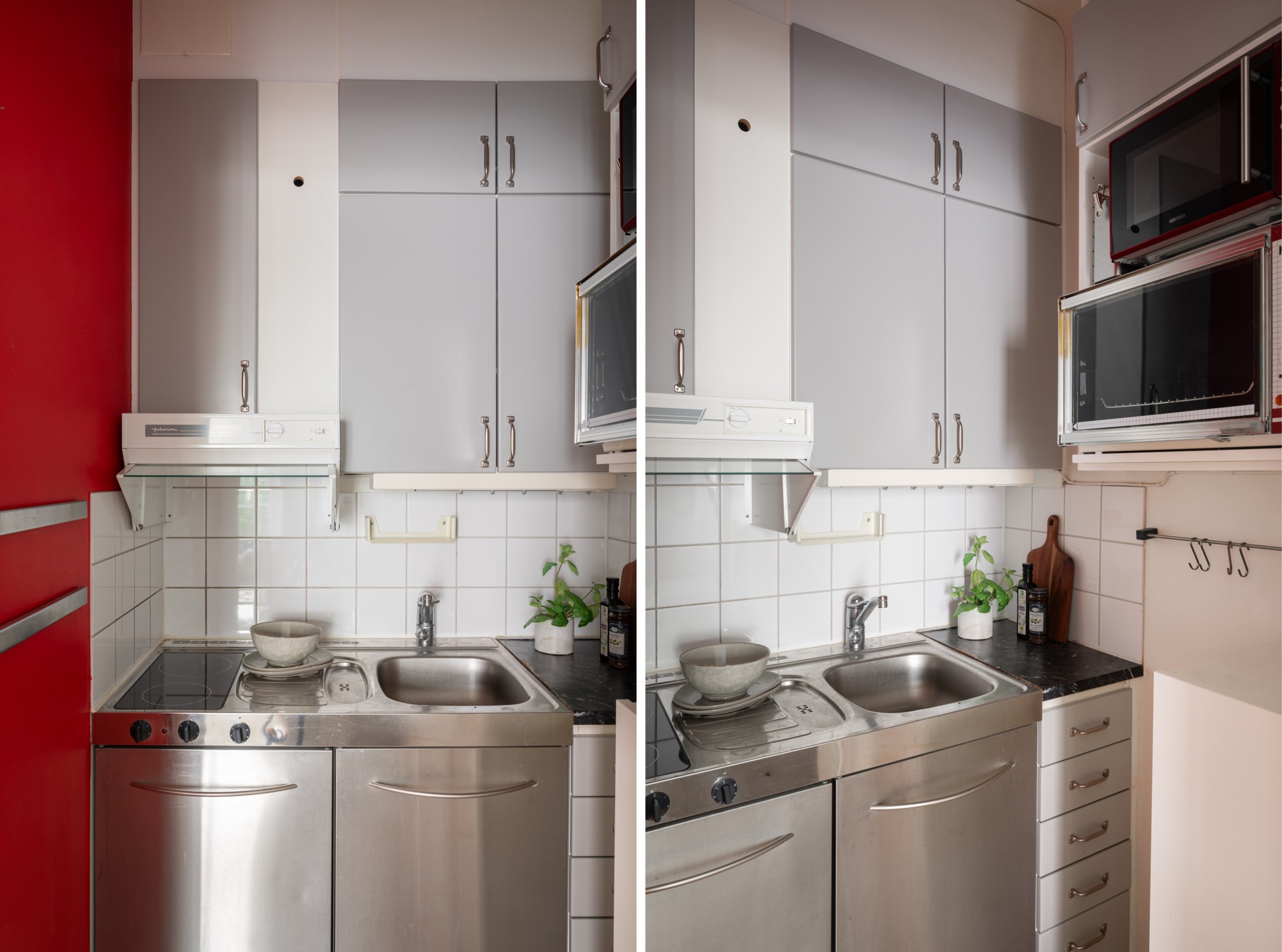 Smakfullt kök med stilrena materialval bestående av köksluckor i grå nyans samt bänkskiva med stänkskydd. Ytskikten består av väggar i en ljus och en röd nyans och plastmatta. Köket är utrustat med diskho, spis, köksfläkt, ugn samt kylskåp (med frysfack).