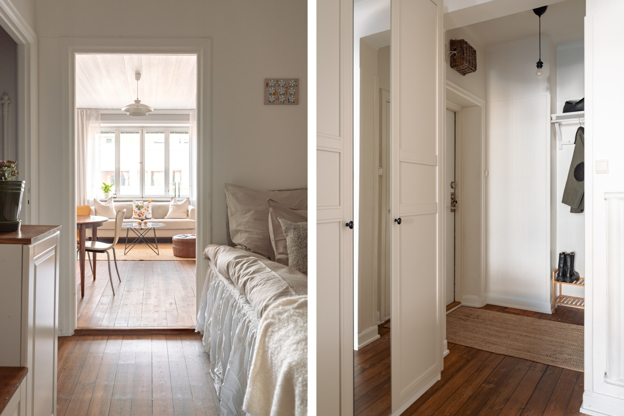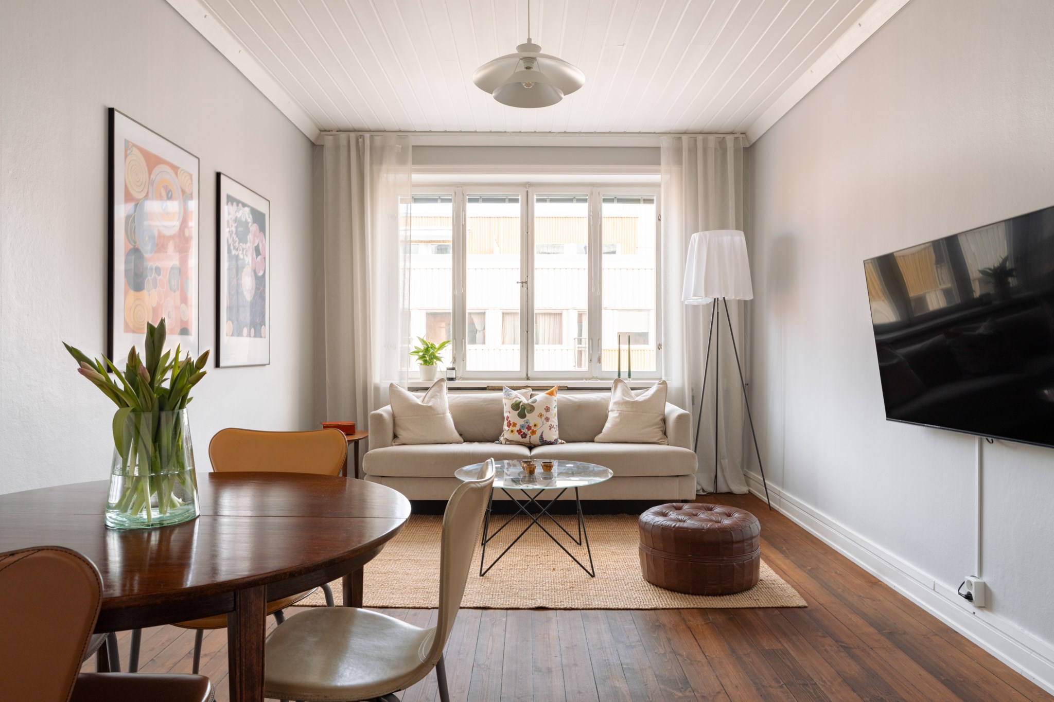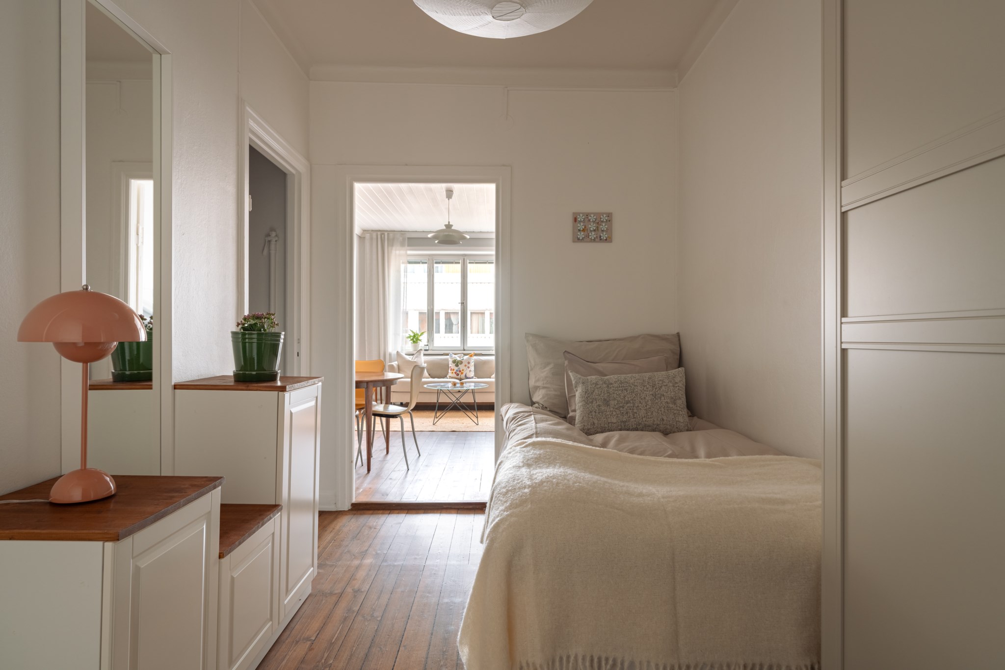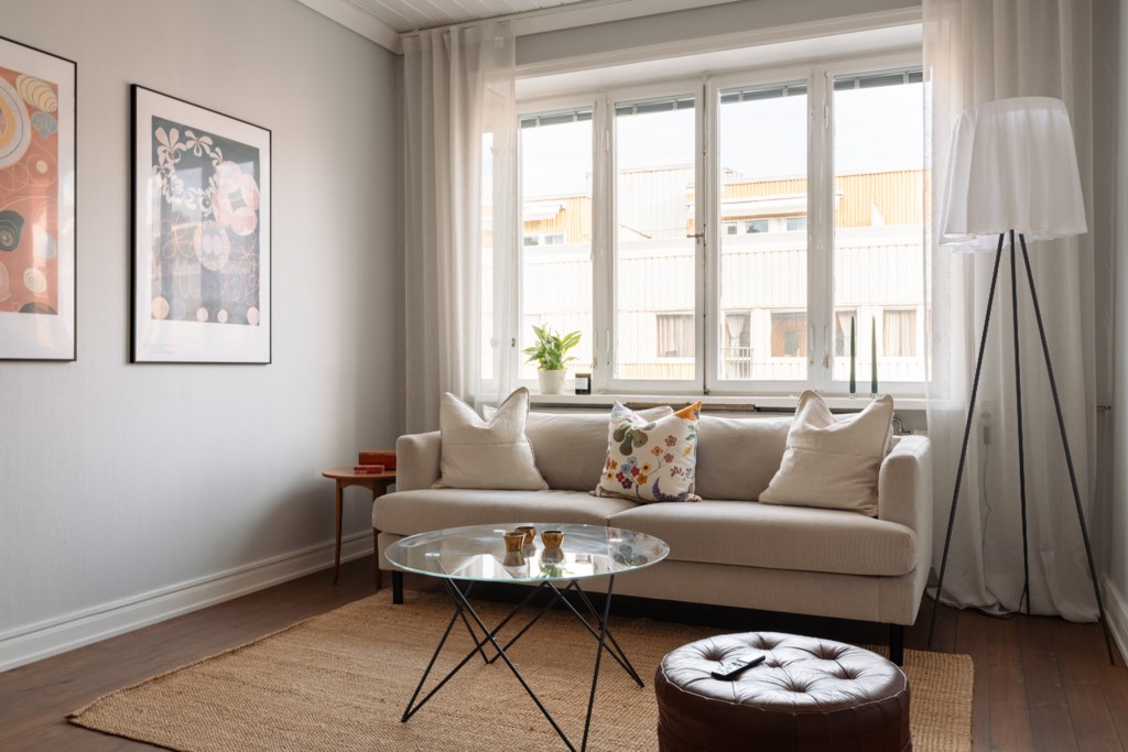 Bostaden präglas av ett fantastiskt ljusinsläpp, generös takhöjd och genomgående fina materialval. Det smakfulla köket, renoverat omkring 2020, erbjuder gott om förvaring, arbetsytor i trä och integrerade vitvaror i en stilren färgskala. Allrummet rymmer både soffgrupp och matplats och bjuder på en harmonisk atmosfär med vackra trägolv och ljusa väggar. Den avskilda sovalkoven ger plats för en större säng och skapar en naturlig uppdelning mellan sociala och privata ytor. Fräscht badrum med grått klinker, vitt kakel, dusch samt tvättmaskin. Smart hall med god förvaring.