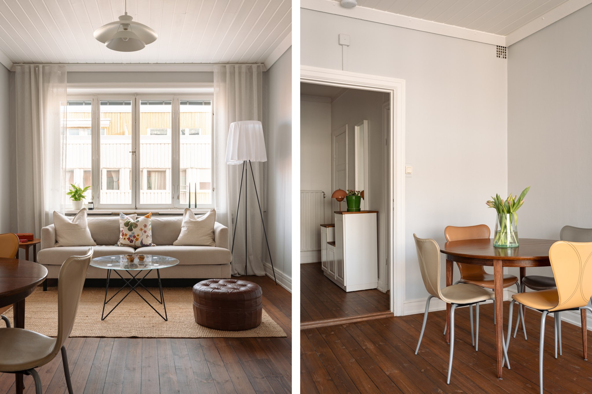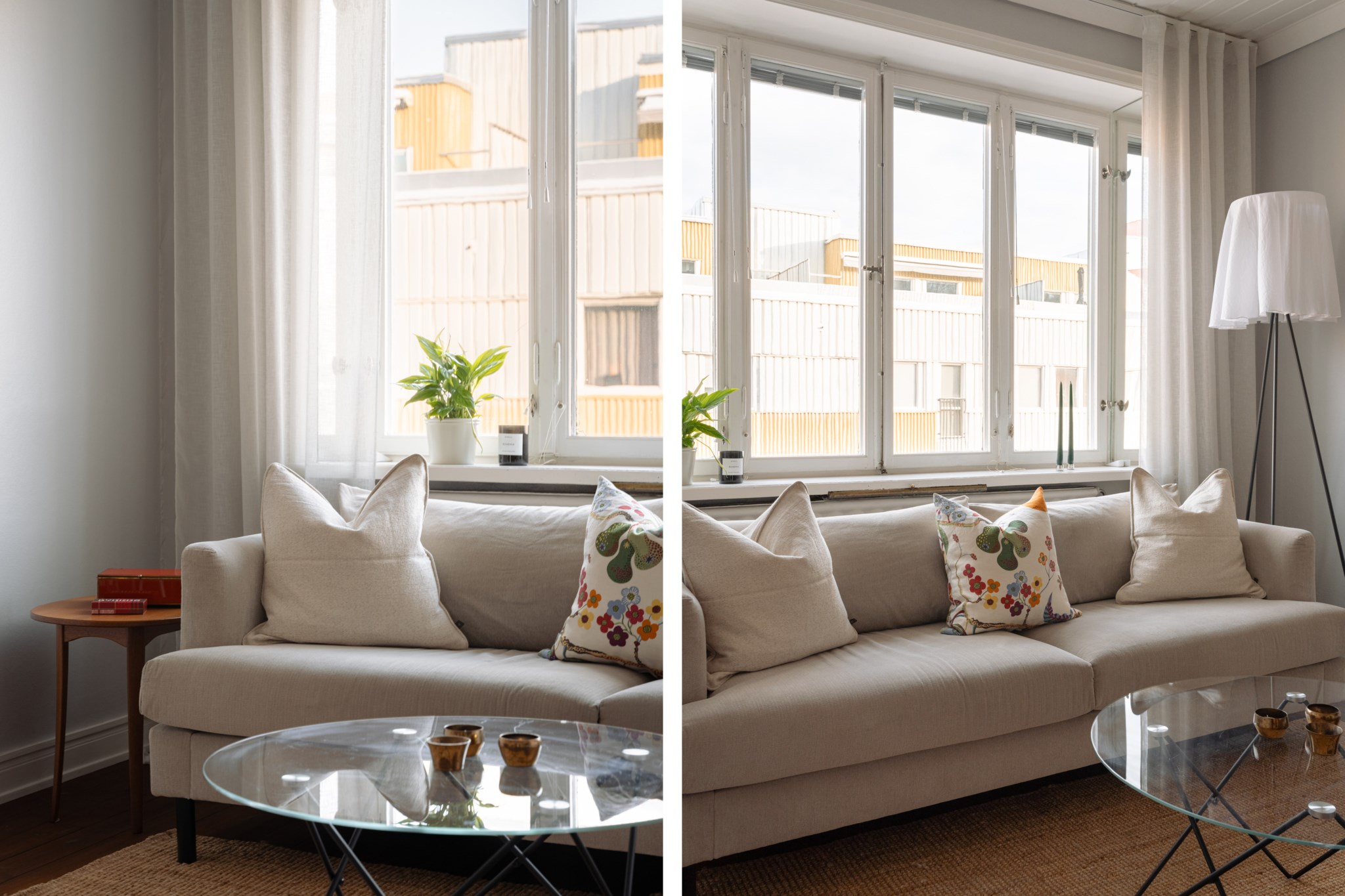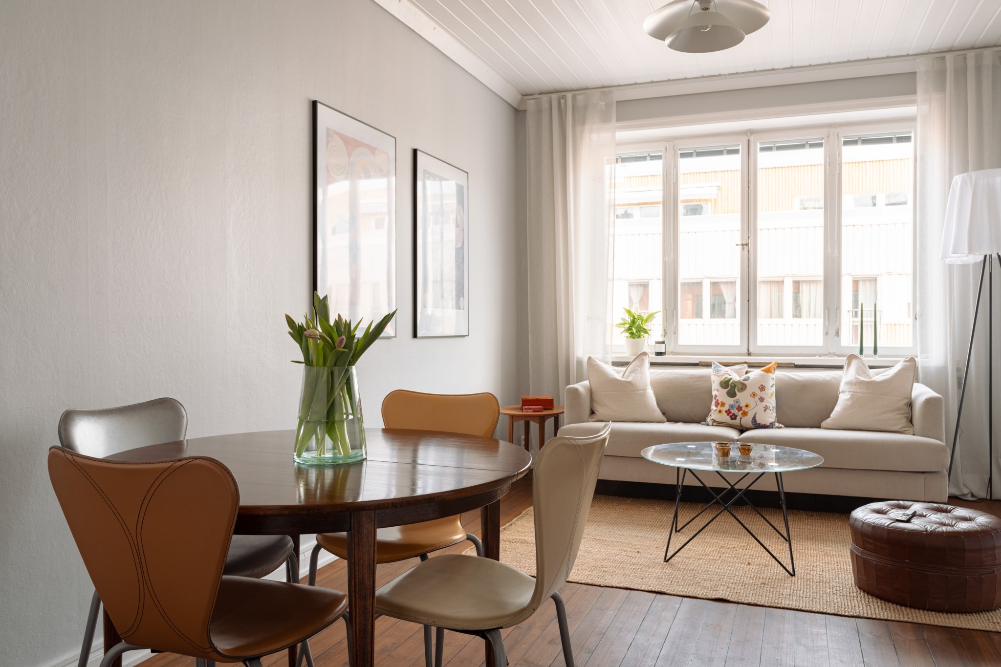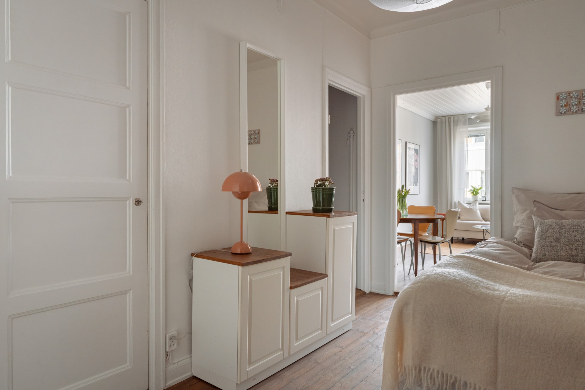 Bostaden präglas av ett fantastiskt ljusinsläpp, generös takhöjd och genomgående fina materialval. Det smakfulla köket, renoverat omkring 2020, erbjuder gott om förvaring, arbetsytor i trä och integrerade vitvaror i en stilren färgskala. Allrummet rymmer både soffgrupp och matplats och bjuder på en harmonisk atmosfär med vackra trägolv och ljusa väggar. Den avskilda sovalkoven ger plats för en större säng och skapar en naturlig uppdelning mellan sociala och privata ytor. Fräscht badrum med grått klinker, vitt kakel, dusch samt tvättmaskin. Smart hall med god förvaring.