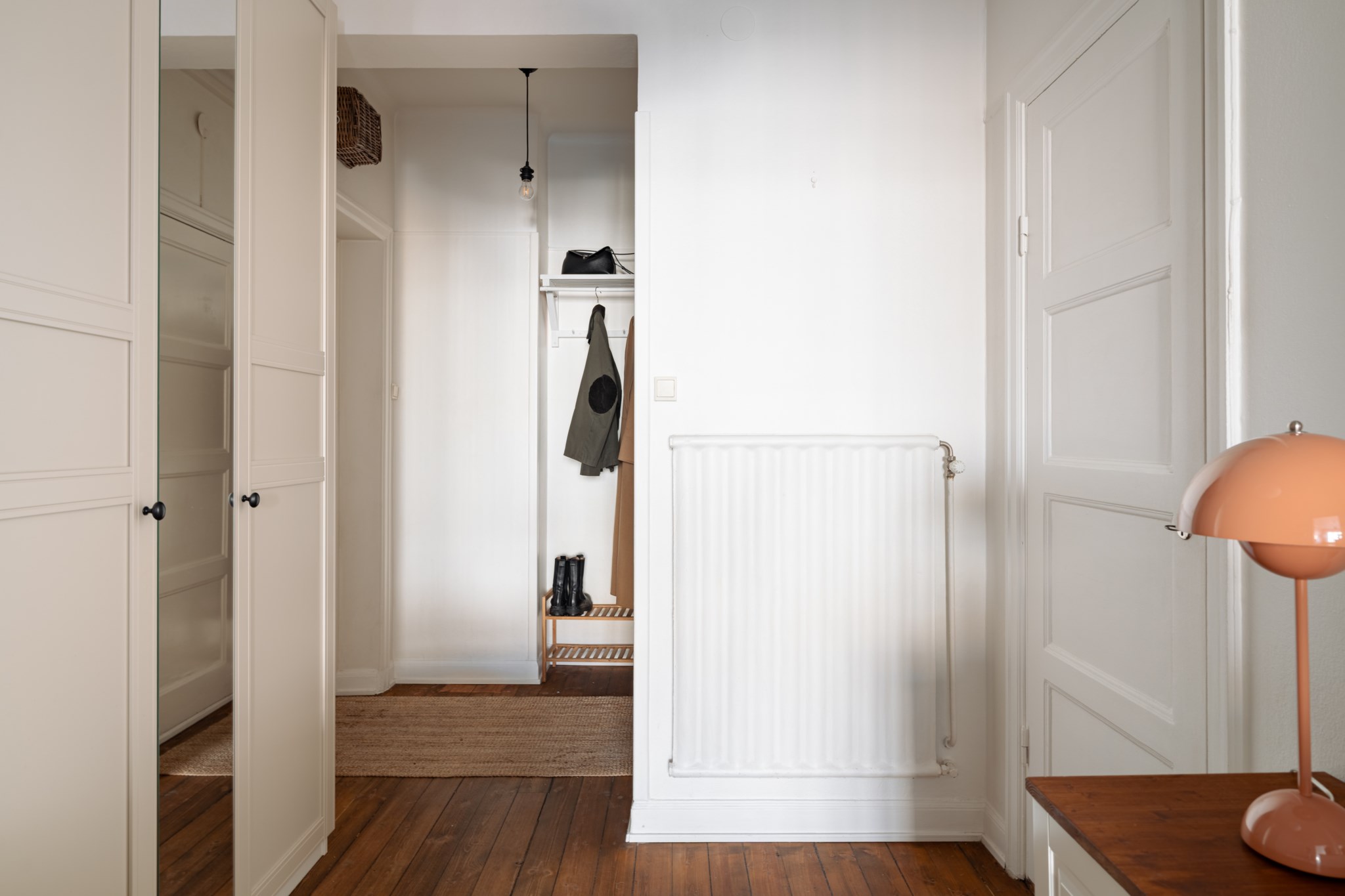 Välkomnande hall med plats för avhängning, skoställ samt mindre avlastningsmöblemang efter smak och behov. Gott om plats för förvaring via intilliggande garderober. Tidlösa ytskikt bestående av ljusa väggar och mörkt golv.