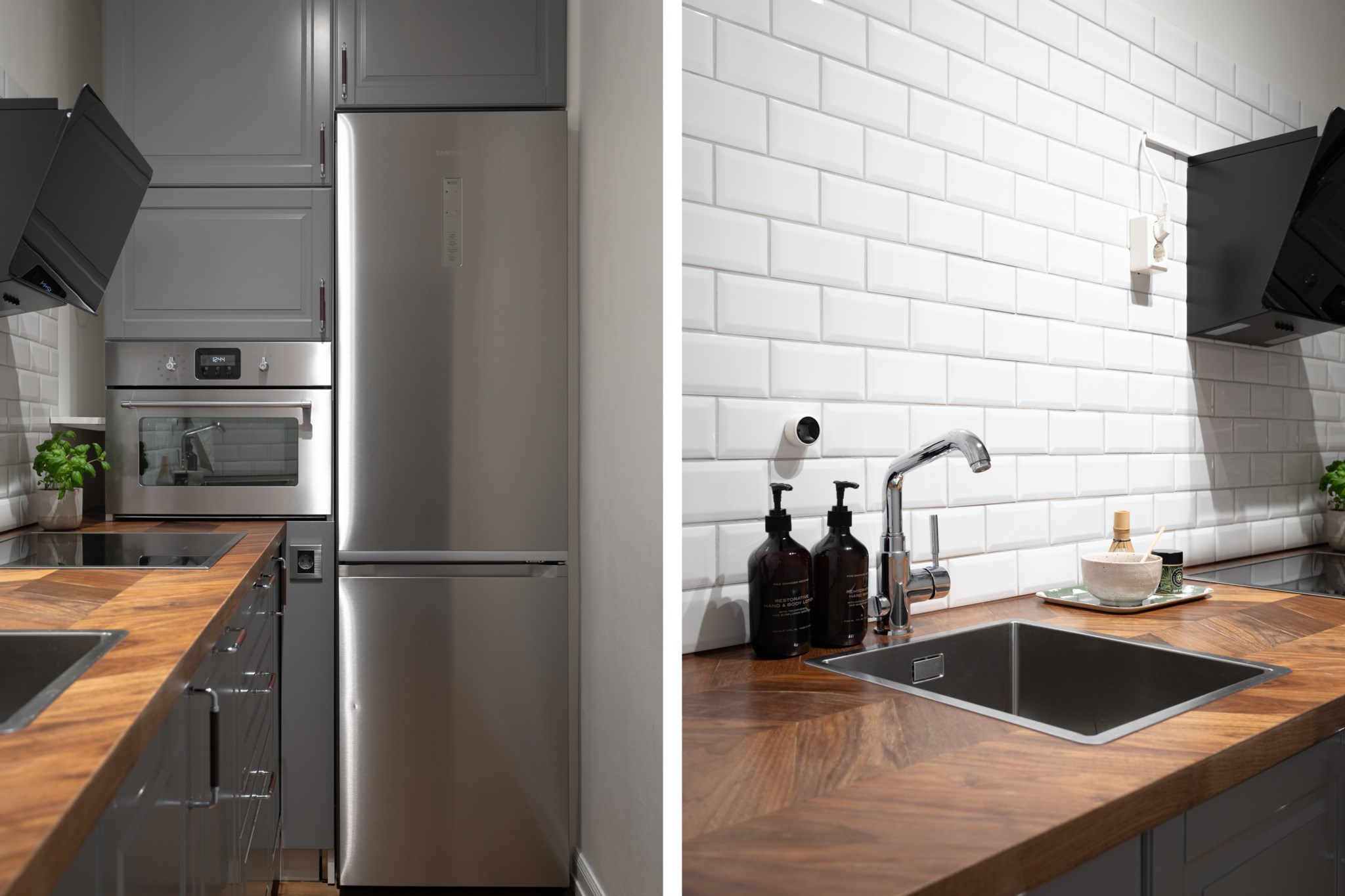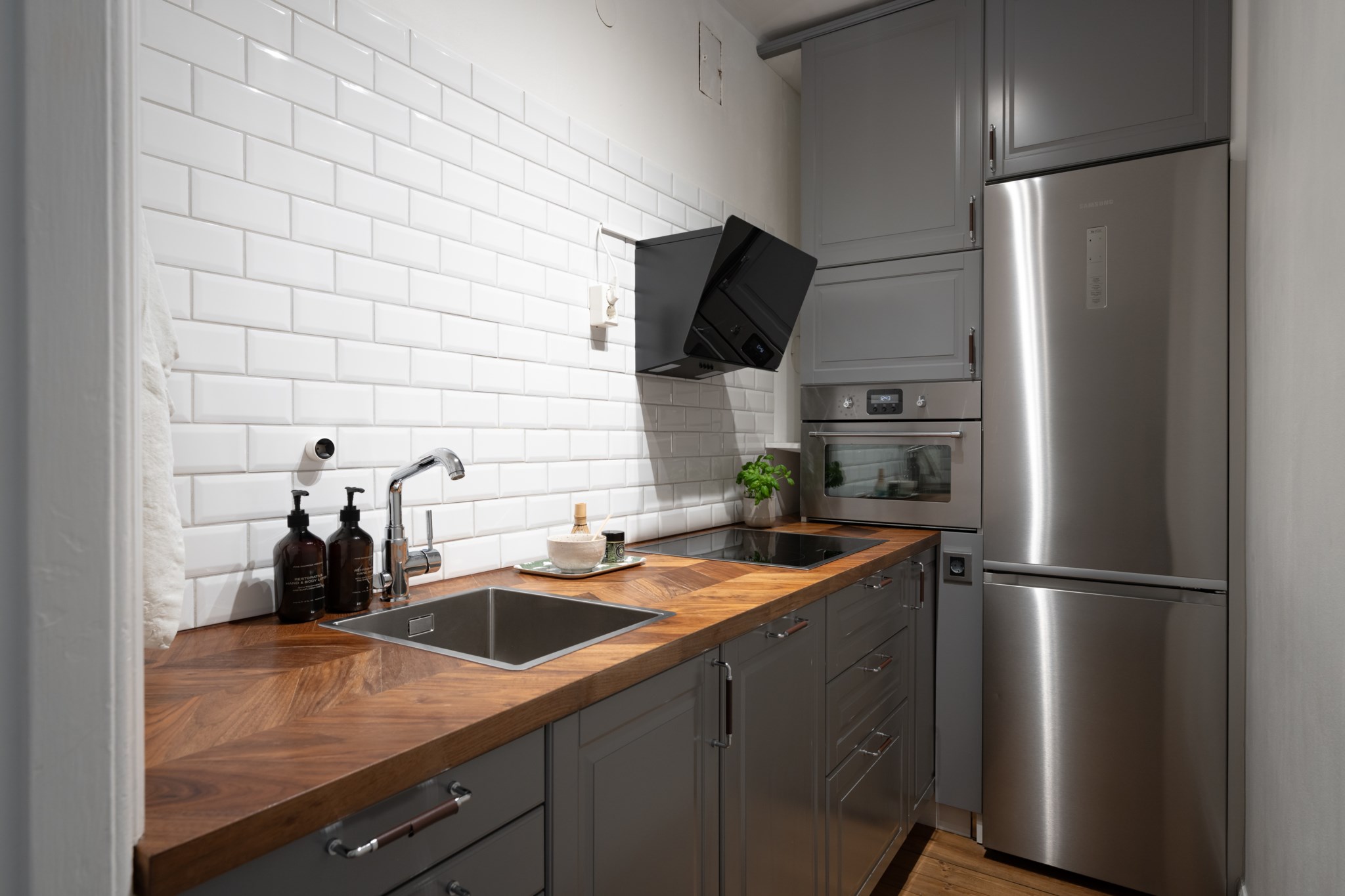 Modernt kök med smakfulla materialval bestående av mörka köksluckor och bänkskiva i trä med stänkskydd ovan i vitt. Den maskinella utrustningen består av diskho,induktionshäll, kombinerad ugn/micro, köksfläkt, diskmaskin samt kyl och frys. Tidlösa ytskikt bestående av ljusa väggar och mörkt golv.